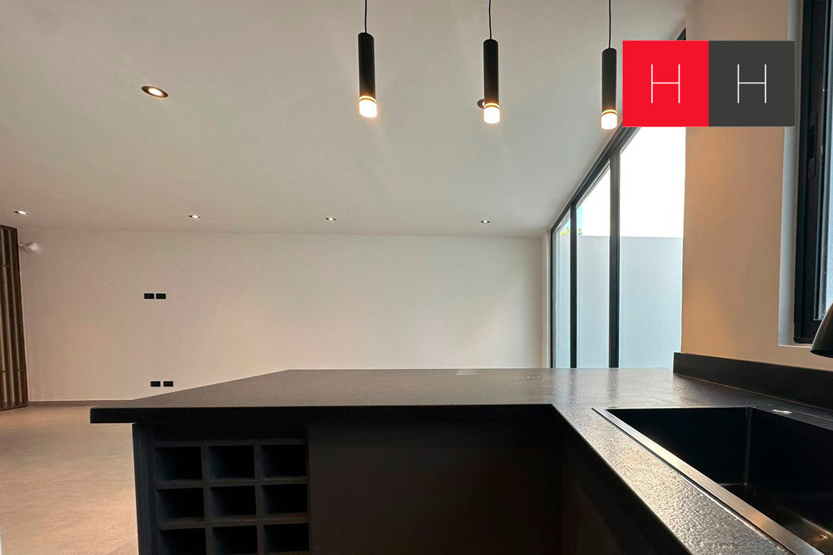 On the ground floor, it has a semi-covered garage for 2 cars, a living-dining room, a guest bathroom, and an open kitchen with a granite bar and garden.