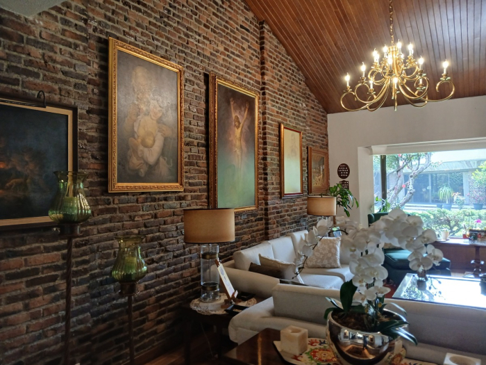 La casa cuenta con dos plantas: la primera con sala donde hay un bar y cava. Comedor con vista a una fuente, cocina con una alacena grande, antecomedor y amplio jardín,