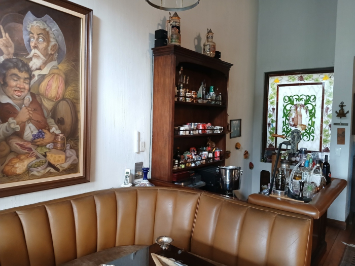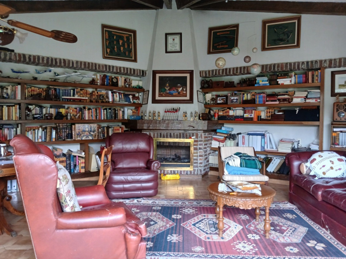 The house has two floors: the first with a living room that has a bar and wine cellar. Dining room with a view of a fountain, kitchen with a large pantry, breakfast area, and spacious garden.