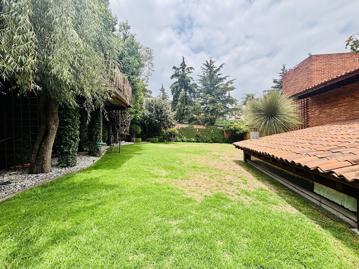 Sup. terreno: 918 M2. Sup. Const. 760 M2. Jardín y gran terraza con área de asador de aproximadamente 400 M2. Construida en 2 niveles. Consta de gran hall de recepción, amplia sala y comedor con salida a jardín, medio baño de visitas, cocina equipada muy iluminada, pantry, despensa y área de antecomedor con salida a terraza. En el segundo nivel, family room, 3 amplias recamaras, la principal de gran tamaño con vestidor, baño completo y vista al jardín, la segunda con vestidor, vestidor y baño completo con tina y vista arbolada, la tercera con closet de muro a muro, baño completo y vista al jardín.