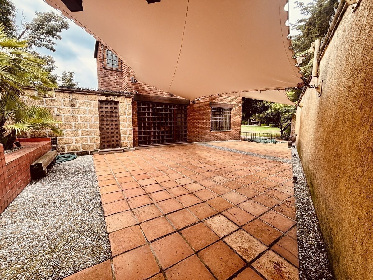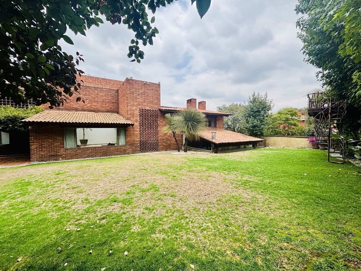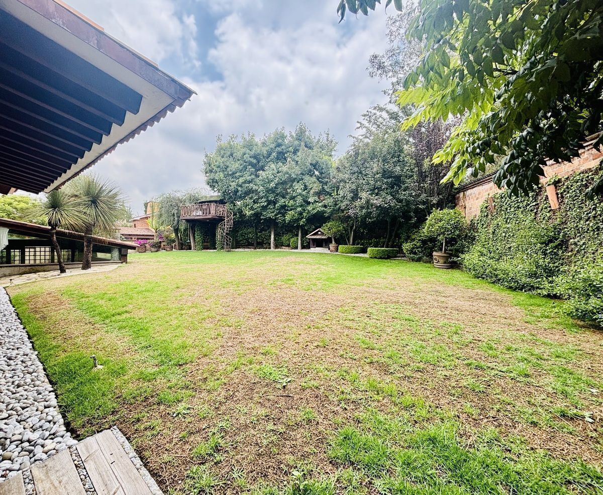 Sup. terreno: 918 M2. Sup. Const. 760 M2. Jardín y gran terraza con área de asador de aproximadamente 400 M2. Construida en 2 niveles. Consta de gran hall de recepción, amplia sala y comedor con salida a jardín, medio baño de visitas, cocina equipada muy iluminada, pantry, despensa y área de antecomedor con salida a terraza. En el segundo nivel, family room, 3 amplias recamaras, la principal de gran tamaño con vestidor, baño completo y vista al jardín, la segunda con vestidor, vestidor y baño completo con tina y vista arbolada, la tercera con closet de muro a muro, baño completo y vista al jardín.