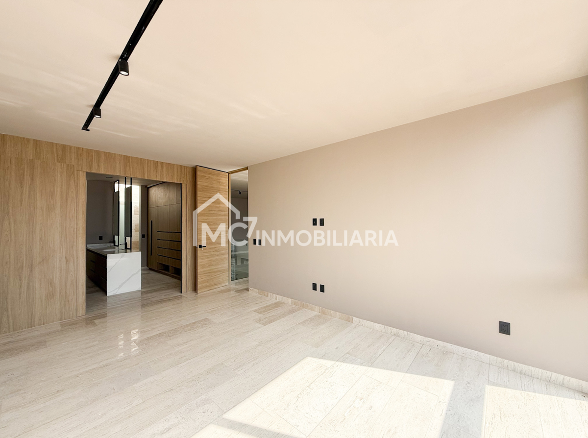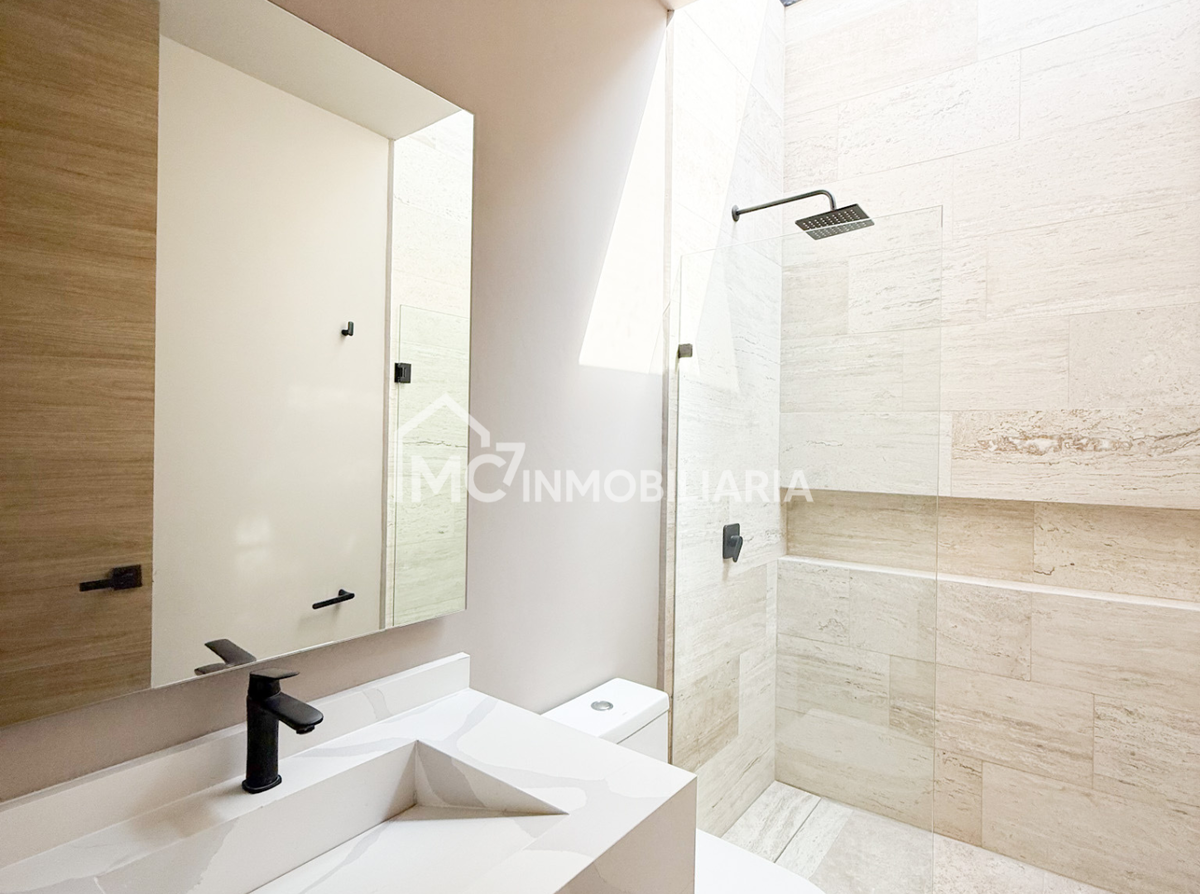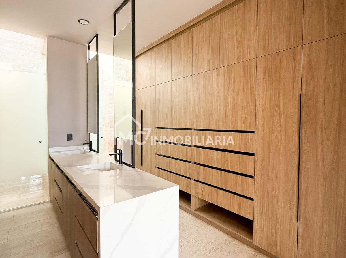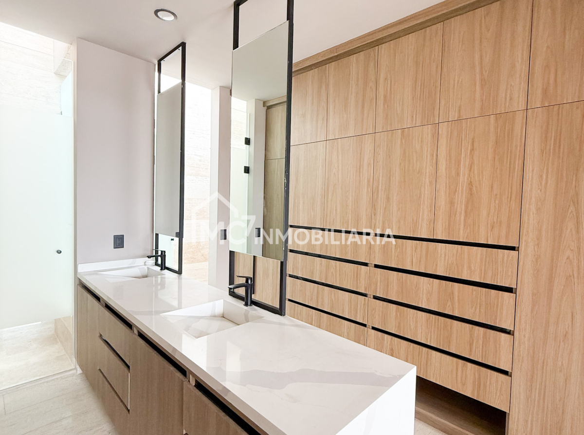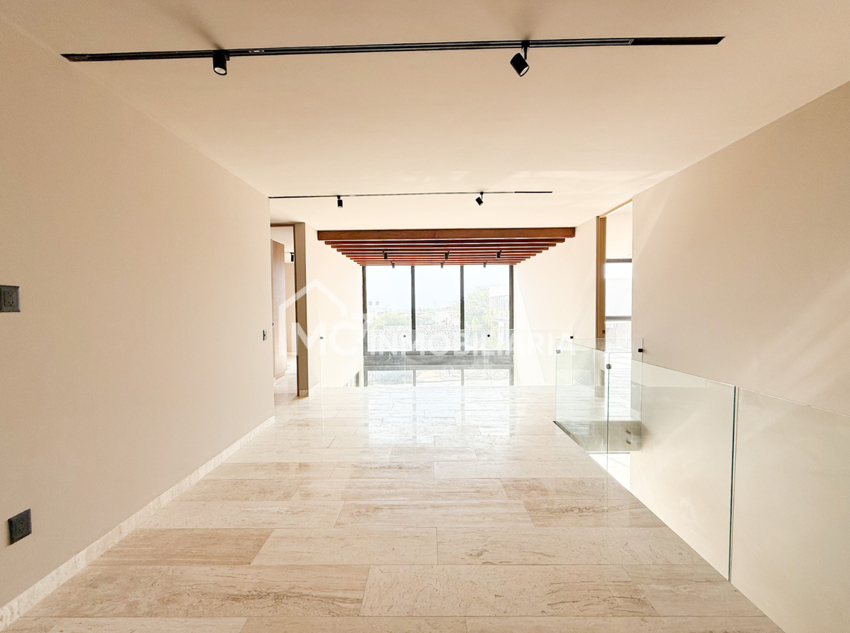 En planta alta, esta misma doble altura conecta un amplio family room con sus tres recámaras, cada una con baño completo.