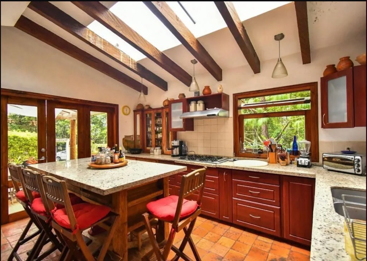 La cocina se encuentra equipada y cuenta también con un desayunador, mientras que el espacio de sala-comedor es muy amplio e iluminado, gracias a los ventanales que dan hacia la terraza y el jardín.
