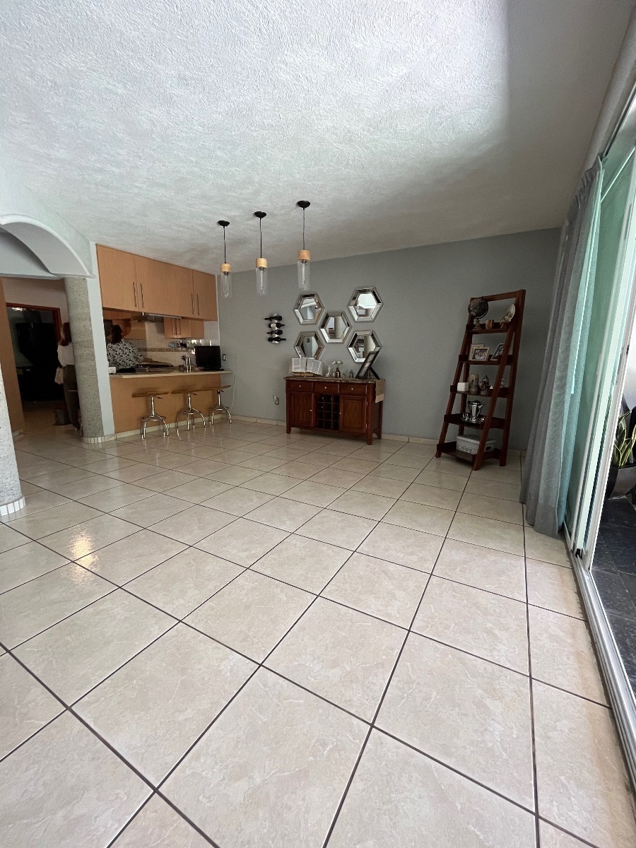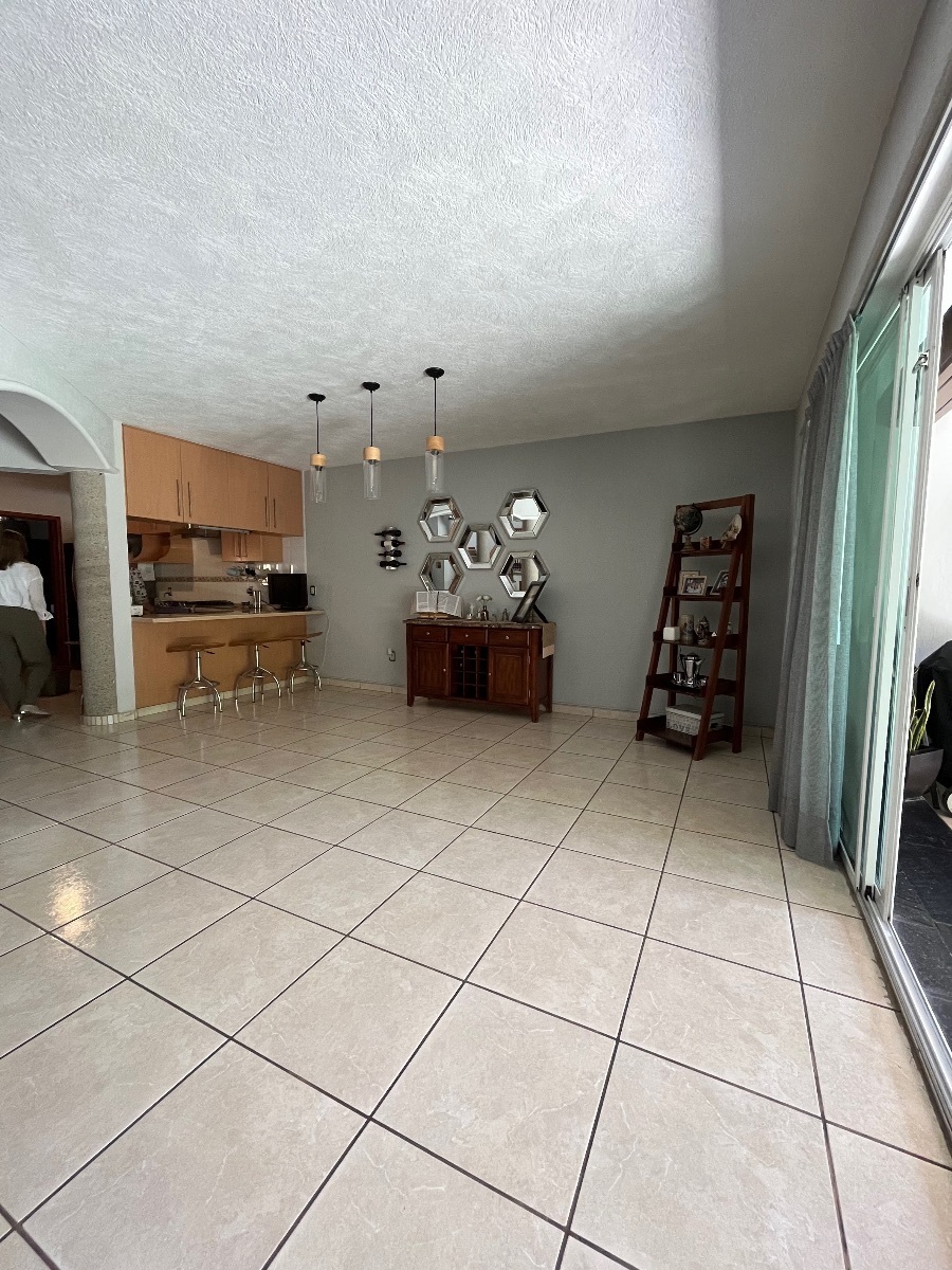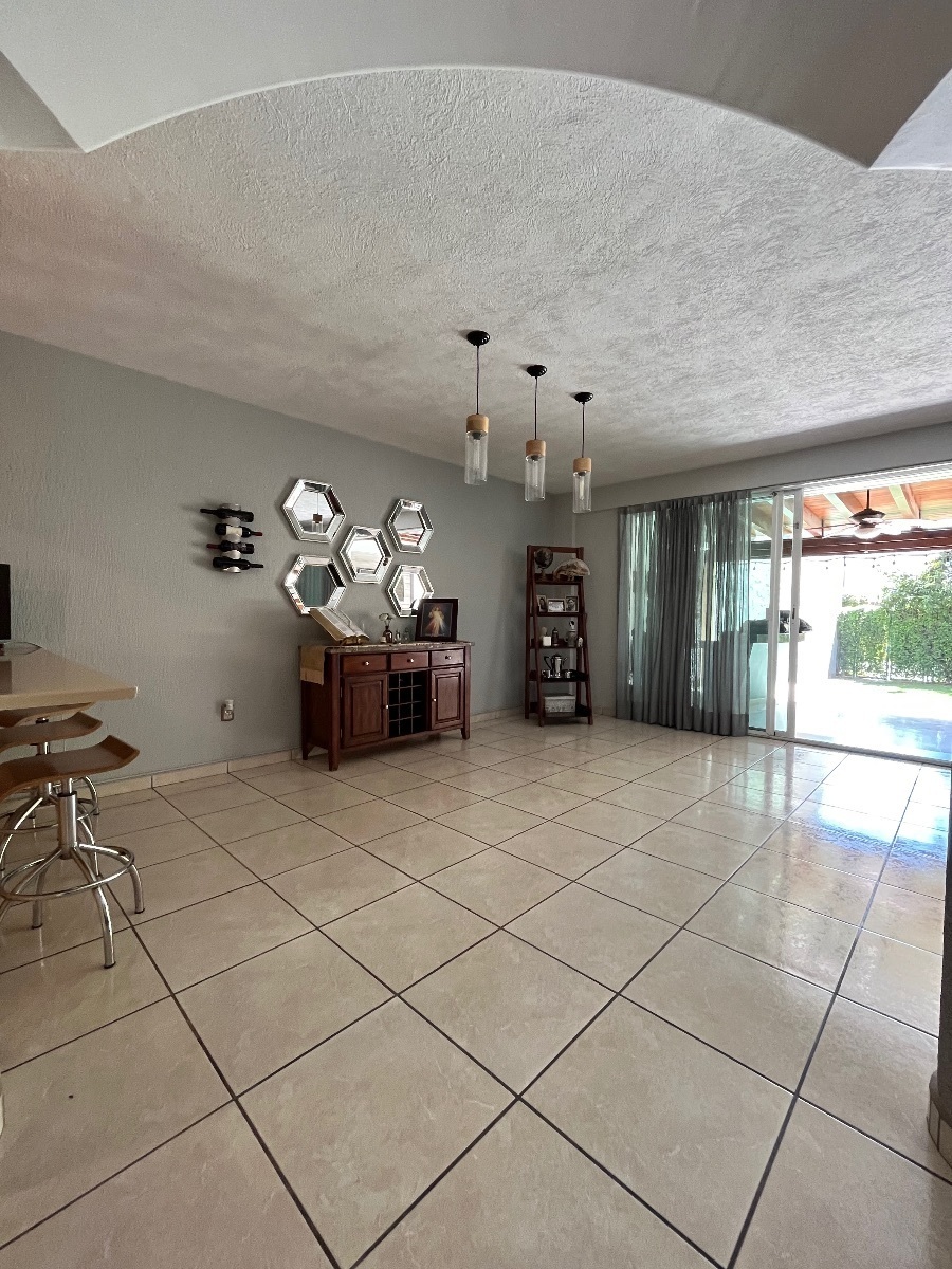 La sala-comedor cuenta con un ventanal de piso a techo que brinda una excelente iluminación y una agradable vista a la terraza con barra y al amplio jardín, perfecto para convivencias y momentos especiales en familia y con amigos.
