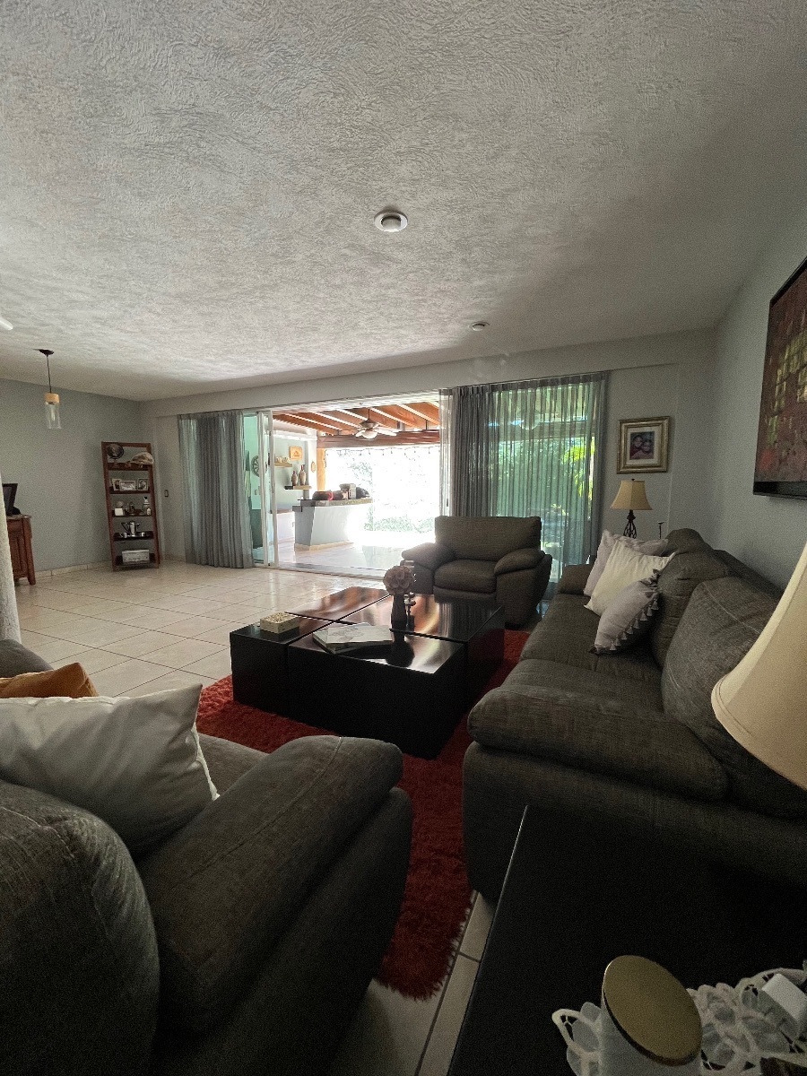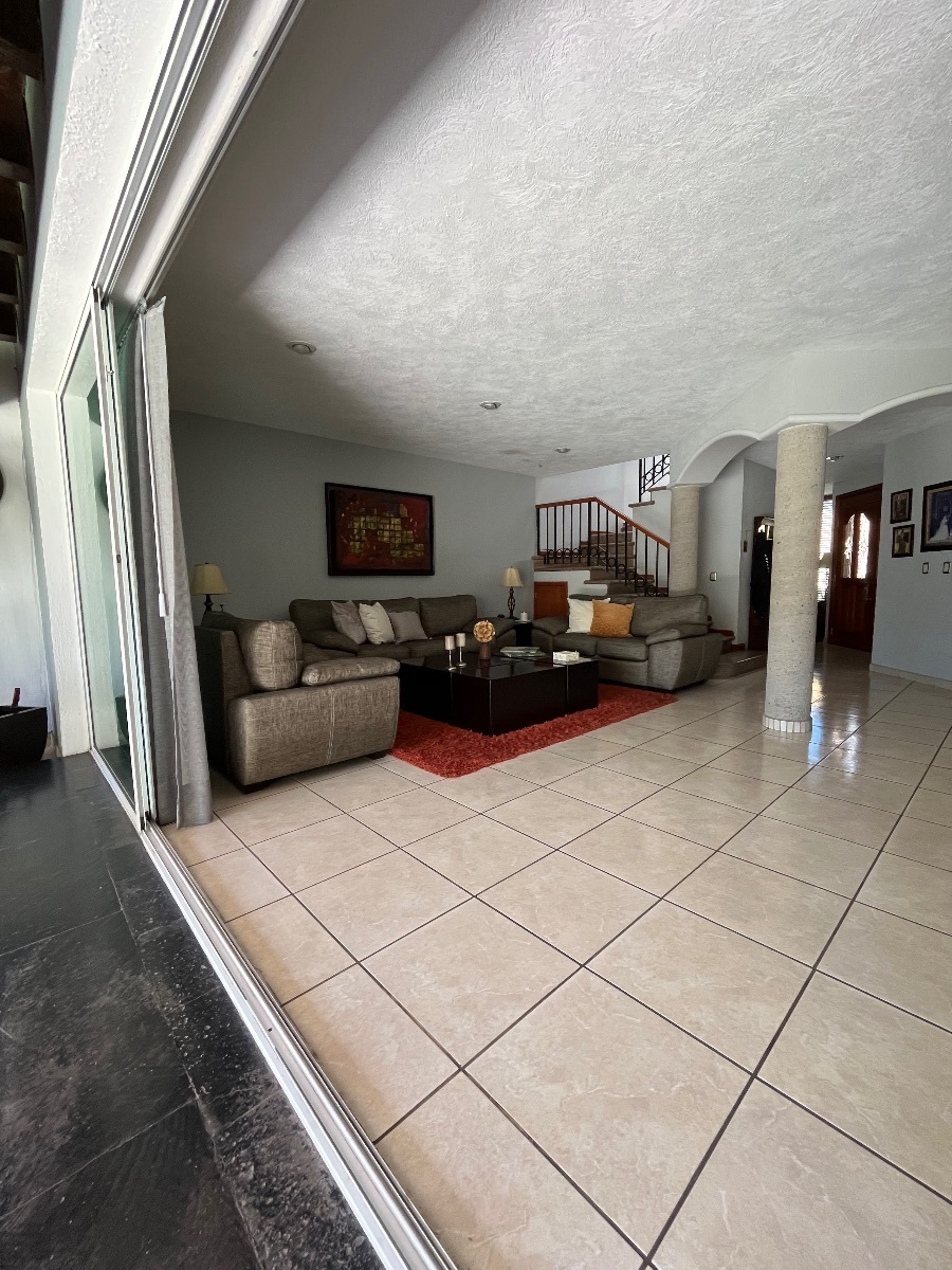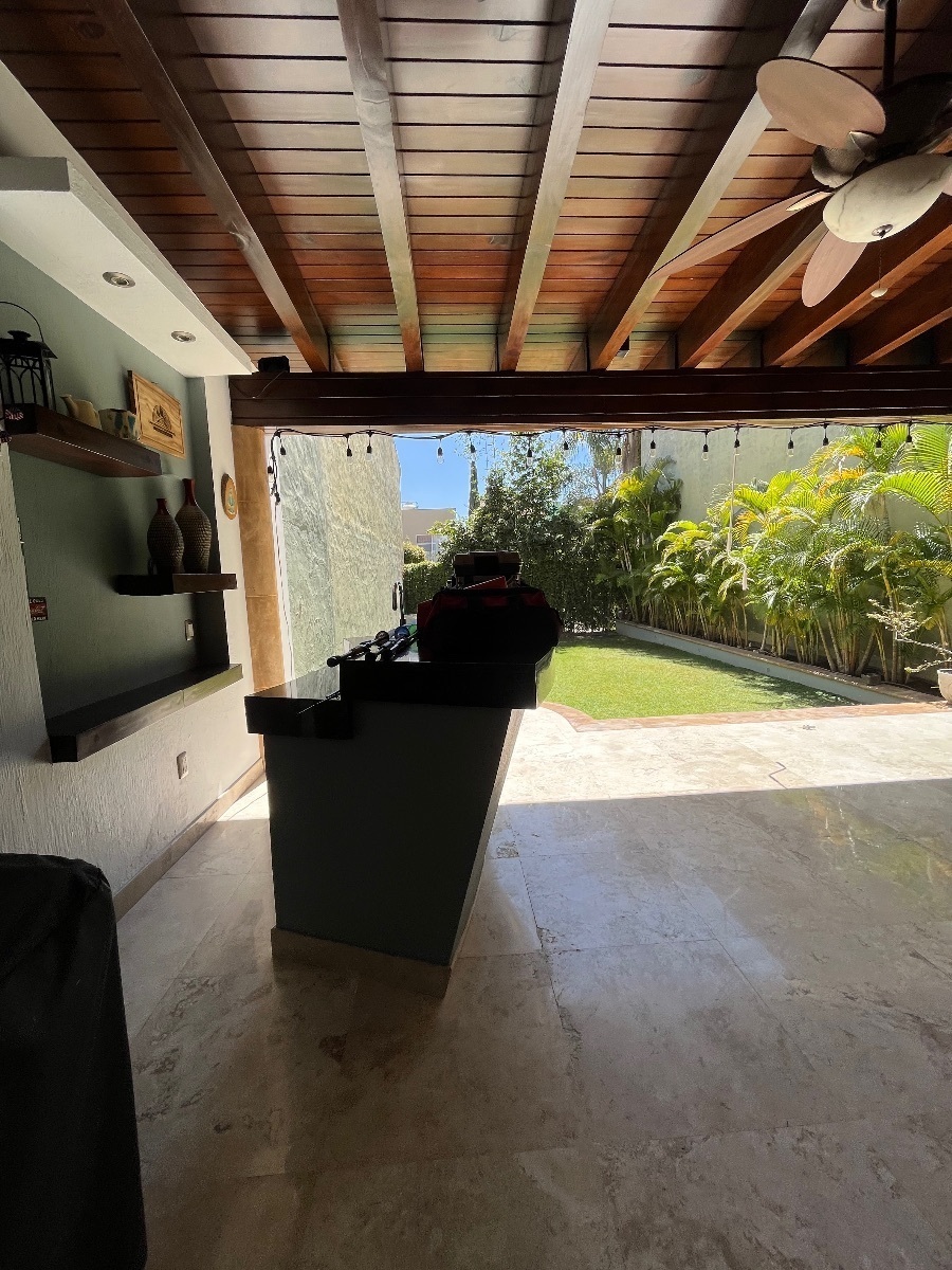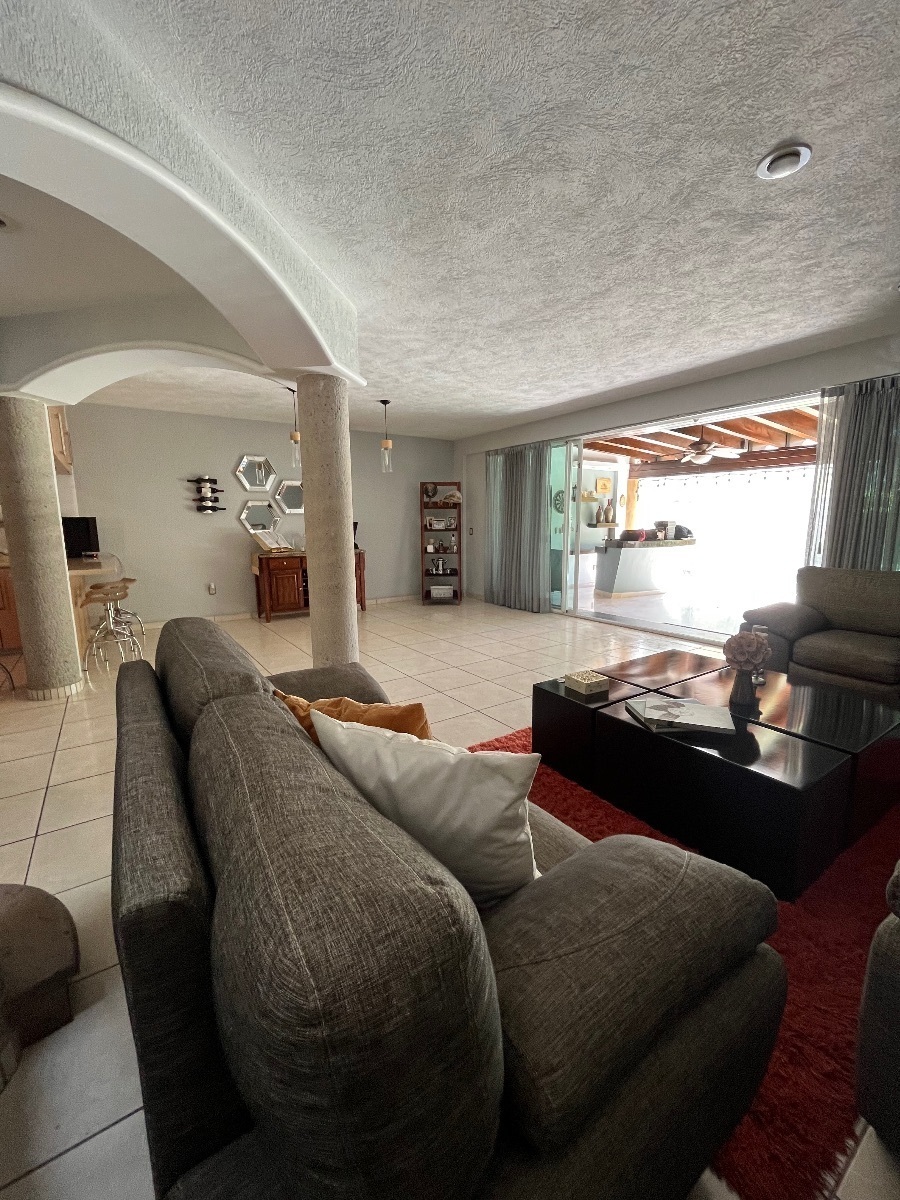 La sala-comedor cuenta con un ventanal de piso a techo que brinda una excelente iluminación y una agradable vista a la terraza con barra y al amplio jardín, perfecto para convivencias y momentos especiales en familia y con amigos.