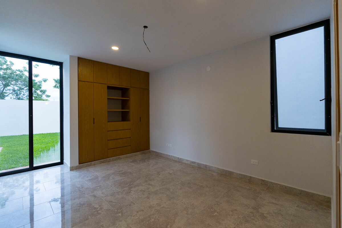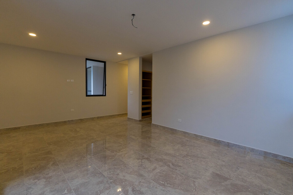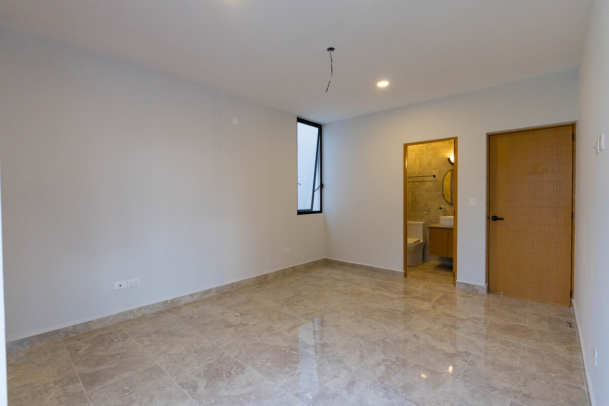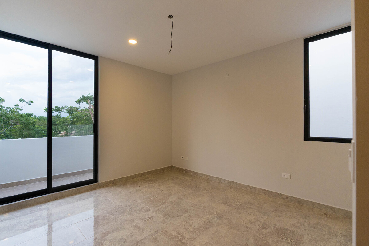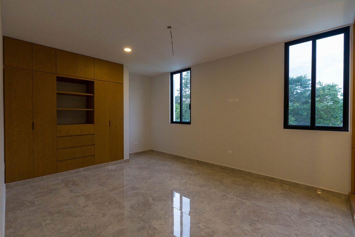 Recámara 1 con vista al área social y tiene un ventanal que abre al exterior. con closet vestido, y baño completo.