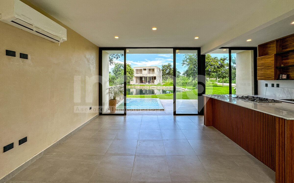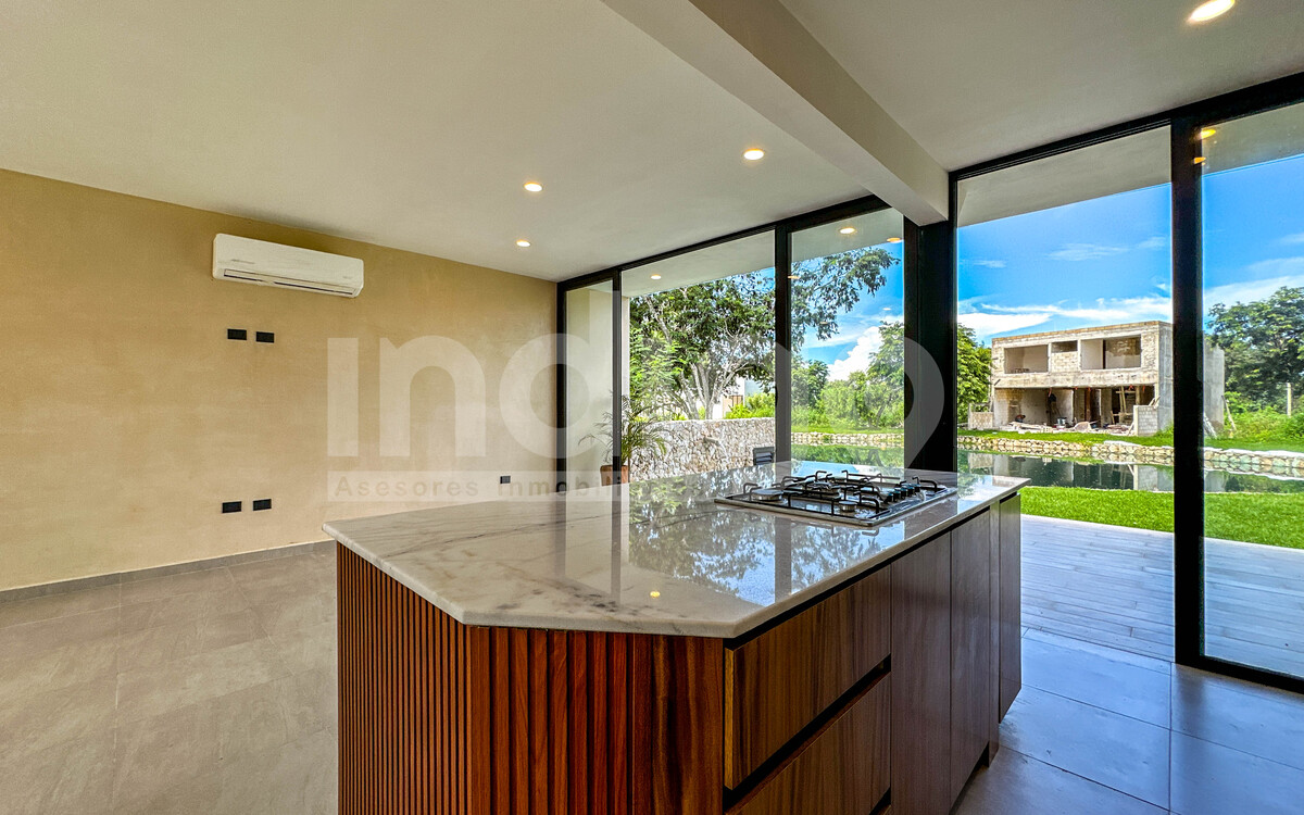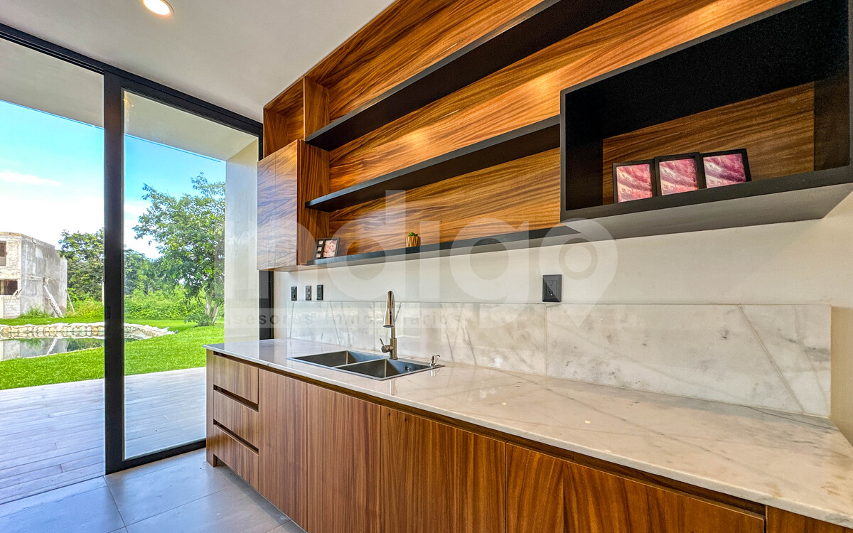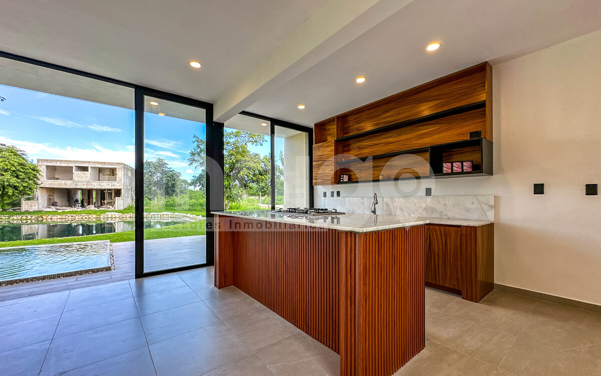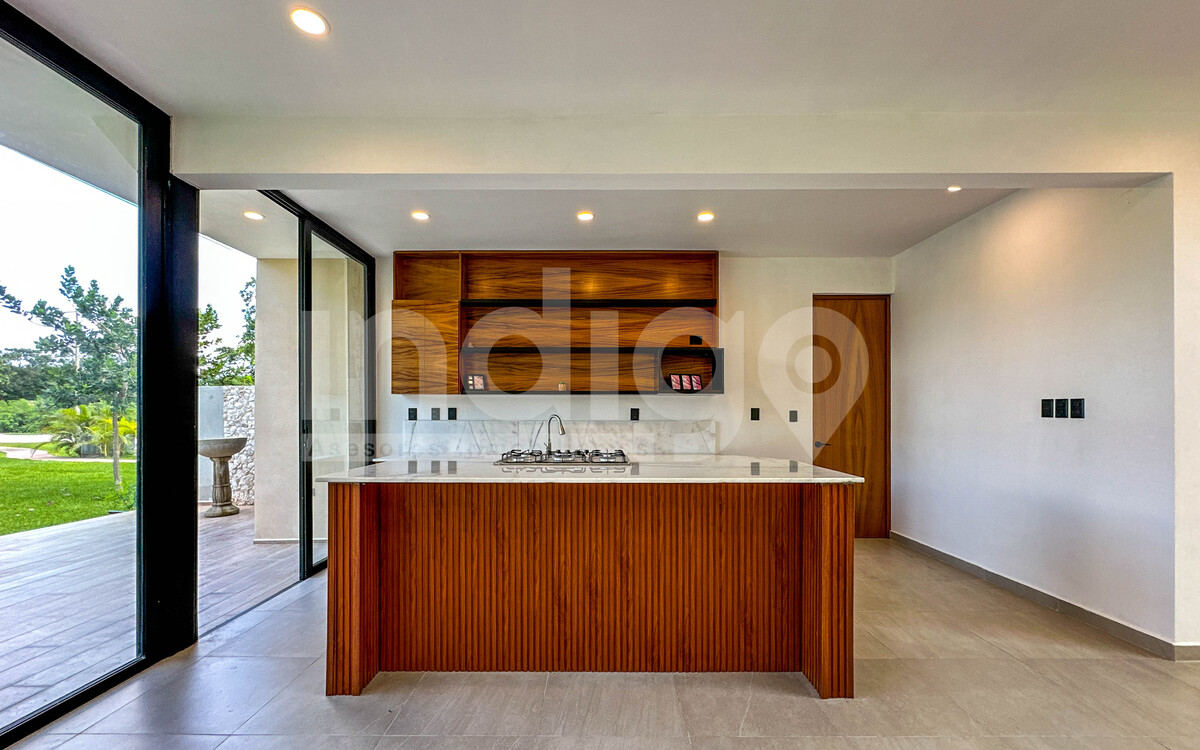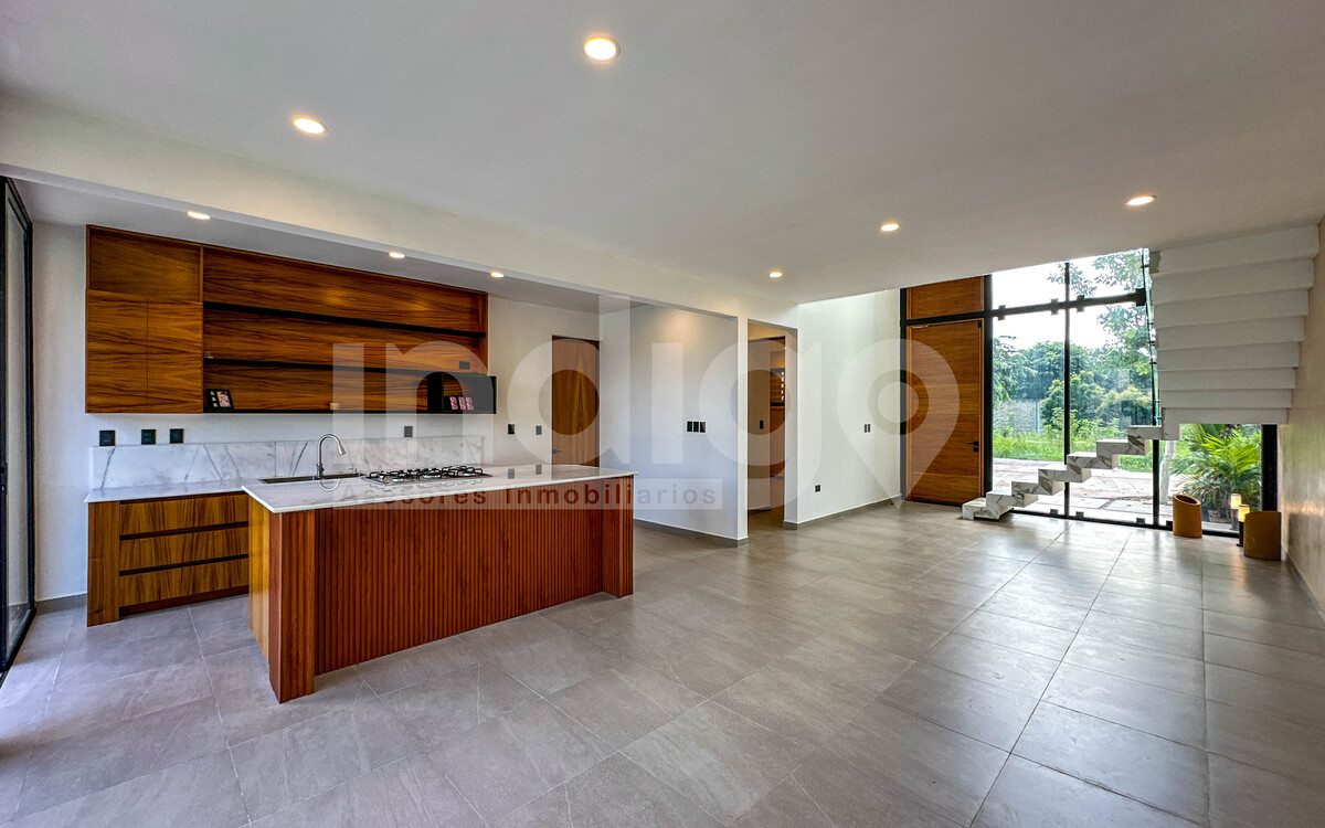 - Cocina integral en concepto abierto con isla desayunador y salida a la terraza