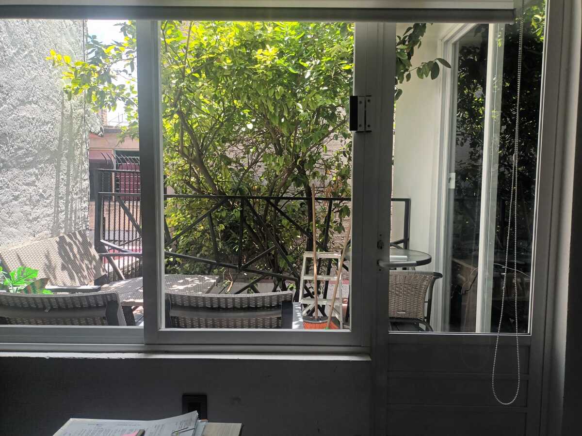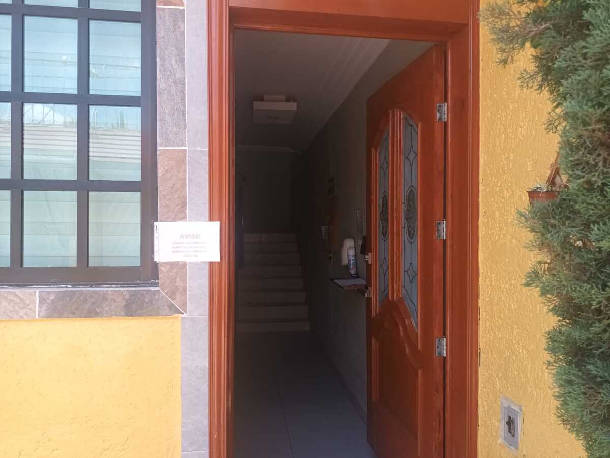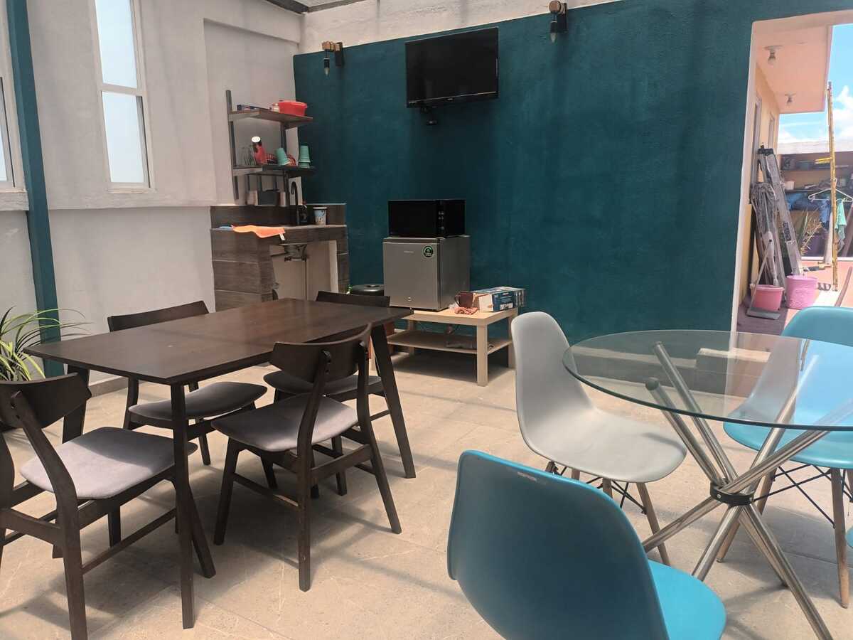 Planta baja: Departamento independiente con una recámara, baño completo, cocina integral abierta, sala, comedor, patio trasero y estacionamiento para dos autos.