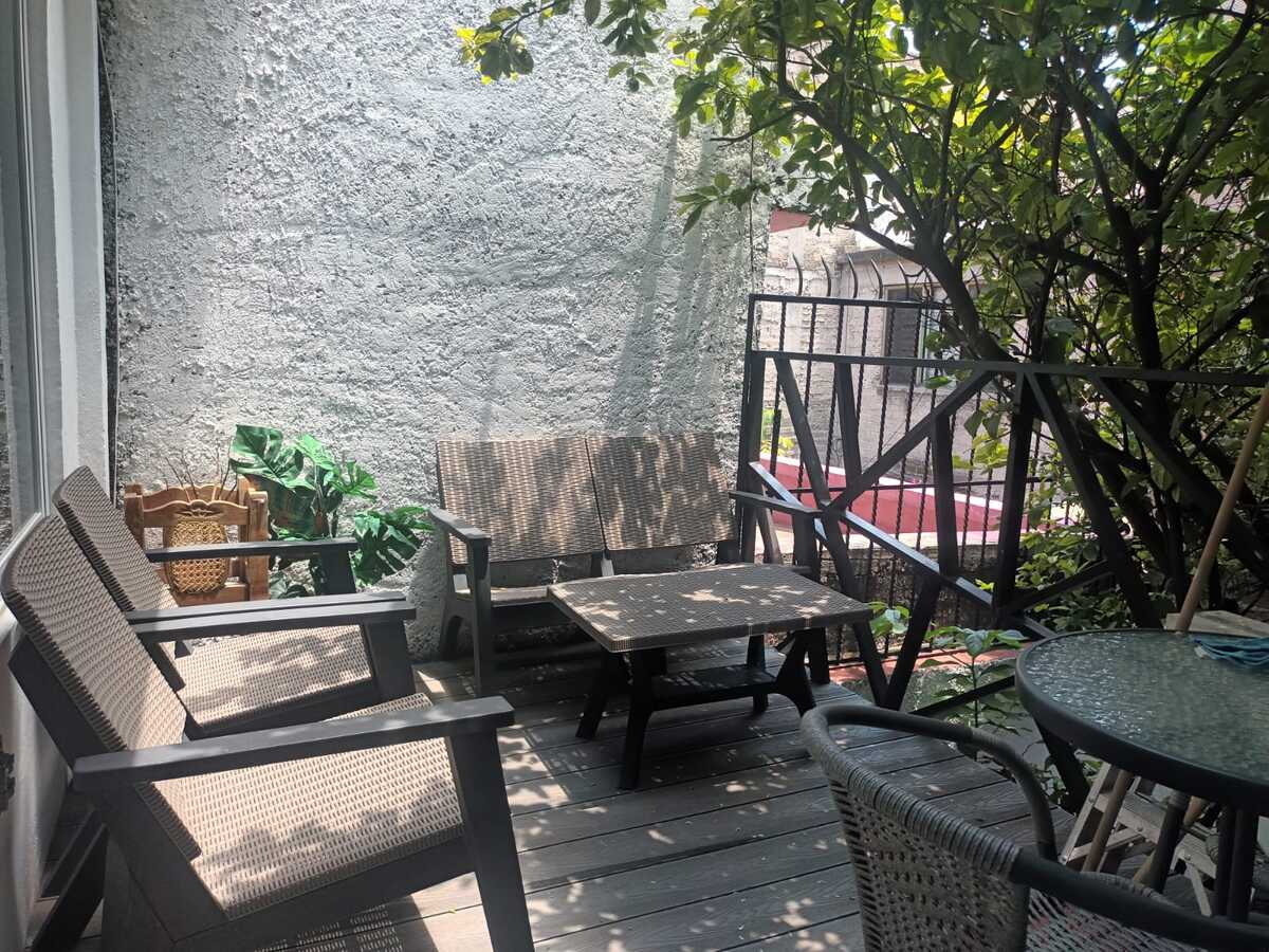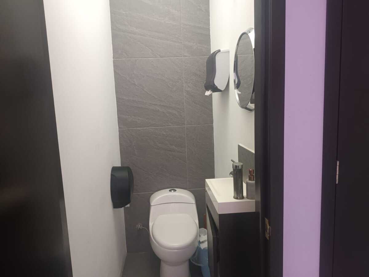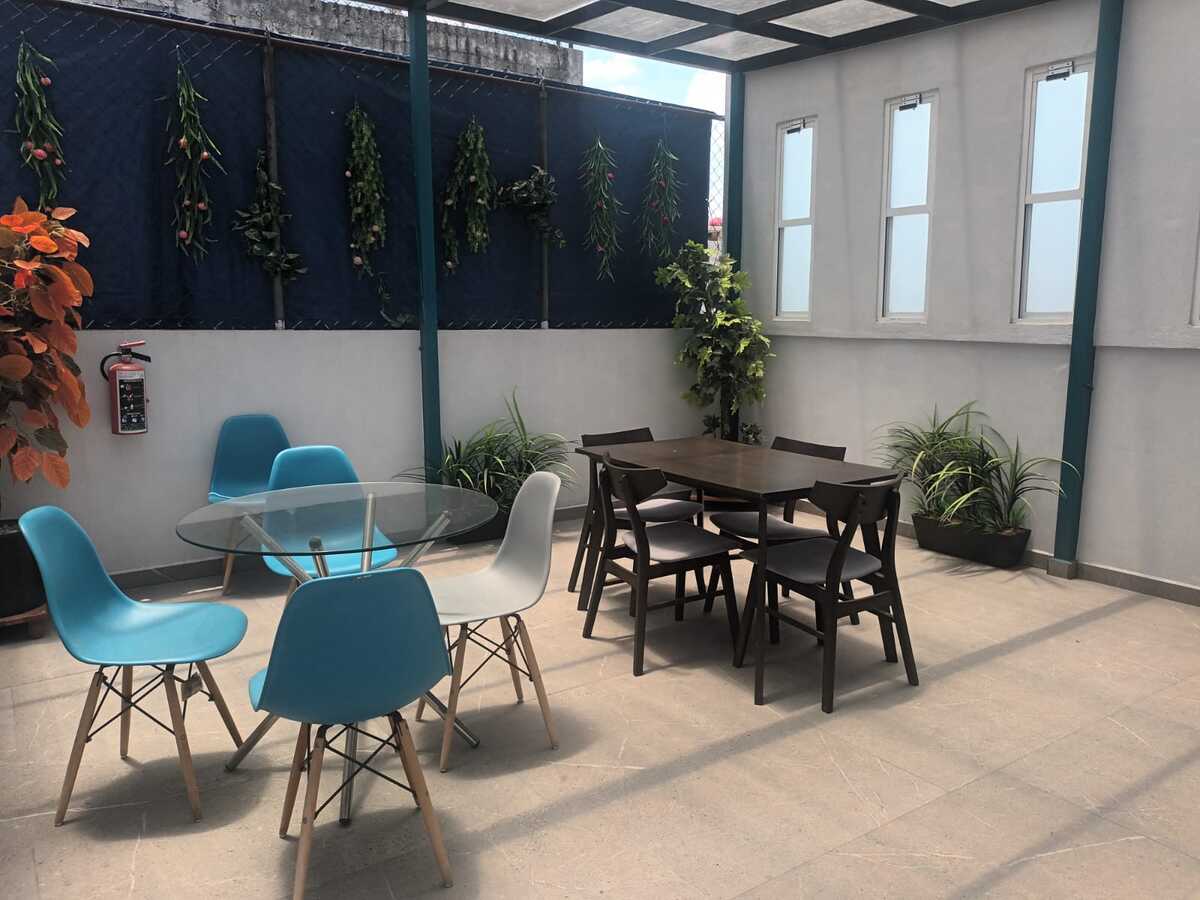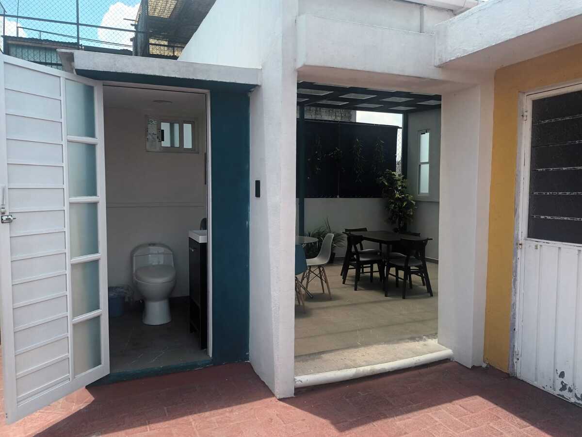 Segundo nivel: Área de oficinas con dos medios baños, originalmente tres recámaras (la principal con baño completo y otro baño adicional). Terraza con acceso desde una de las recámaras.