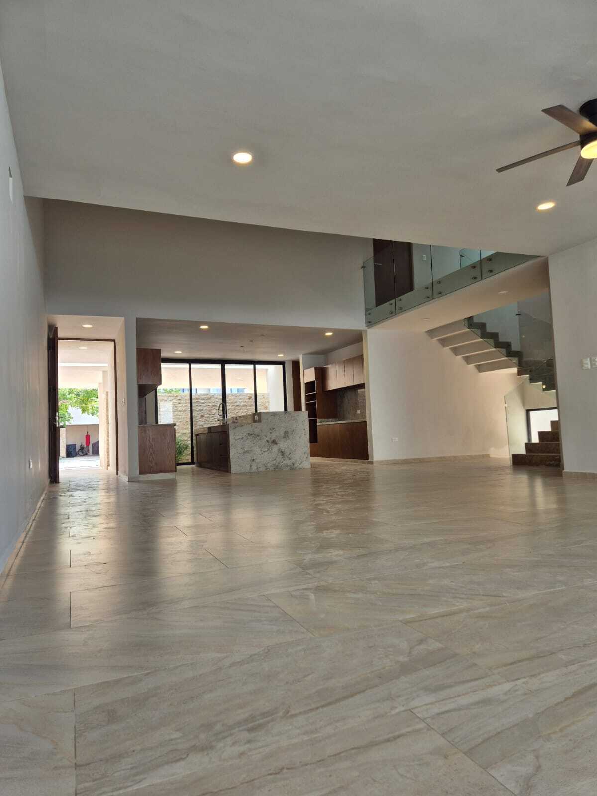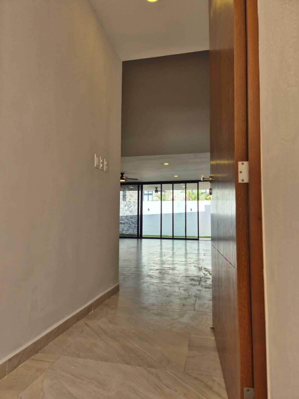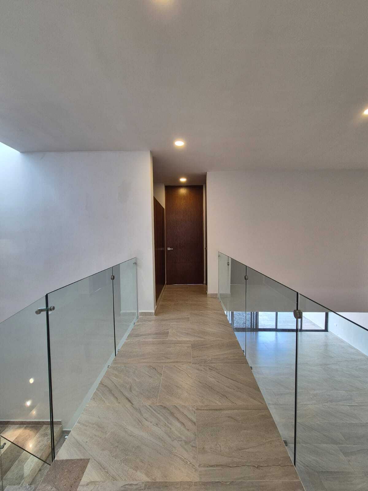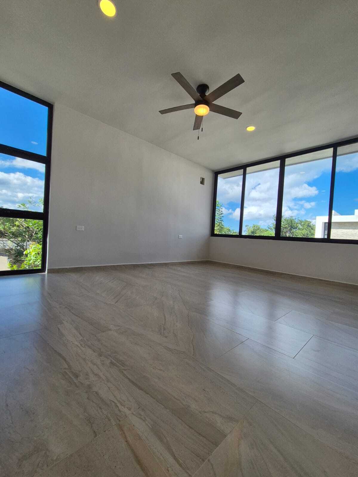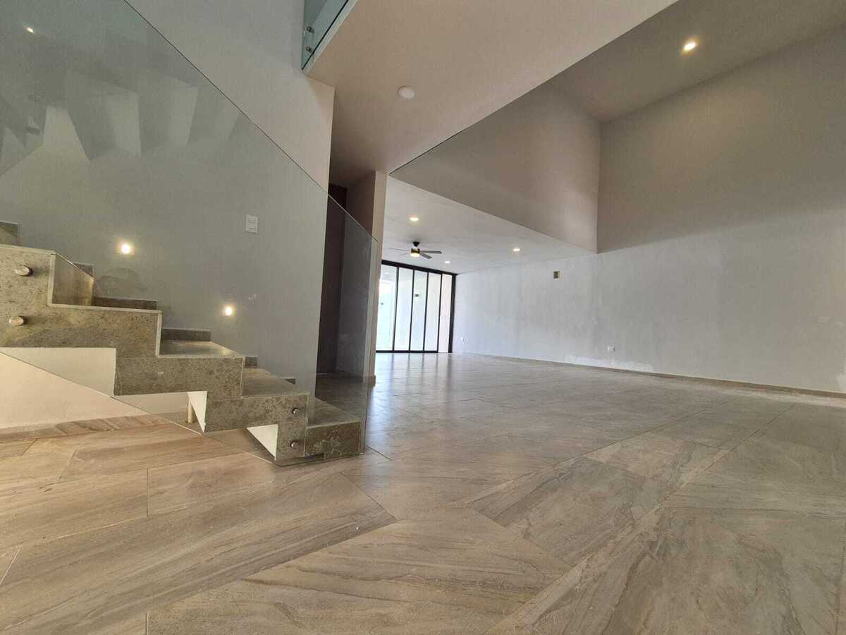 Modern and elegant style residence for pre-sale within the NorteMerida private community, with generous spaces, large land, and luxury finishes. It stands out for its spacious common areas such as a double-height living-dining room, family room, and a pool of 3 × 9 m. Includes service room with bathroom, laundry room, 3000 L cistern, water treatment system, solar panels with micro-inverter, water softener, and hydropneumatic system .
