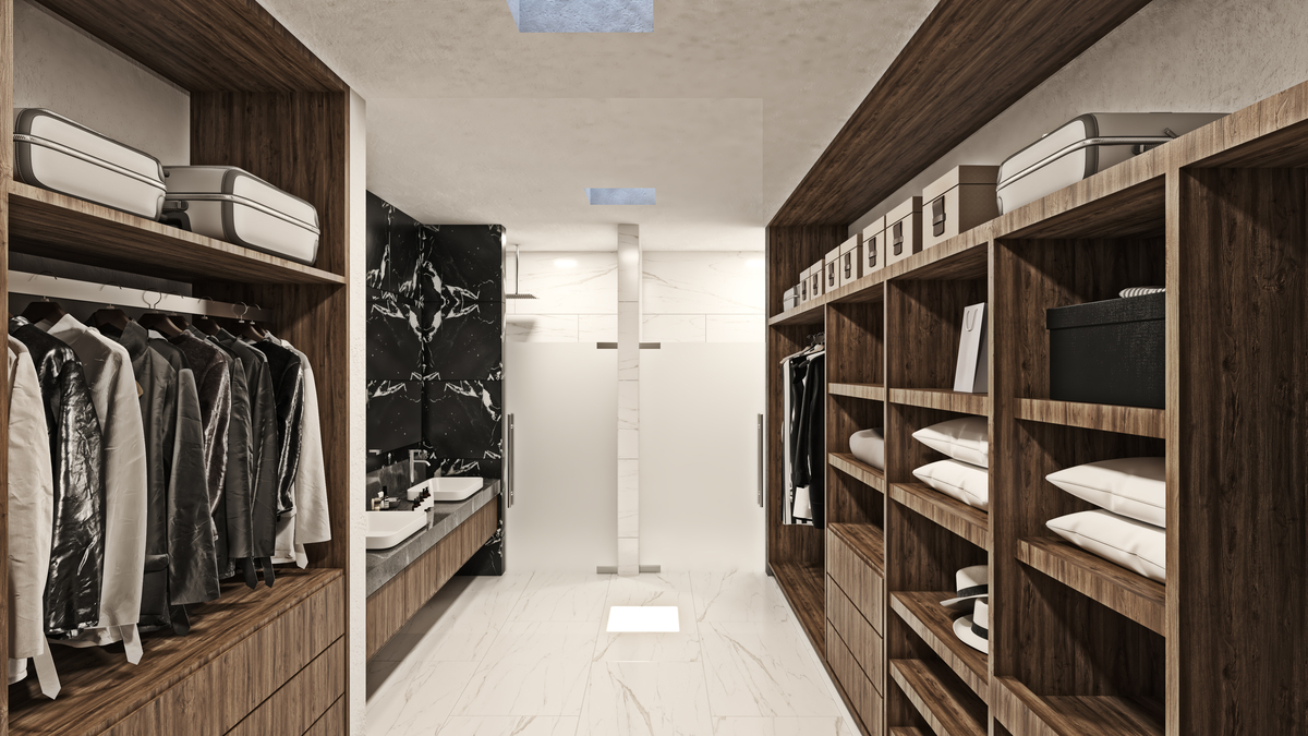 -1 Habitación principal (master suite), Amplio armario vestidor, Baño completo con doble lavabo para mayor comodidad y balcón con vistas inigualables.