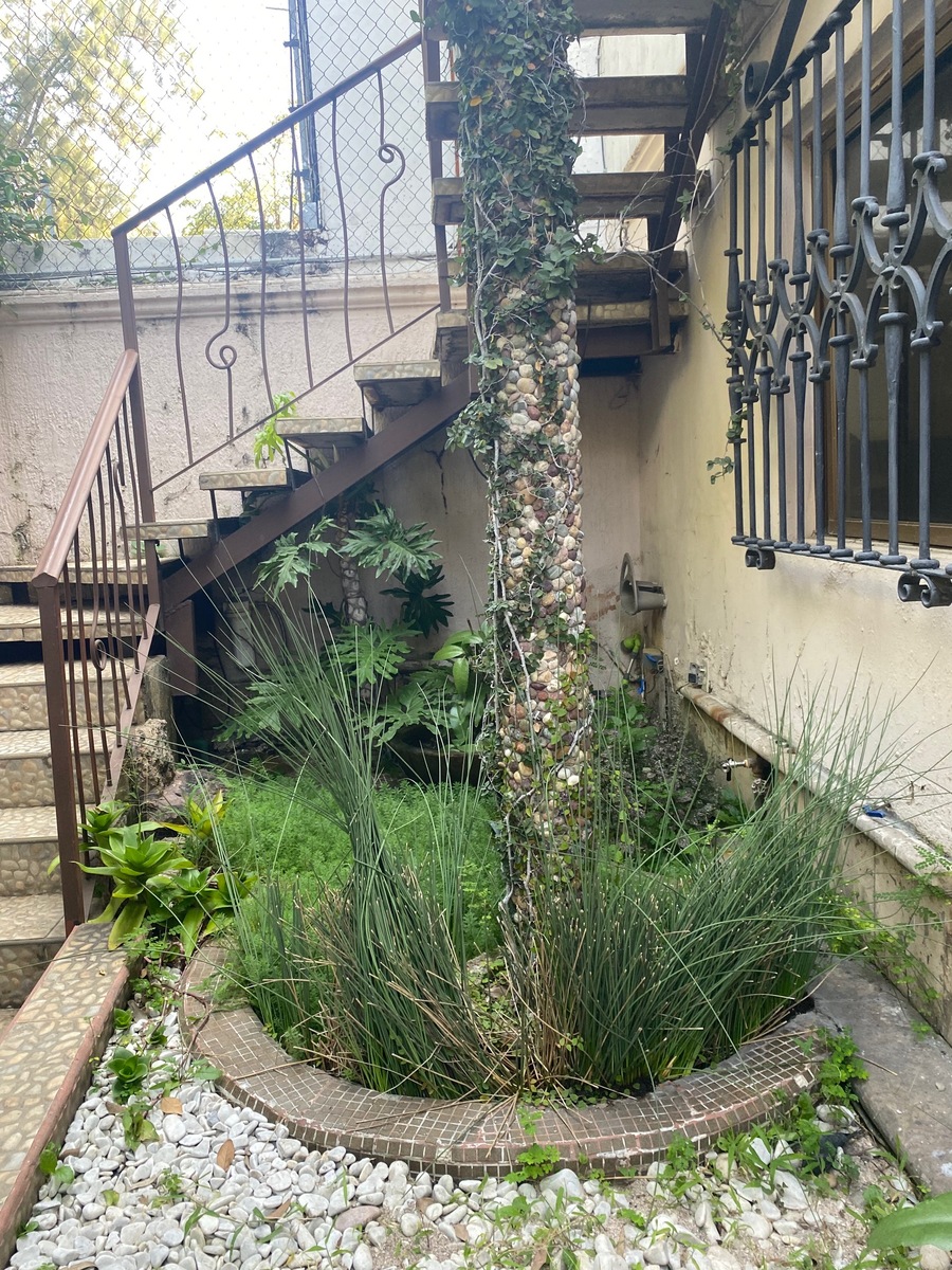 Cochera con portón eléctrico para 2 autos, cocina, recibidor, área de farmacia, 5 espacios para terapia, 2 baños completos, 2 oficinas con closet comparten baño y patio con plantas.