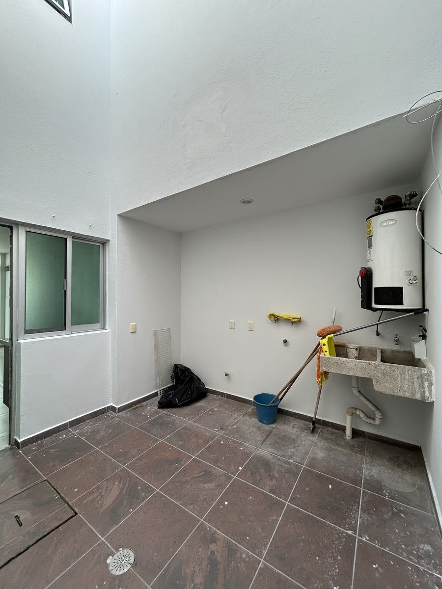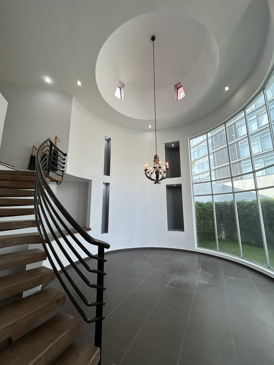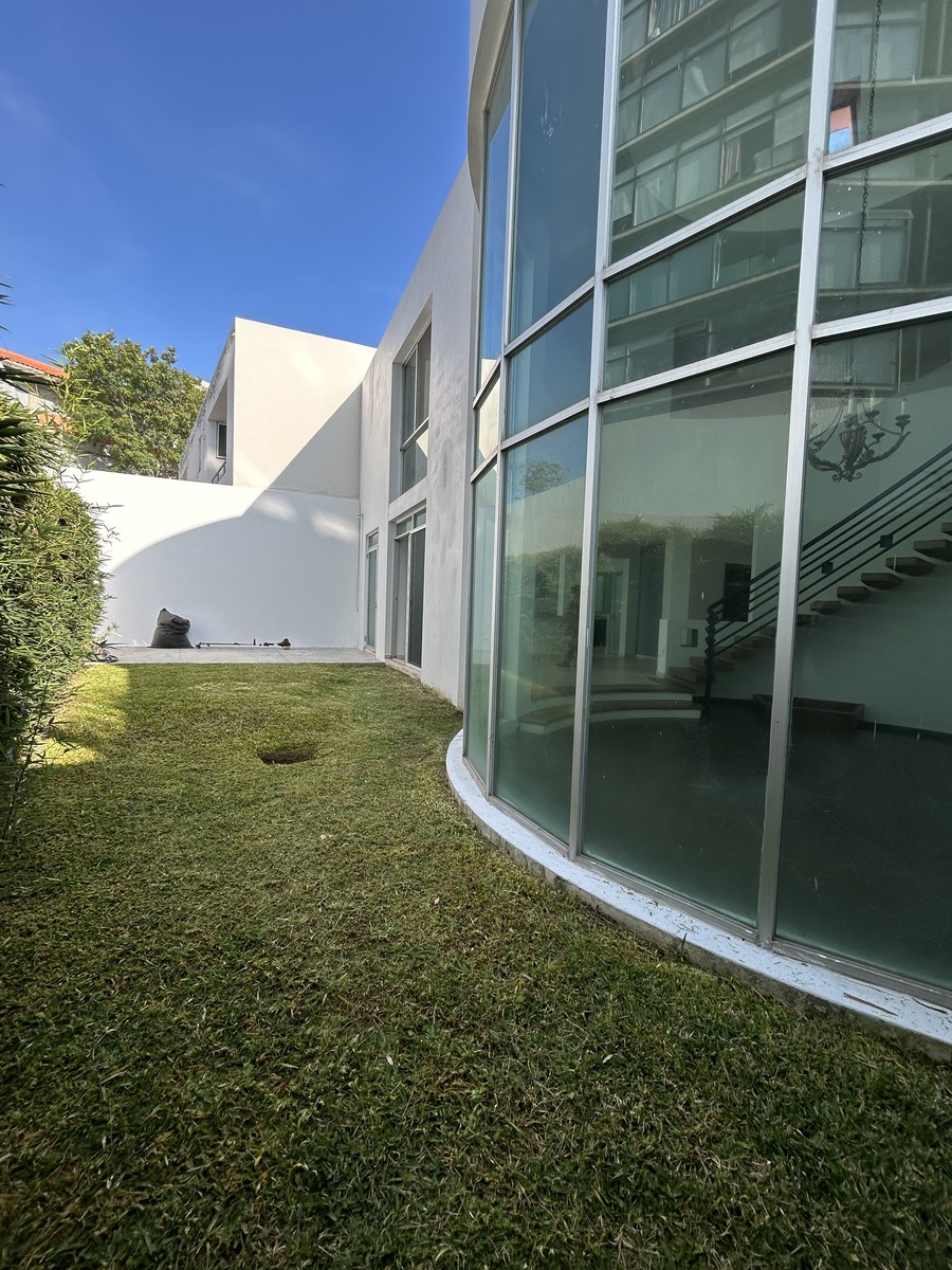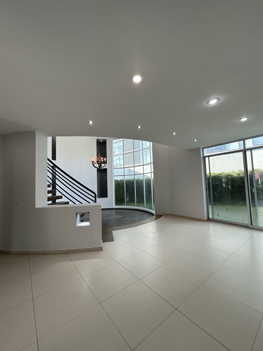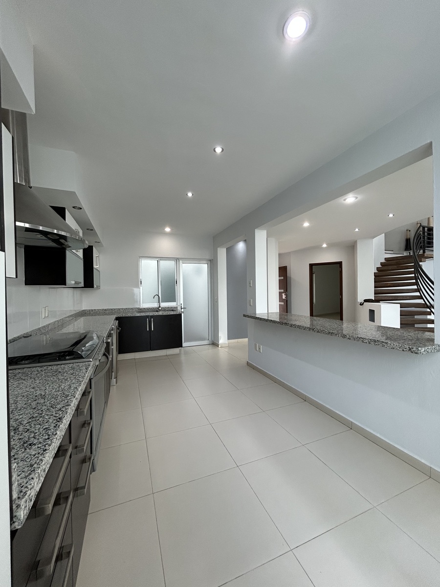 Cochera 2 autos, Estudio Grande , Medio baño, Sala doble altura,Bar con barra con tarja, cocina integral, jardín con terraza conectada a la cocina, área de lavado, cuarto de servicio con baño completo y salida de servio a la calle.