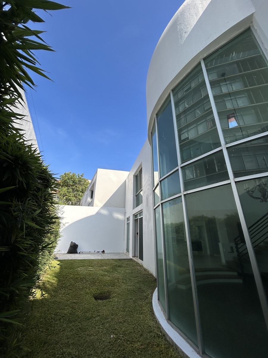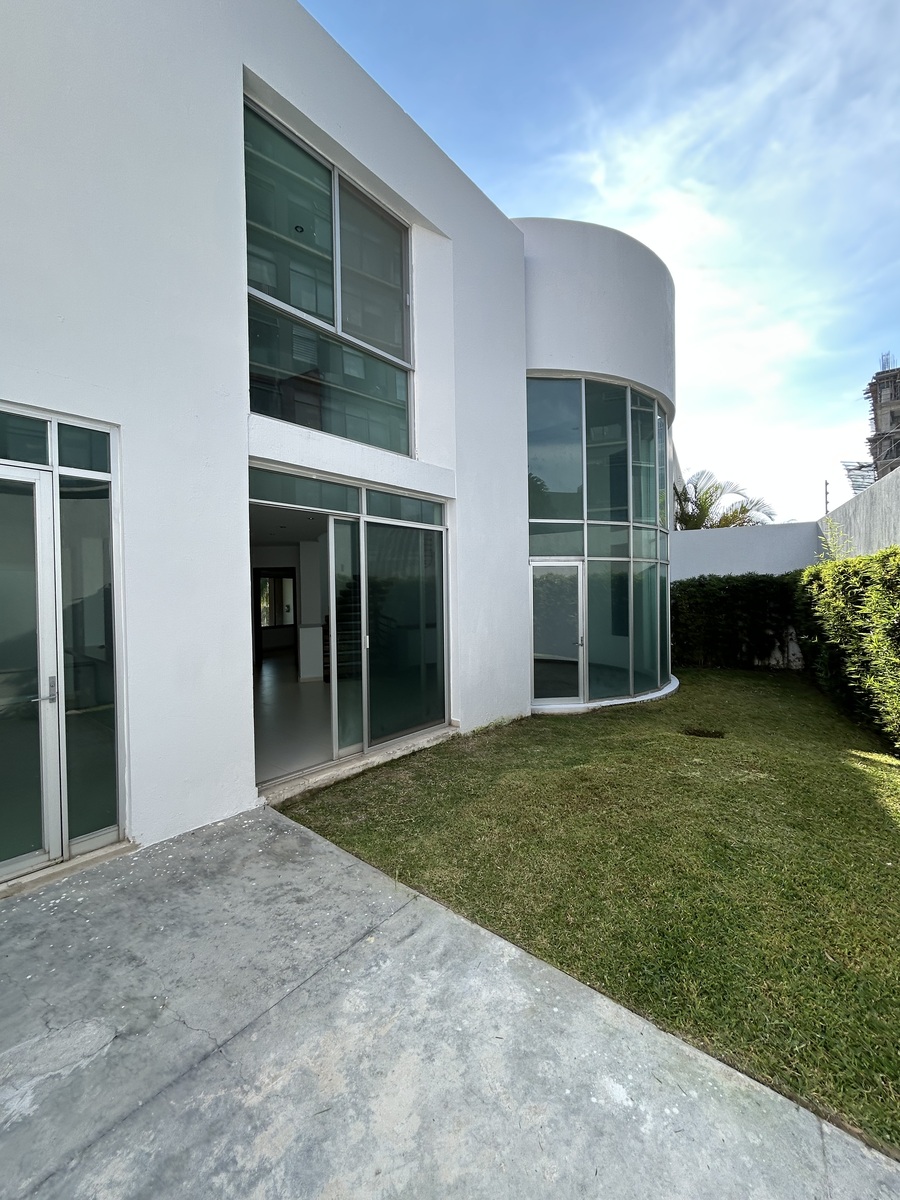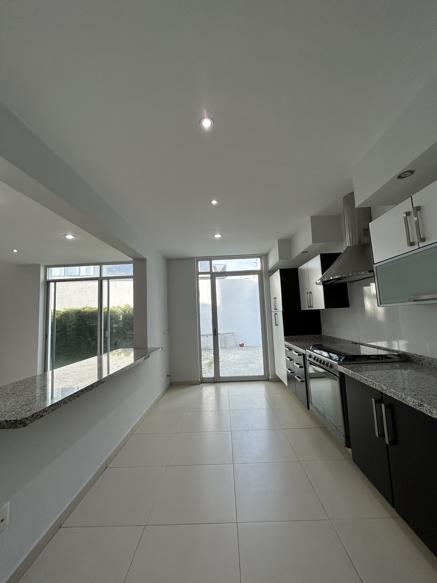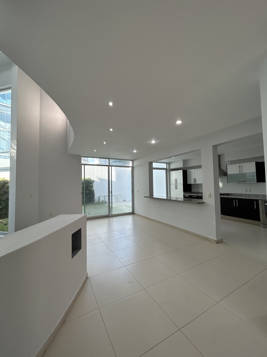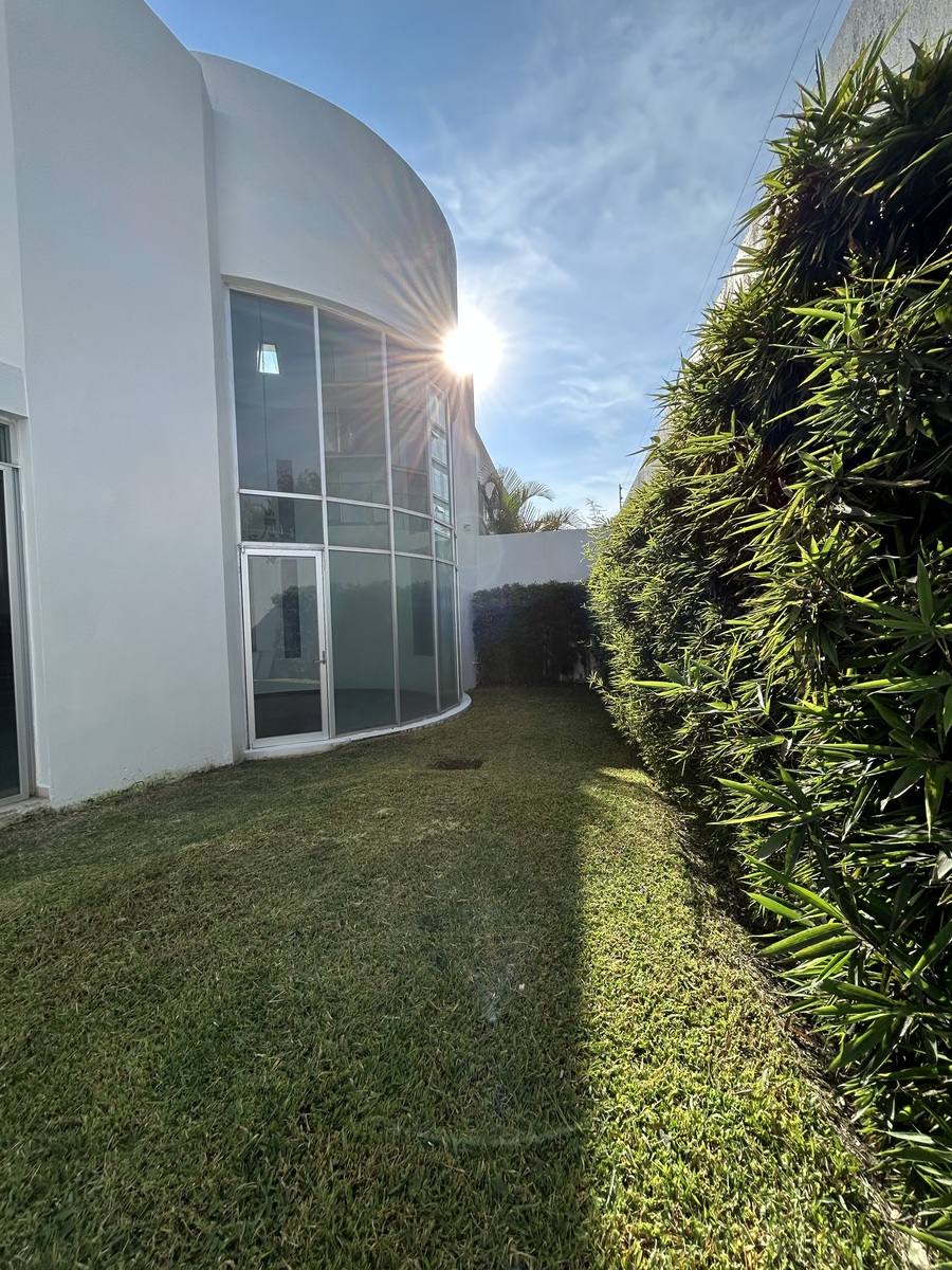 Cochera 2 autos, Estudio Grande , Medio baño, Sala doble altura,Bar con barra con tarja, cocina integral, jardín con terraza conectada a la cocina, área de lavado, cuarto de servicio con baño completo y salida de servio a la calle.