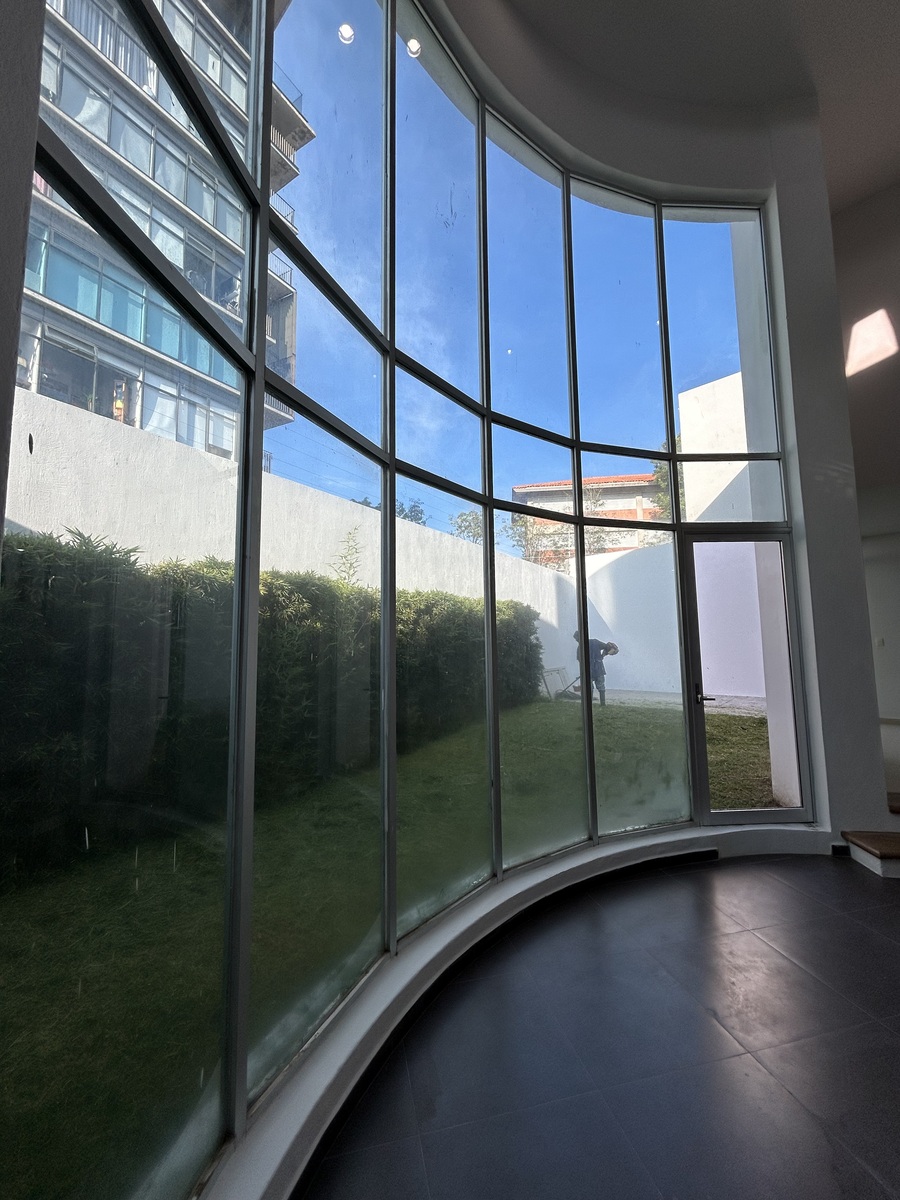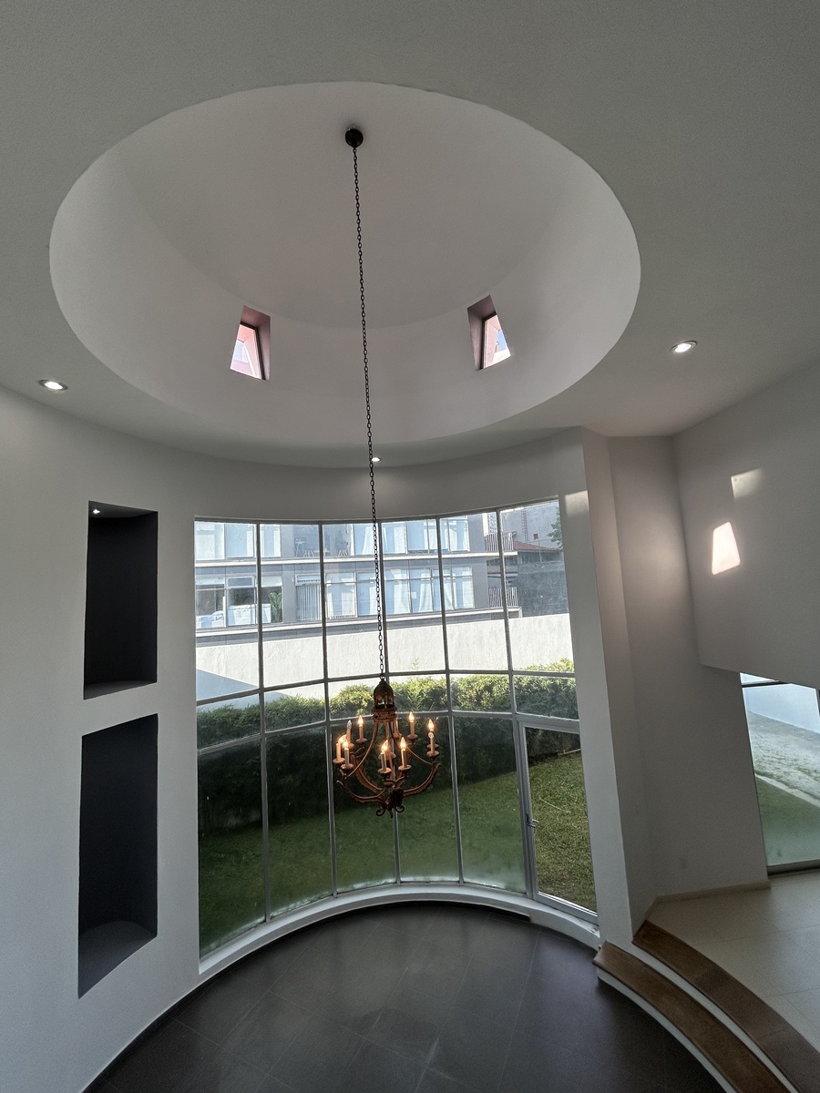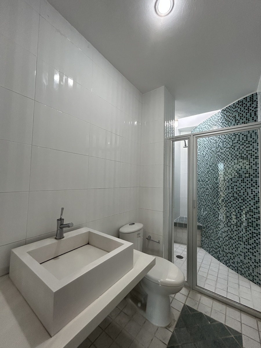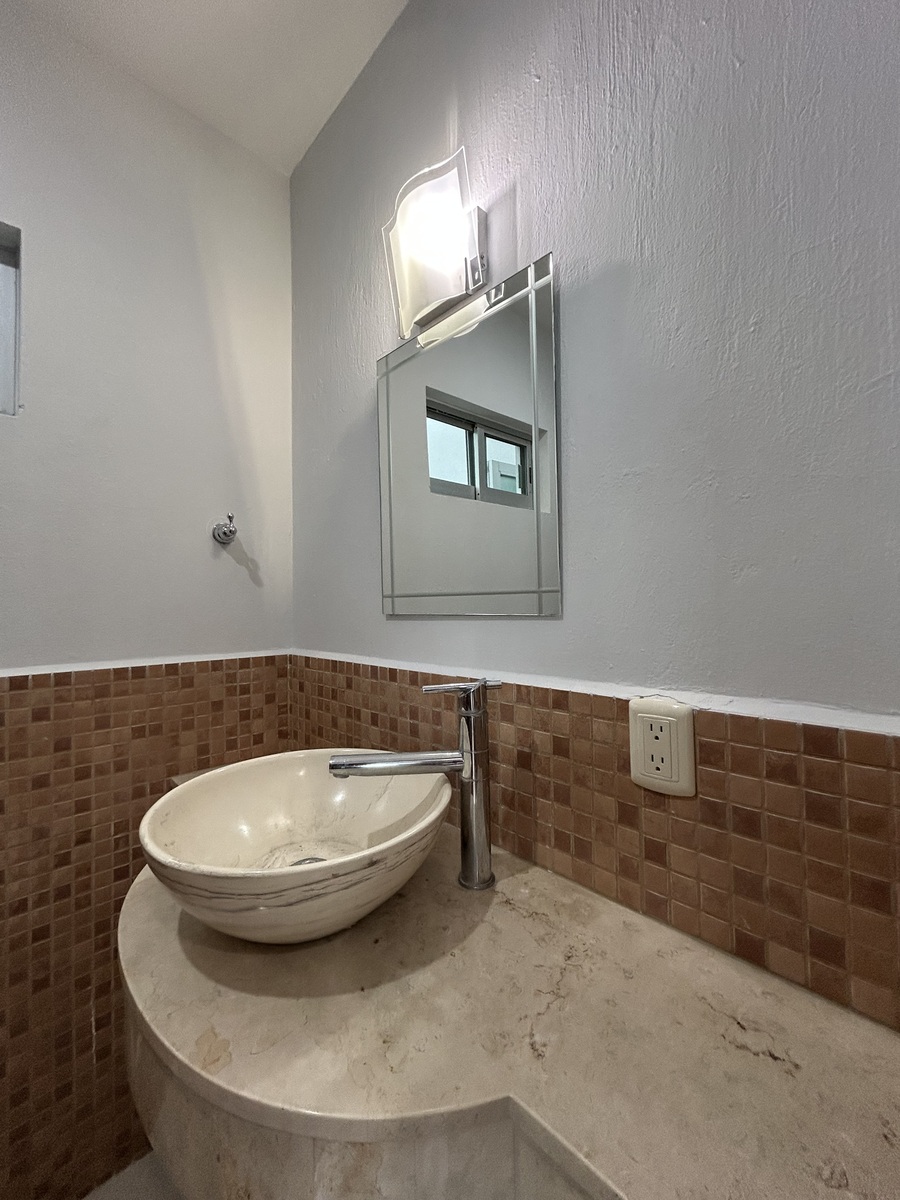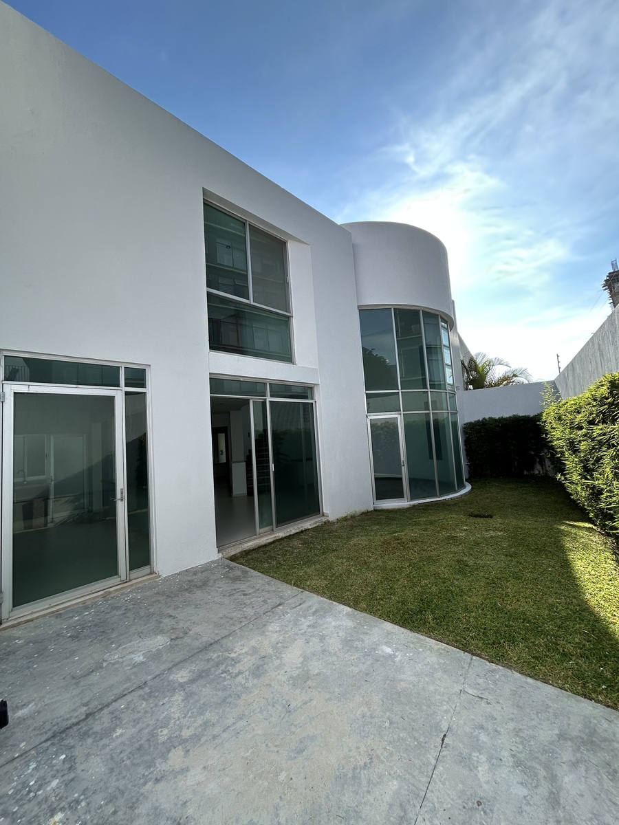 Cochera 2 autos, Estudio Grande , Medio baño, Sala doble altura,Bar con barra con tarja, cocina integral, jardín con terraza conectada a la cocina, área de lavado, cuarto de servicio con baño completo y salida de servio a la calle.