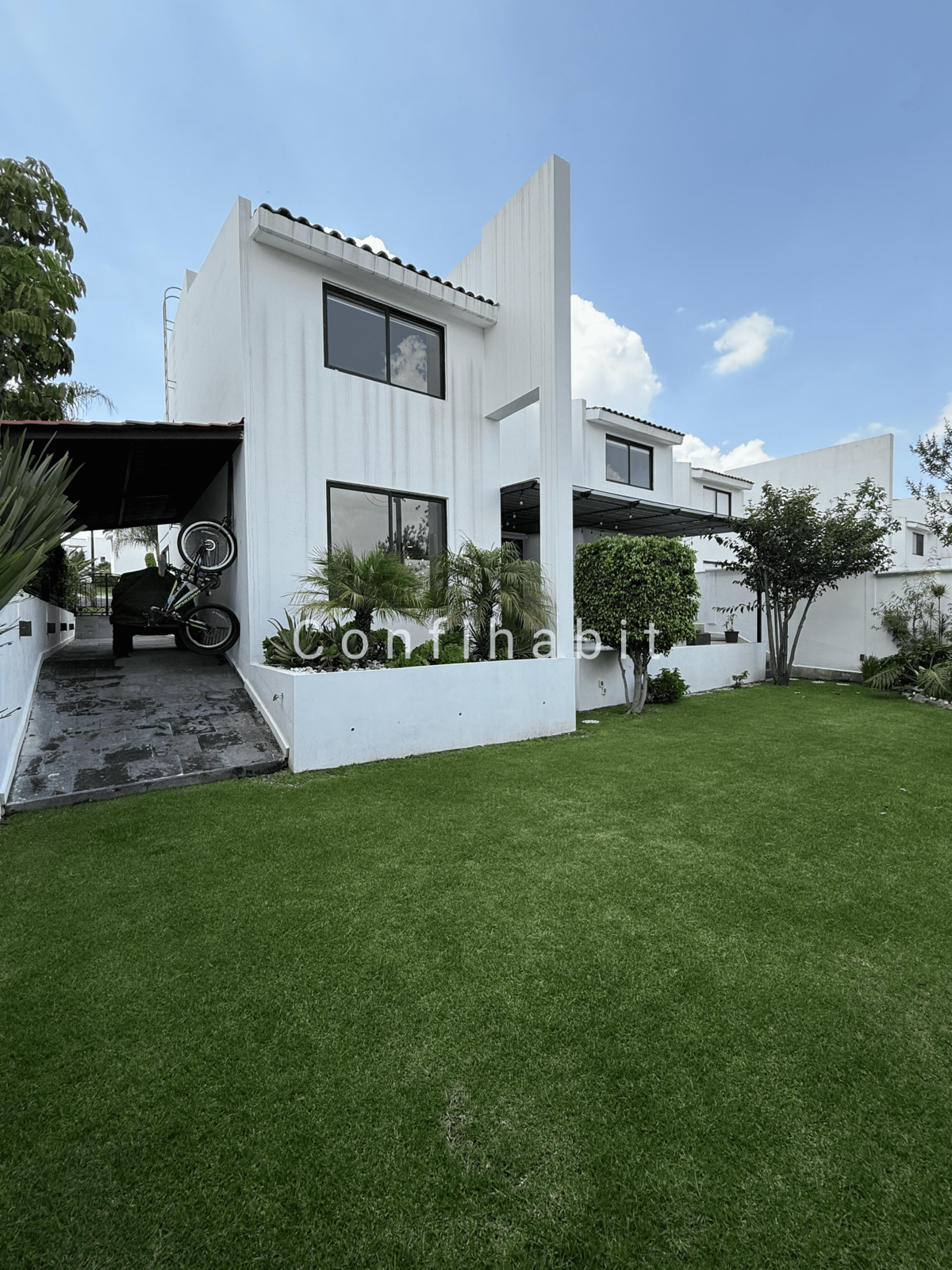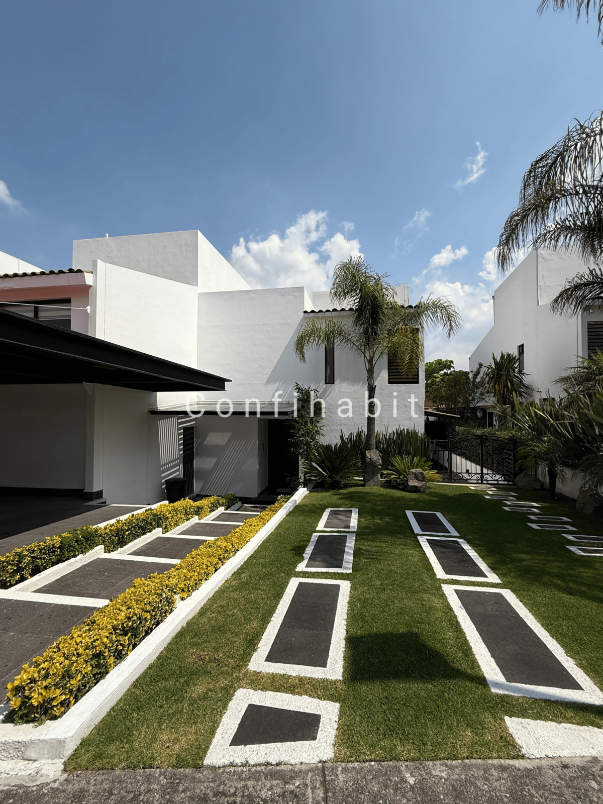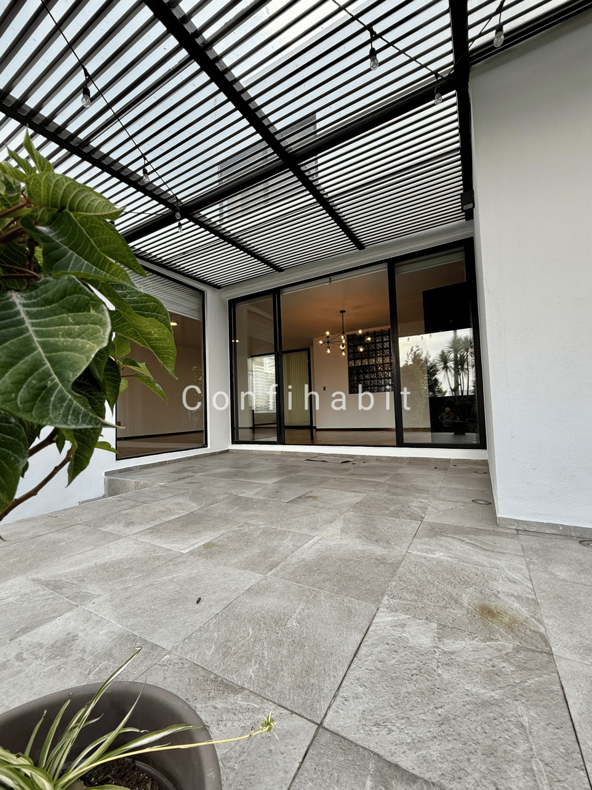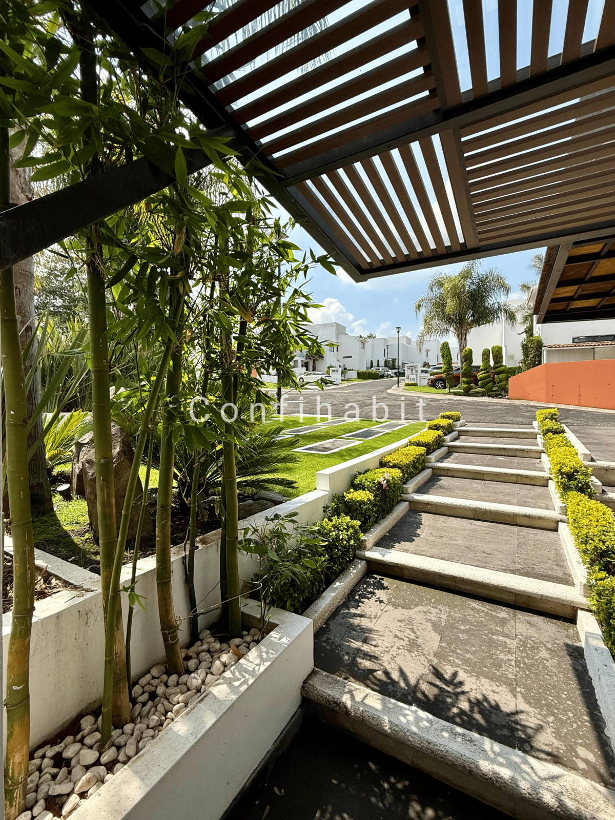Amplia estancia en la Sala y Comedor, área de bar o estudio, Cocina equipada con cubierta de cuarzo, alacena y área de antecomedor, terraza, Jardín con iluminación, amplio jardín lateral en ambos lados de la casa.