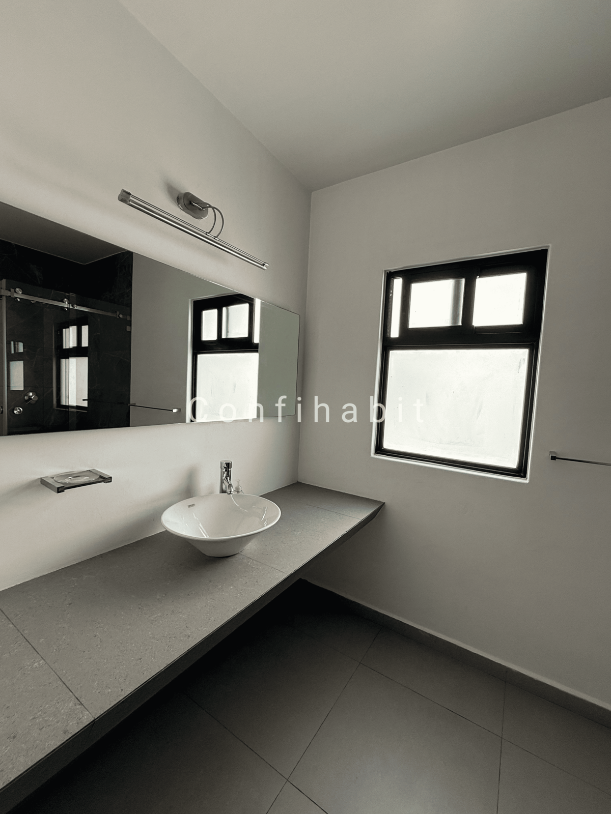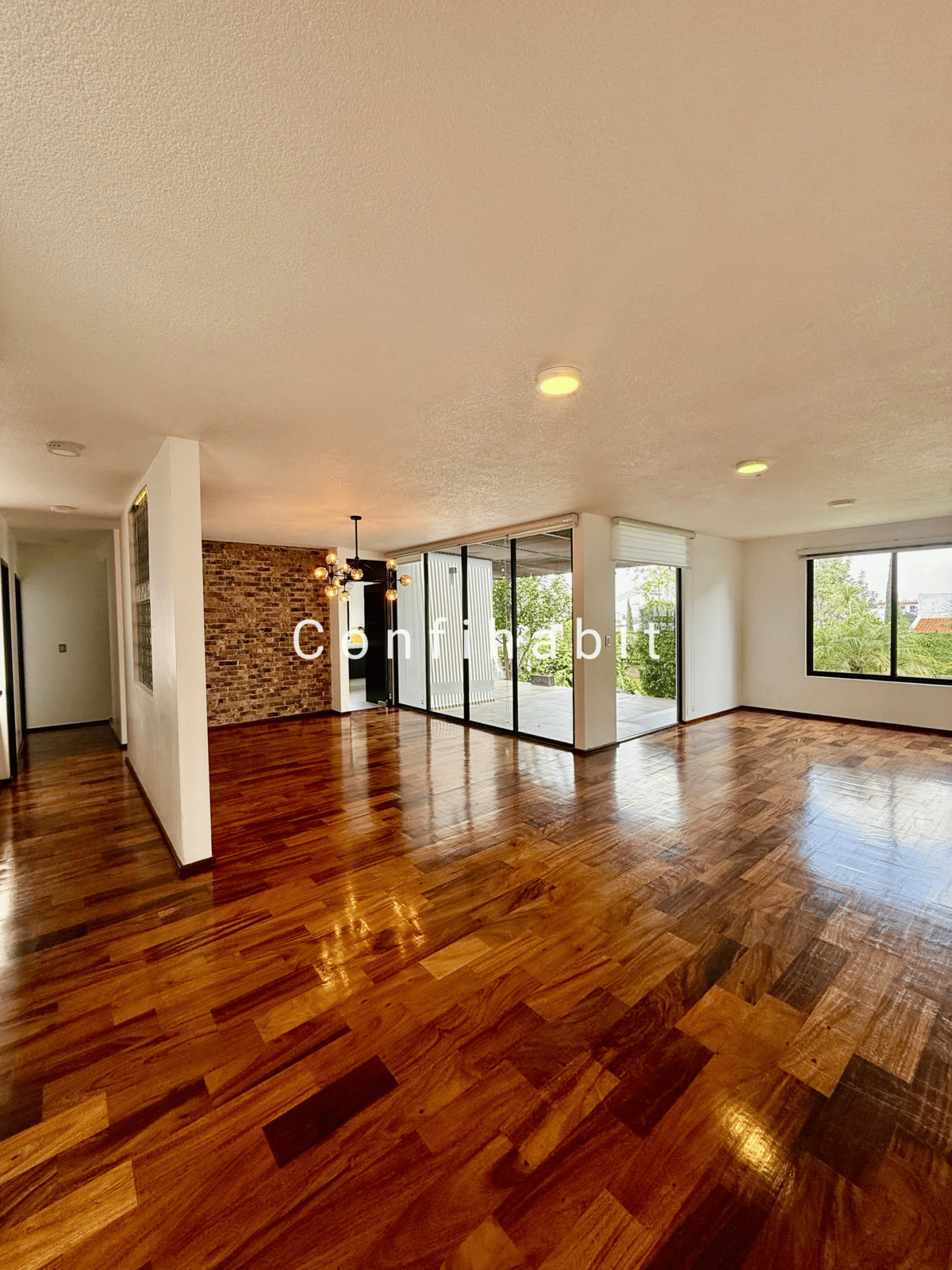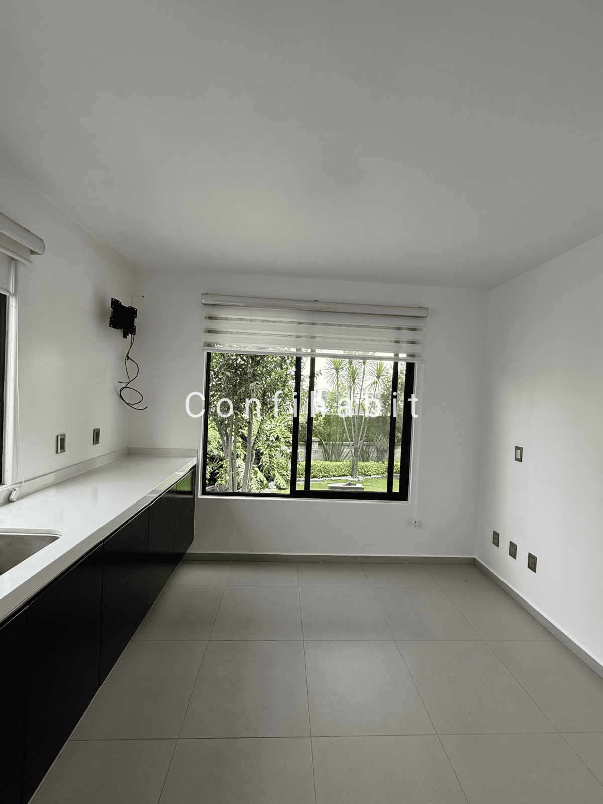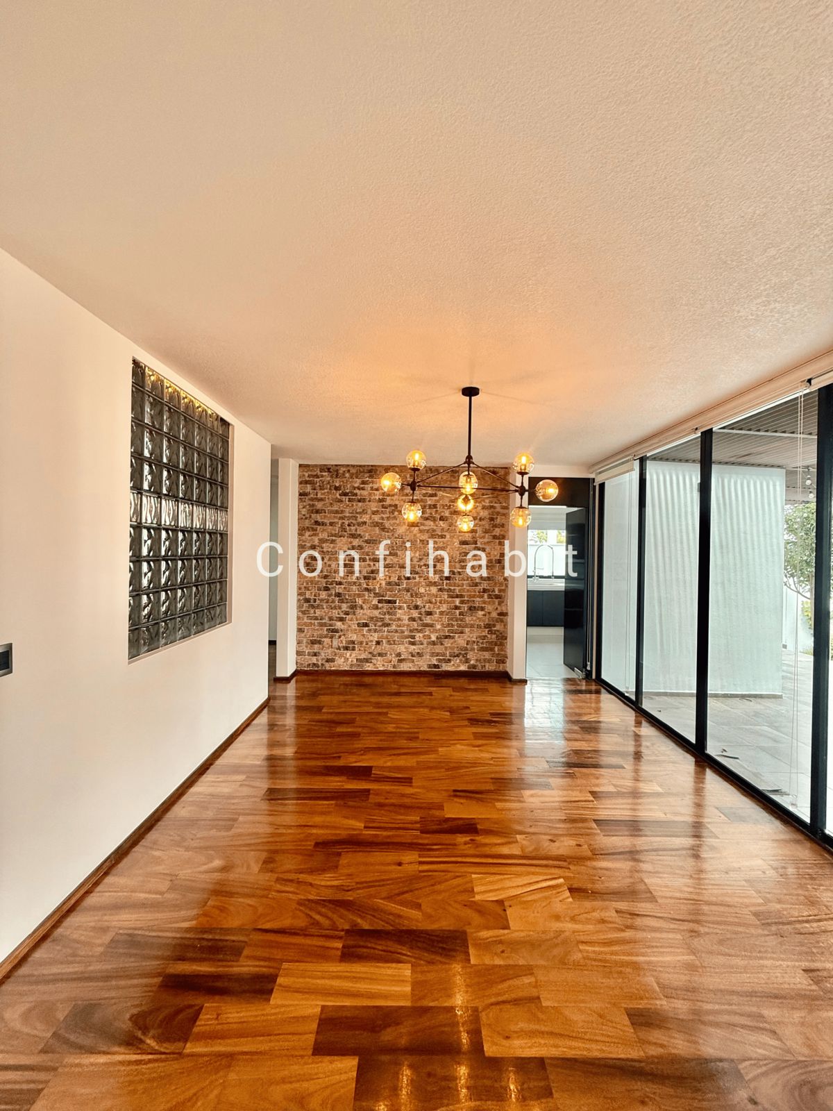 Amplia estancia en la Sala y Comedor, área de bar o estudio, Cocina equipada con cubierta de cuarzo, alacena y área de antecomedor, terraza, Jardín con iluminación, amplio jardín lateral en ambos lados de la casa.
