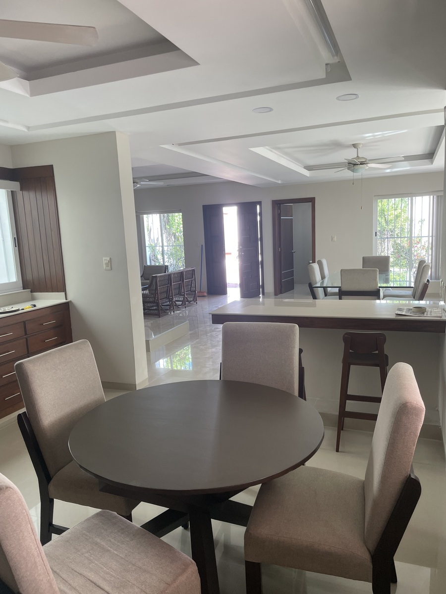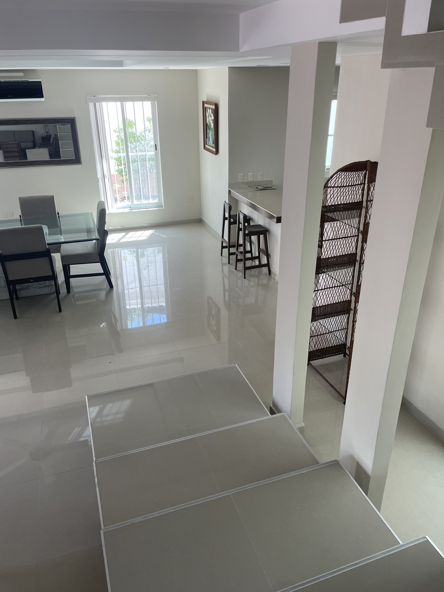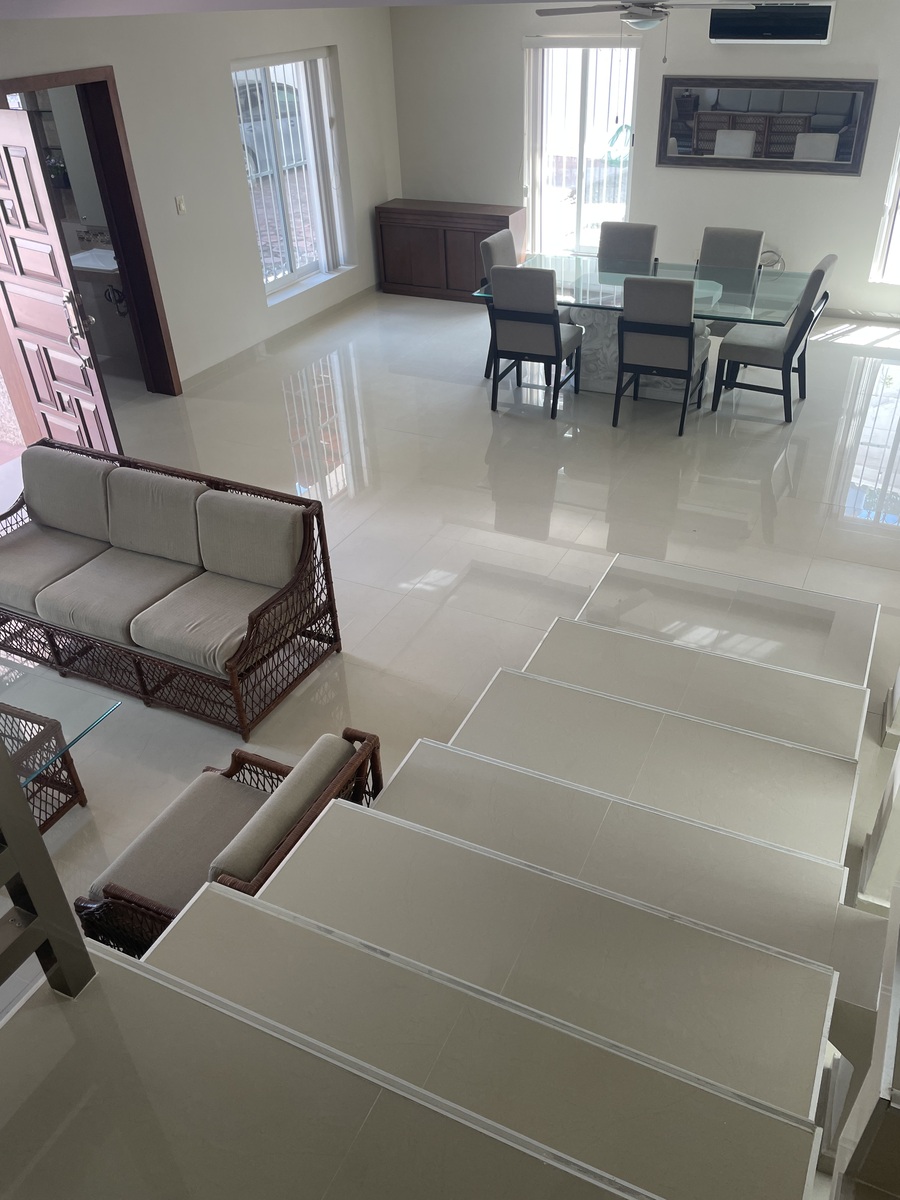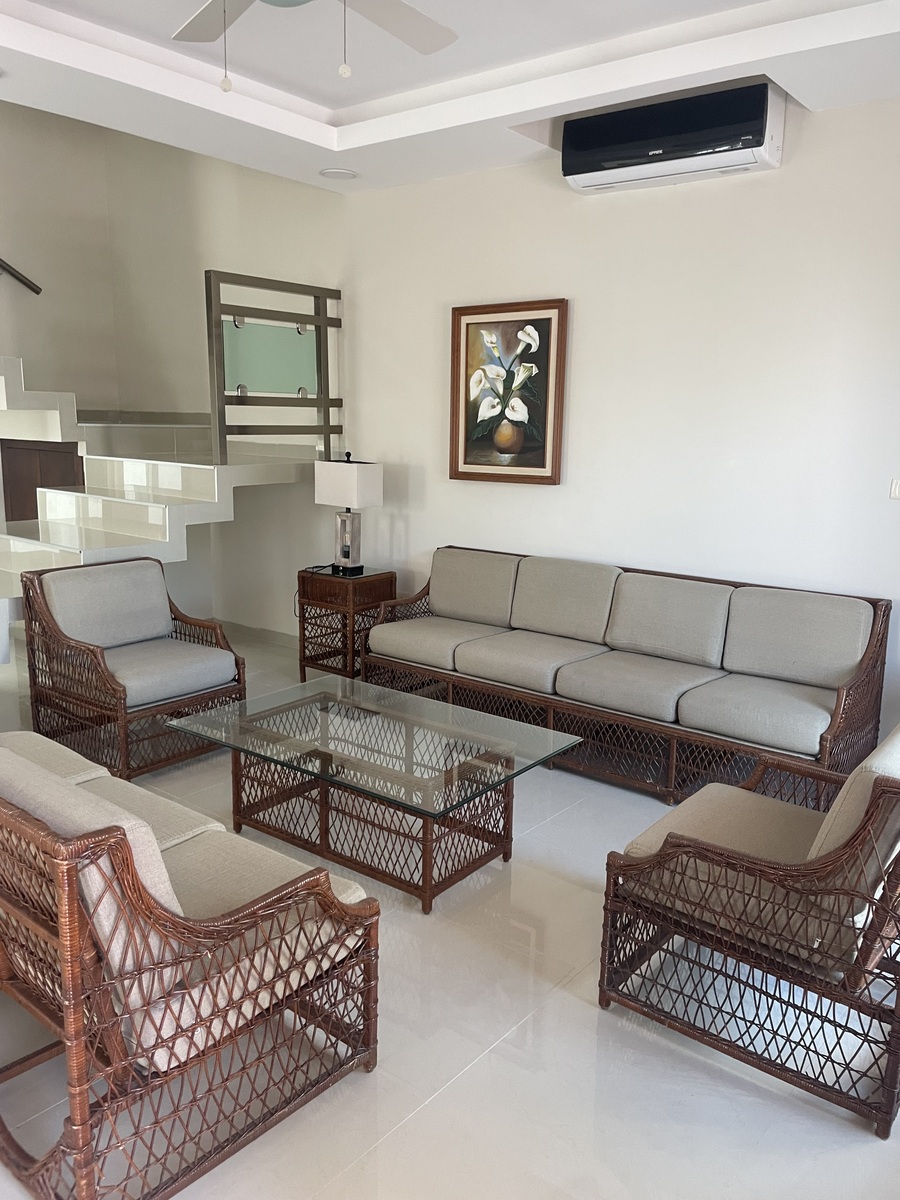 La casa está totalmente equipada, muebles de sala, comedor, desayunador, refri, micro, lavadora, secadora, recámaras amuebladas con camas king y matrimonial, televisión.