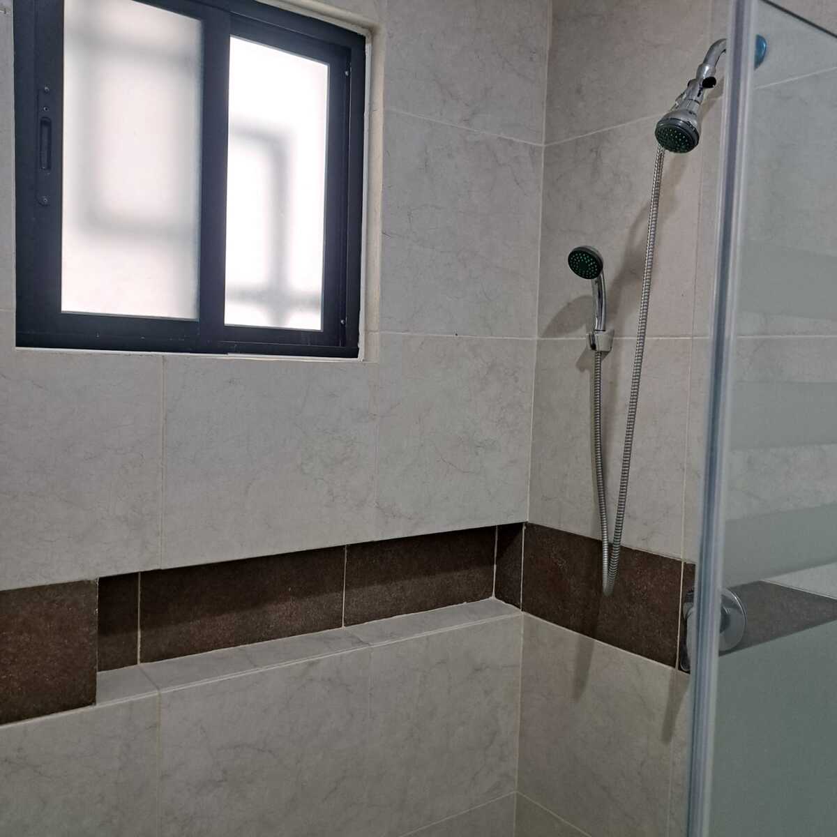 Recámara secundaria con clóset integrado y baño completo con canceles de vidrio y espejos.