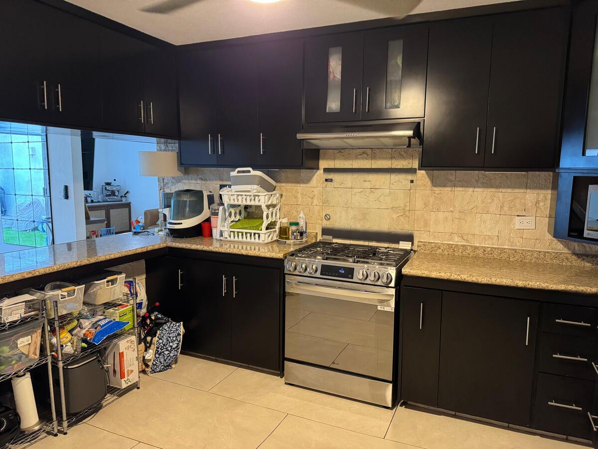 . Refrigerador, estufa, microondas, lavadora y secadora.