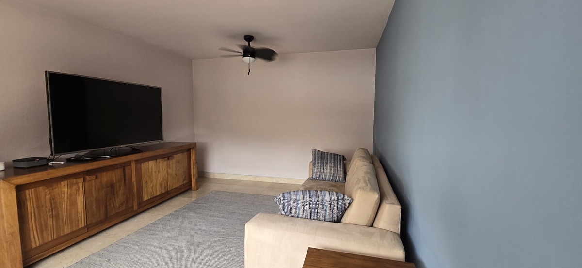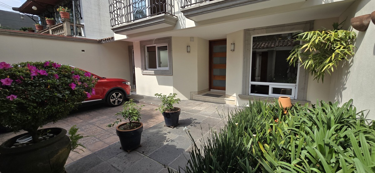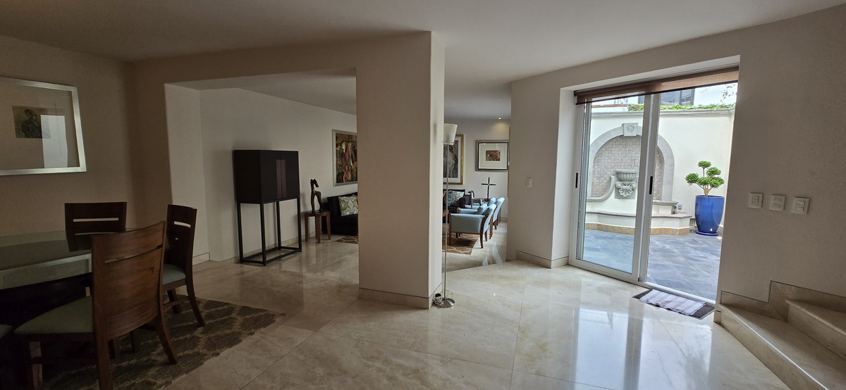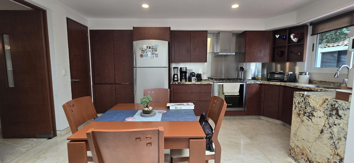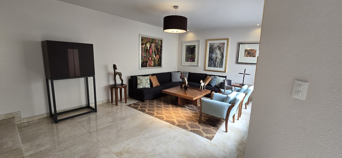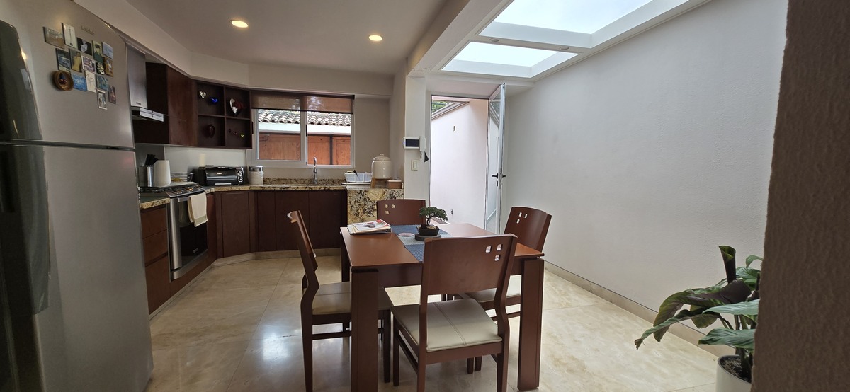 Sala comedor con salida a linda terraza de 50 metros con fuente, sala de T.V., cocina Quetzal con desayunador integrado.