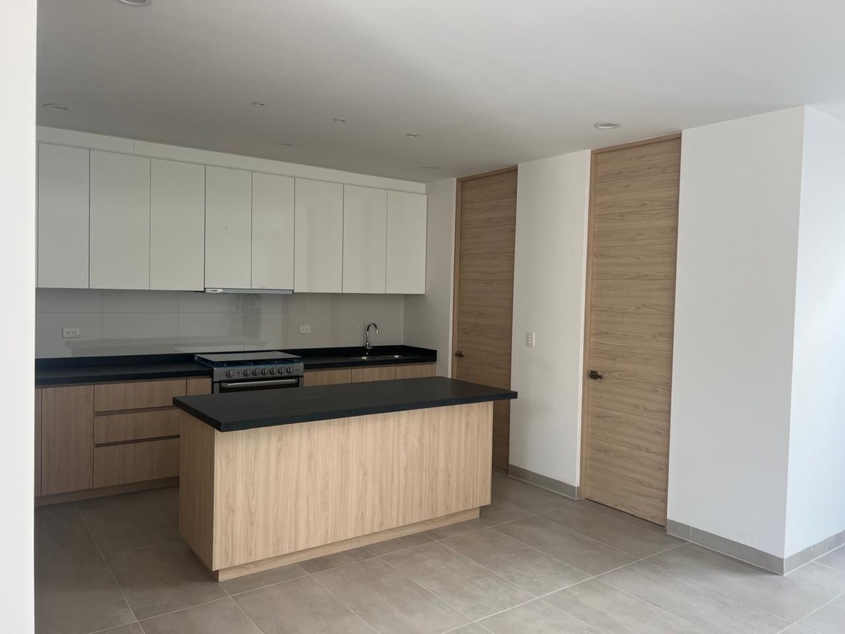 Cocina abierta con barra en medio y gran espacio de almacenamiento