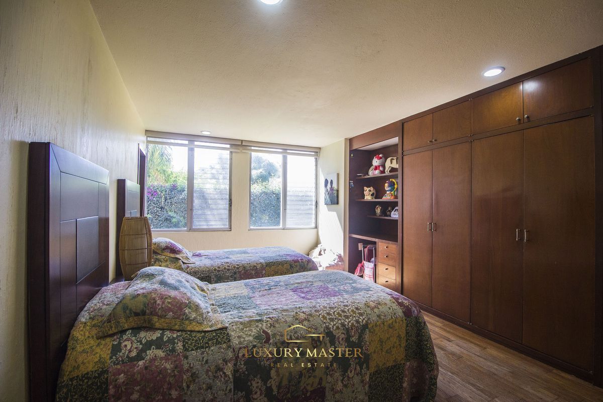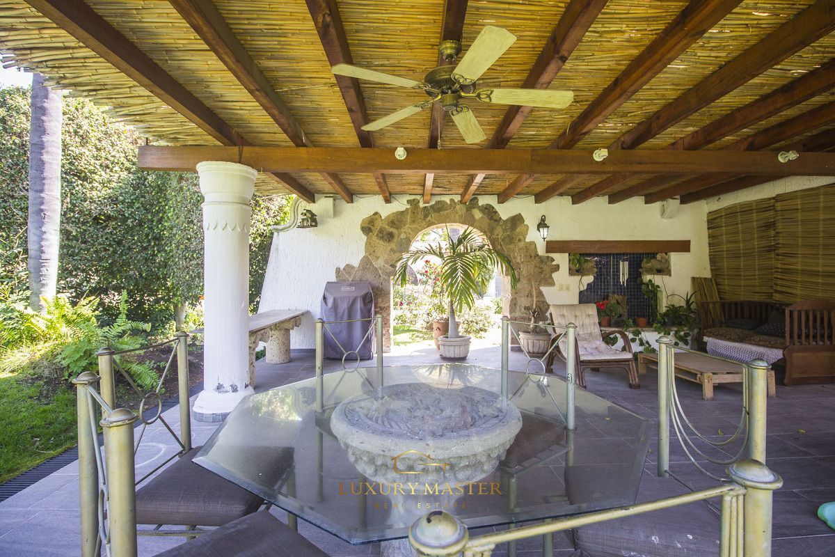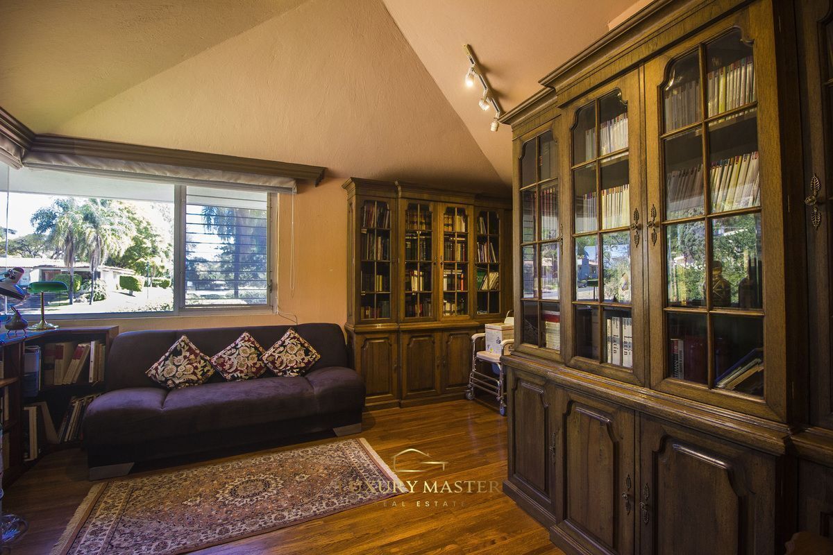 Beautiful residence located in front of the golf course, featuring a beautiful front garden, a lovely terrace, parking for 4 vehicles, upon entering the large house you will find a spacious foyer, a star room, and a living area with magnificent views of the golf course, a half bath for guests, and a small storage room. It also has a quite generous space for the dining room that opens to a beautiful backyard garden, a very spacious kitchen with a breakfast area, and a laundry room. There are two bedrooms on the ground floor, each with a full bathroom and closet; going up to the first floor you will find a very spacious library study, with a lovely view of the golf course, and another master bedroom with its bathroom and dressing room. In the small house or guest house that you will find connected by the backyard garden, there is a service room with its full bathroom, upon entering you have a living room with a fireplace, a kitchenette with its bar and breakfast area; two rooms, one of which has double height and a loft, and an open patio; the other with its closet and full bathroom with tub; in addition to another full bathroom.