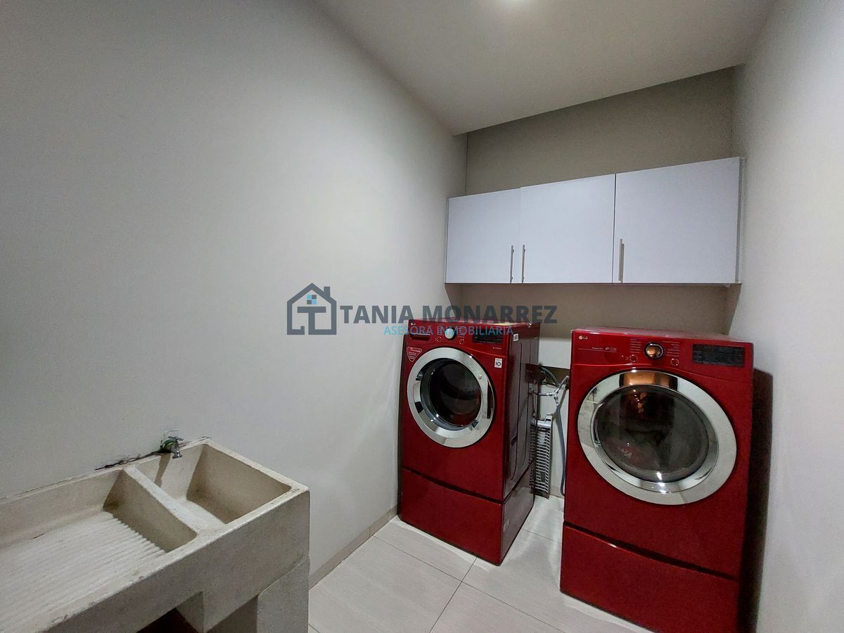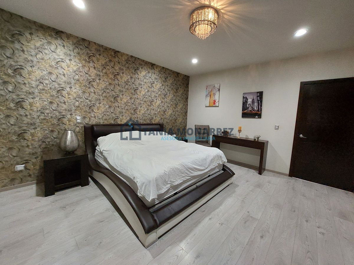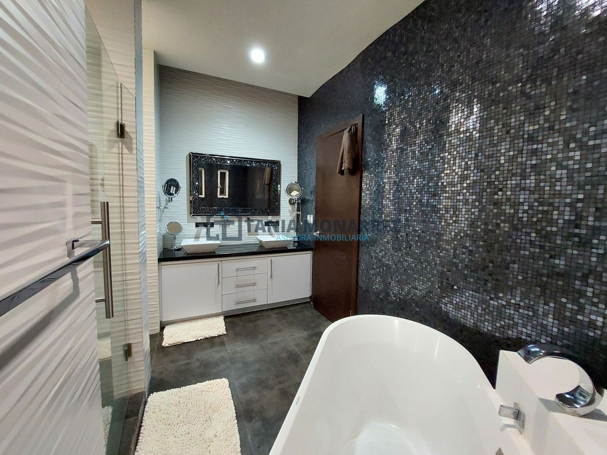House in one of the best private subdivisions in the south of the city, facing a green area, with a land area of 248 m2 and 360 m2 of construction on two floors. The ground floor has a garage for two cars, which includes two storage rooms for tools, has pedestrian access at the entrance, a reception area with a beautiful stone waterfall wall, a half bathroom, a very spacious living-dining room with a fireplace with stone and onyx details, a patio, a kitchen with an integral kitchen and an island, both with onyx countertops, includes appliances which are the stove and microwave, a pantry, a laundry room with a sink, a bedroom with its own bathroom and dressing room. The upper floor has a large living area for a TV room, a linen room, 3 bedrooms each with its own dressing room and bathroom, where the main one has a tub and a balcony overlooking the street.