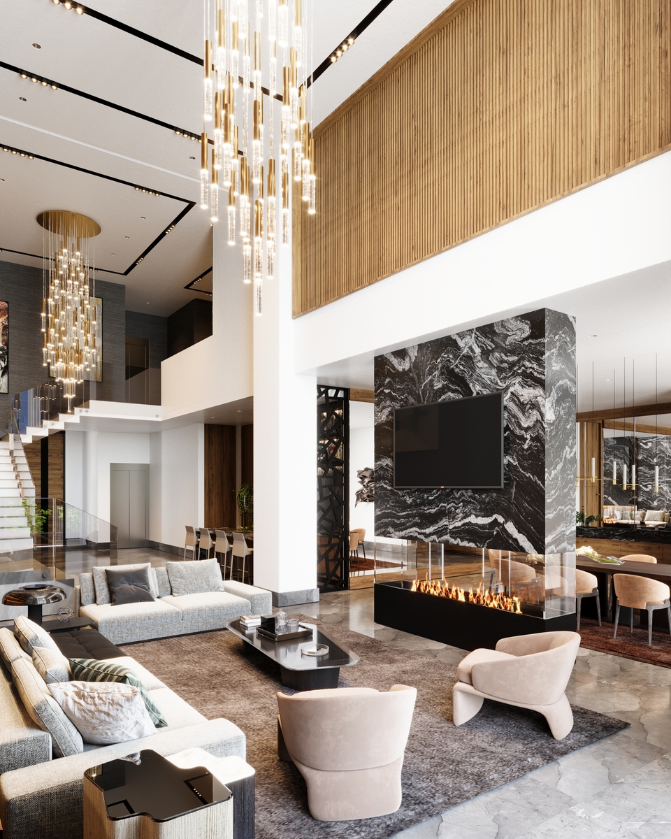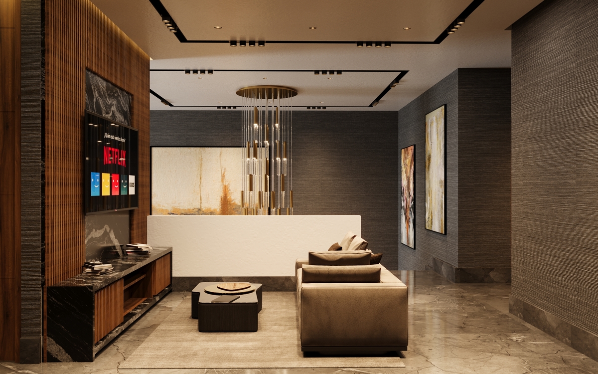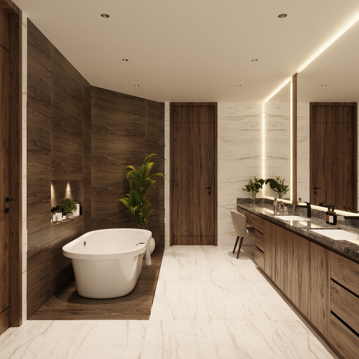 áreas comunes, y Piso porcelanato de 60x120, 60x90 y 19x59 cm en recámaras, baños, vestidores y exteriores.