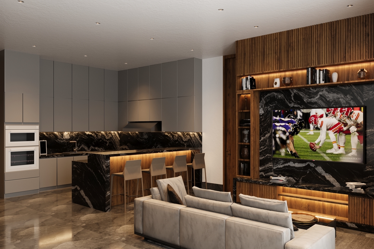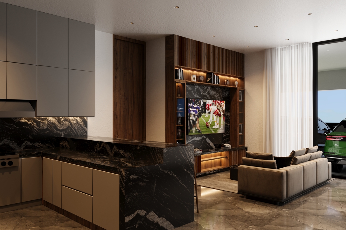 Cocina integral con isla y cubierta de cuarzo, despensa y puertas semisólidas con marco de 17 cm.