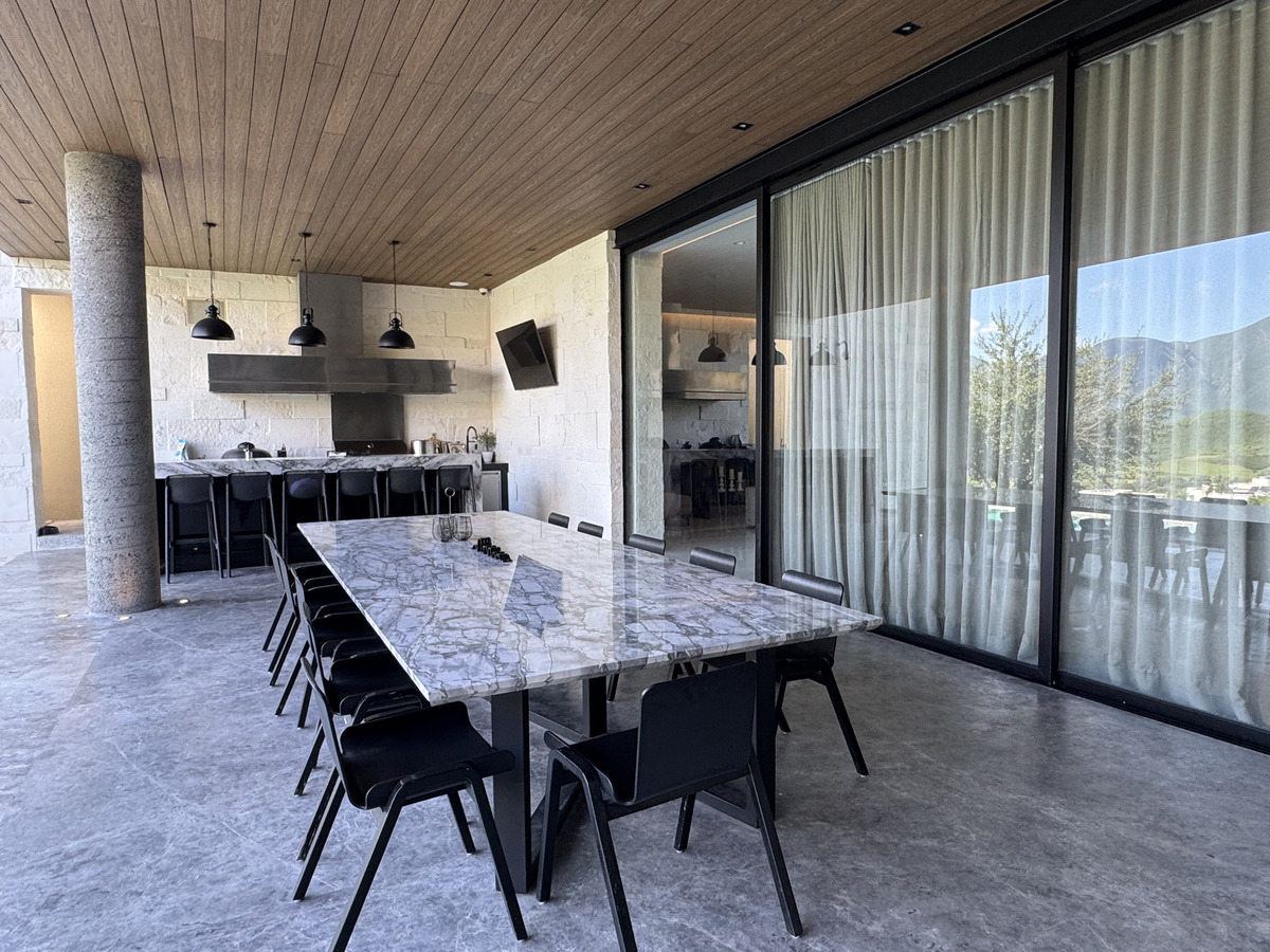 -Terraza techada, area de comedor para 12 personas, fogatera y área de asador completamente equipada con barra, asadores y extracción.