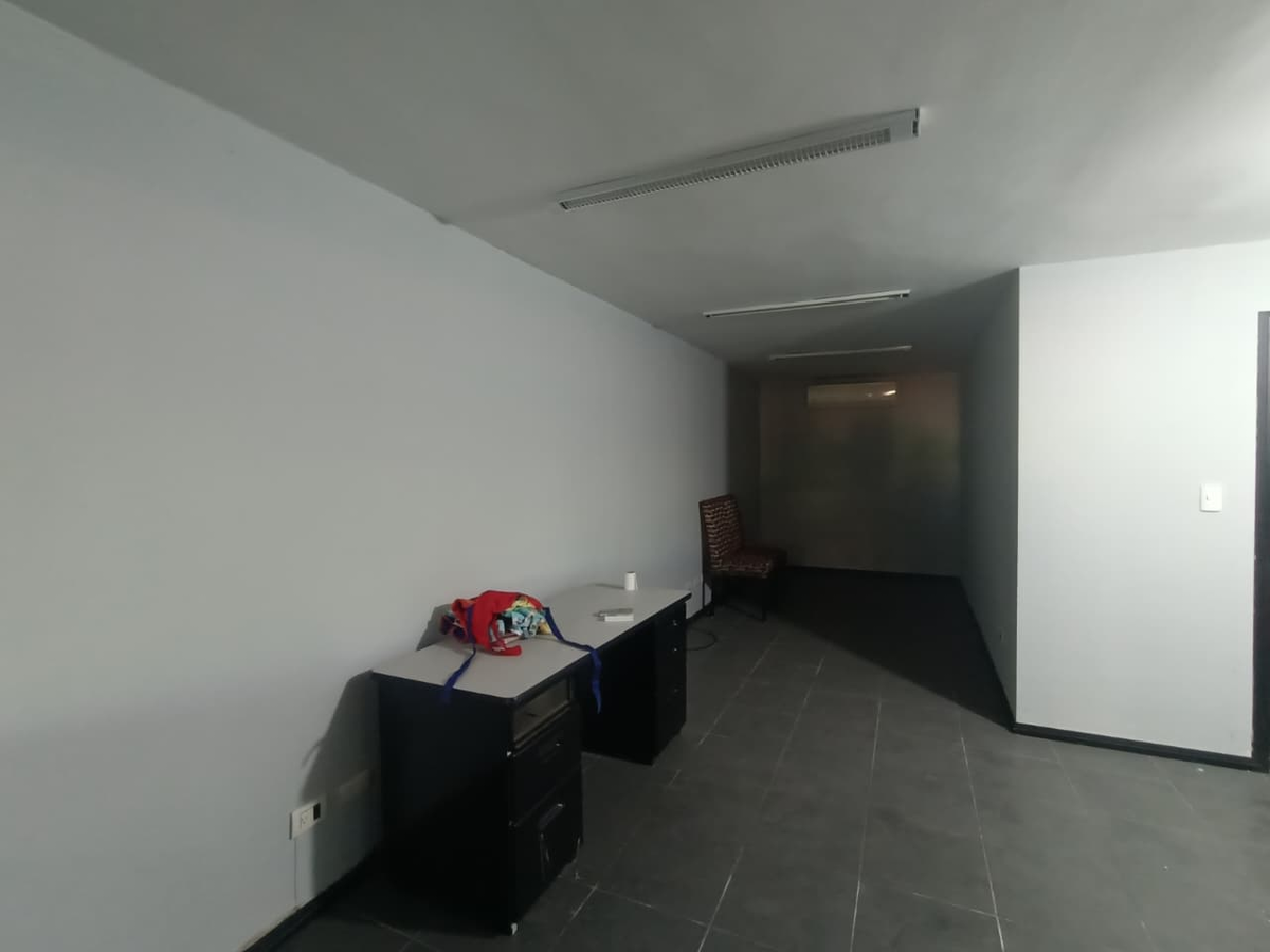 Planta baja: área de recepción/estancia, espacio para escritorios, medio baño, cocina integral equipada y patio con asador.