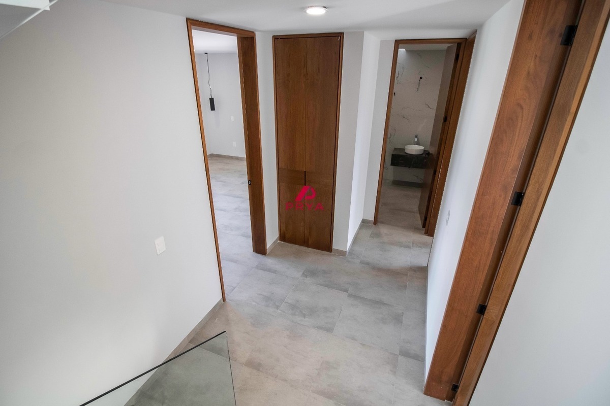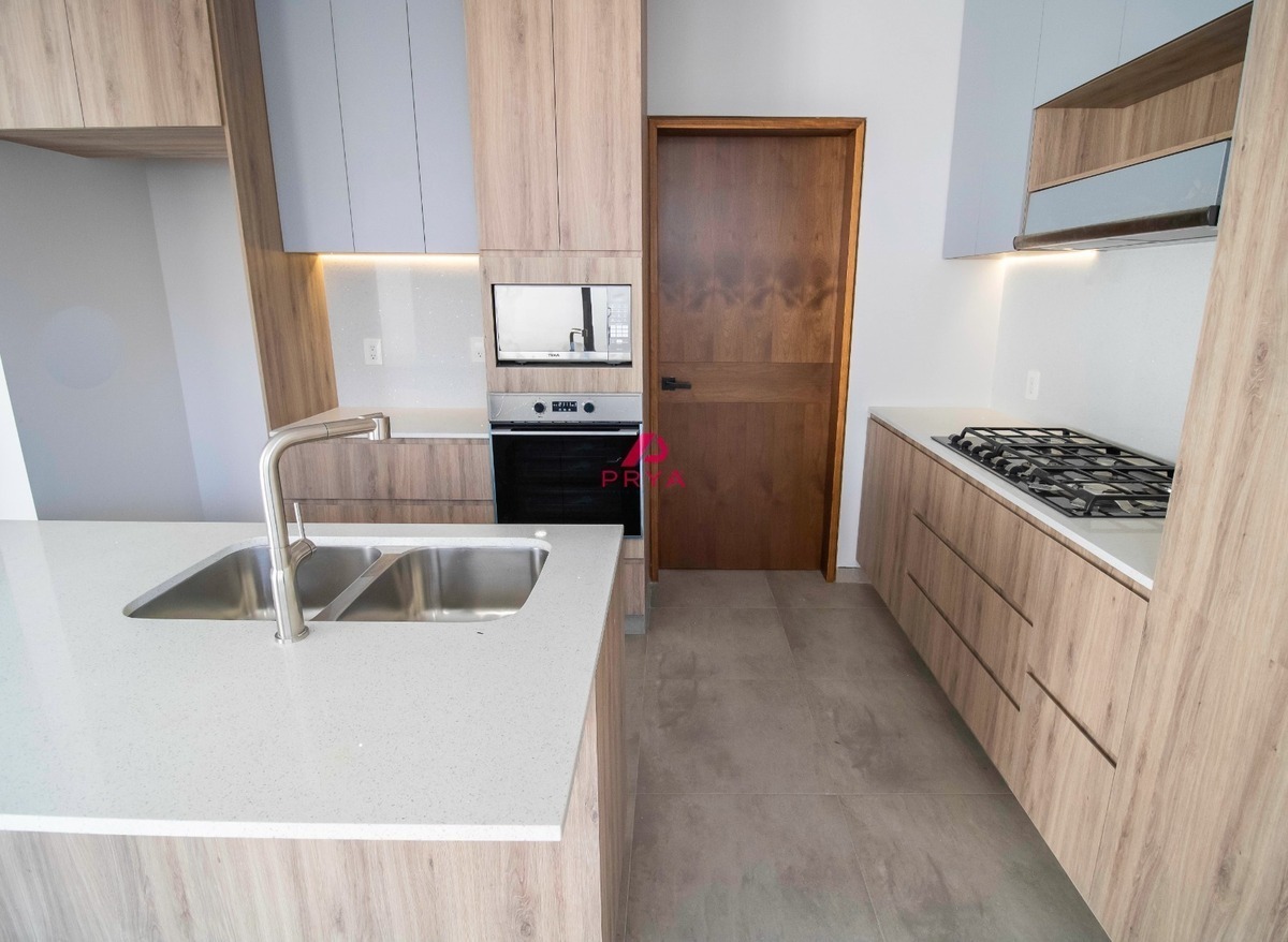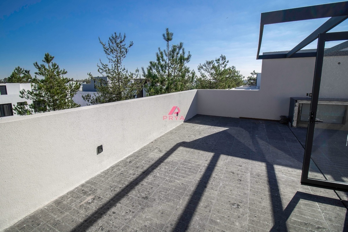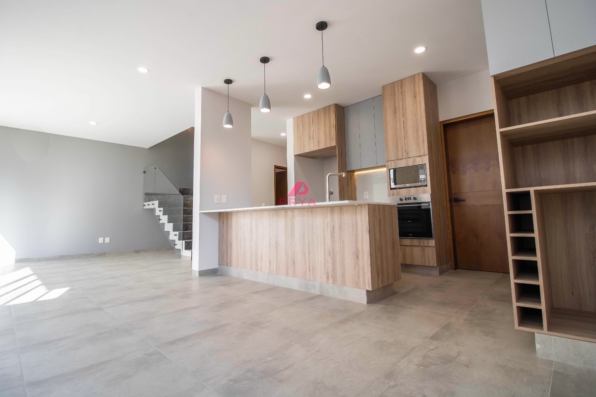 La casa cuenta con 3 recámaras, 3.5 baños y una cocina de ensueño en tonos blanco y nogal, equipada con electrodomésticos TEKA y una barra desayunadora para momentos inolvidables en familia. Los pisos de porcelanato y los acabados de yeso pulido añaden un toque de distinción. Además, podrás disfrutar de un roof garden privado, el lugar ideal para relajarte o compartir con tus seres queridos al aire libre.