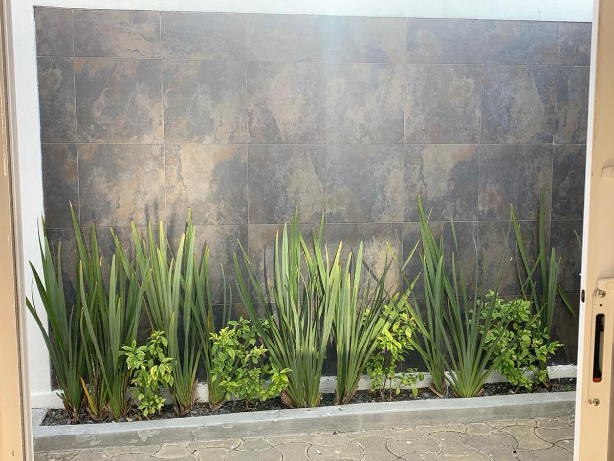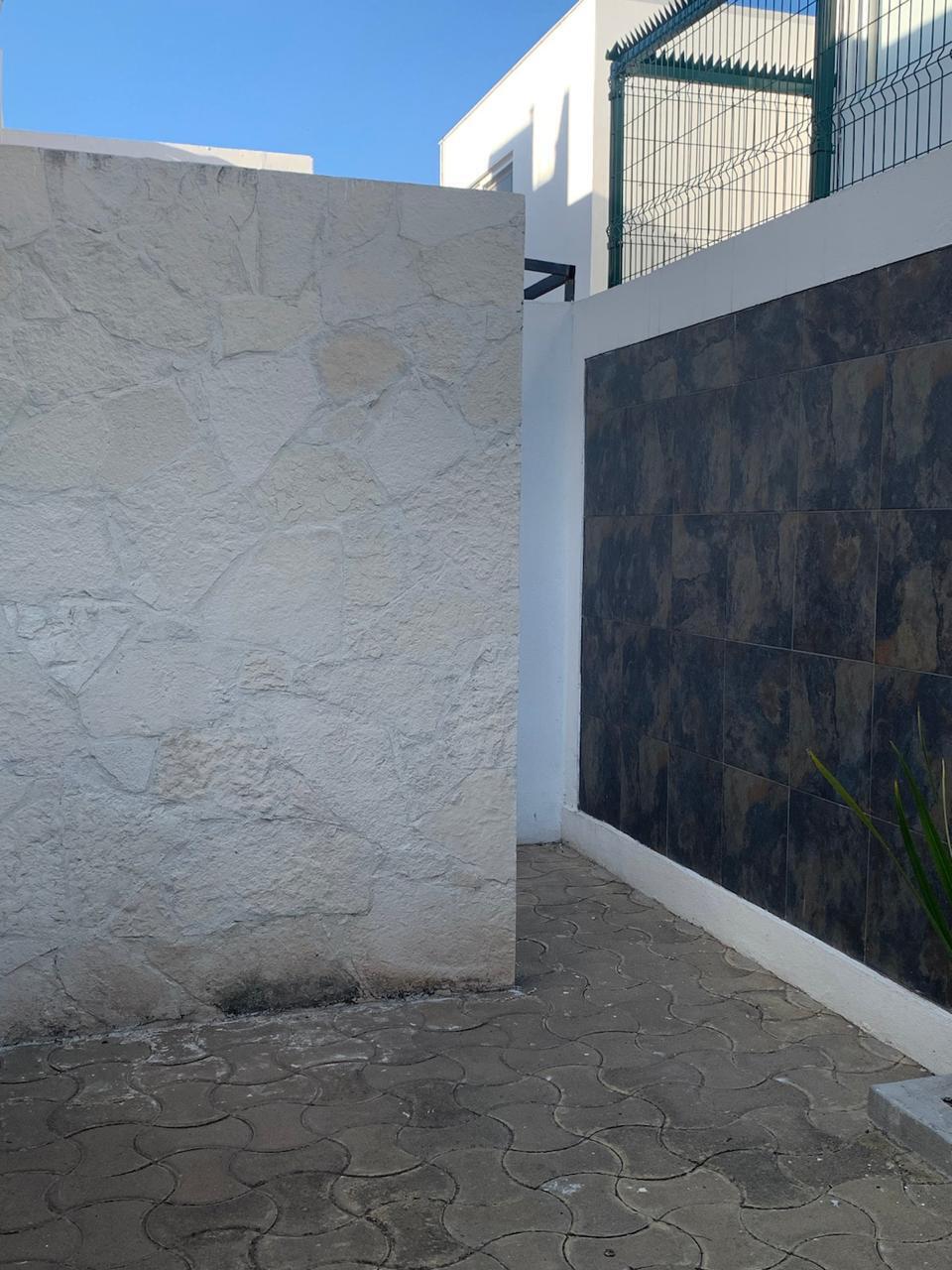 - Patio trasero con acabados de cantera, cerámica en muros y jardinera perimetral