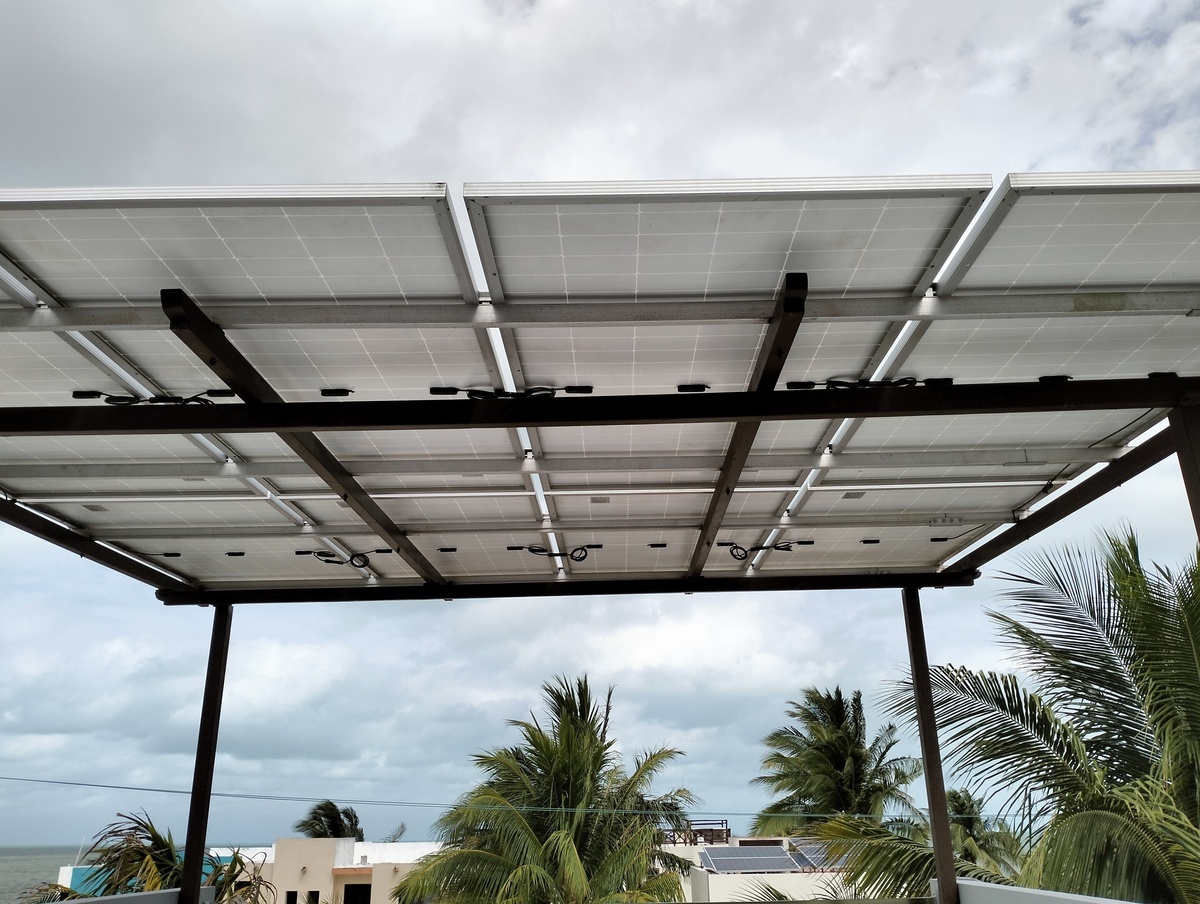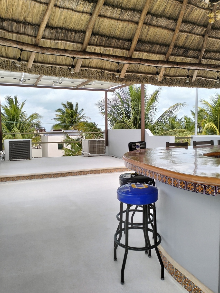 Roof top con bar, palapa y área social con vista parcial al mar.