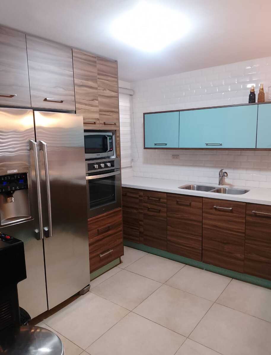 La cocina moderna con estufa y campana. Cuenta con suficientes gavetas para el almacenamiento.