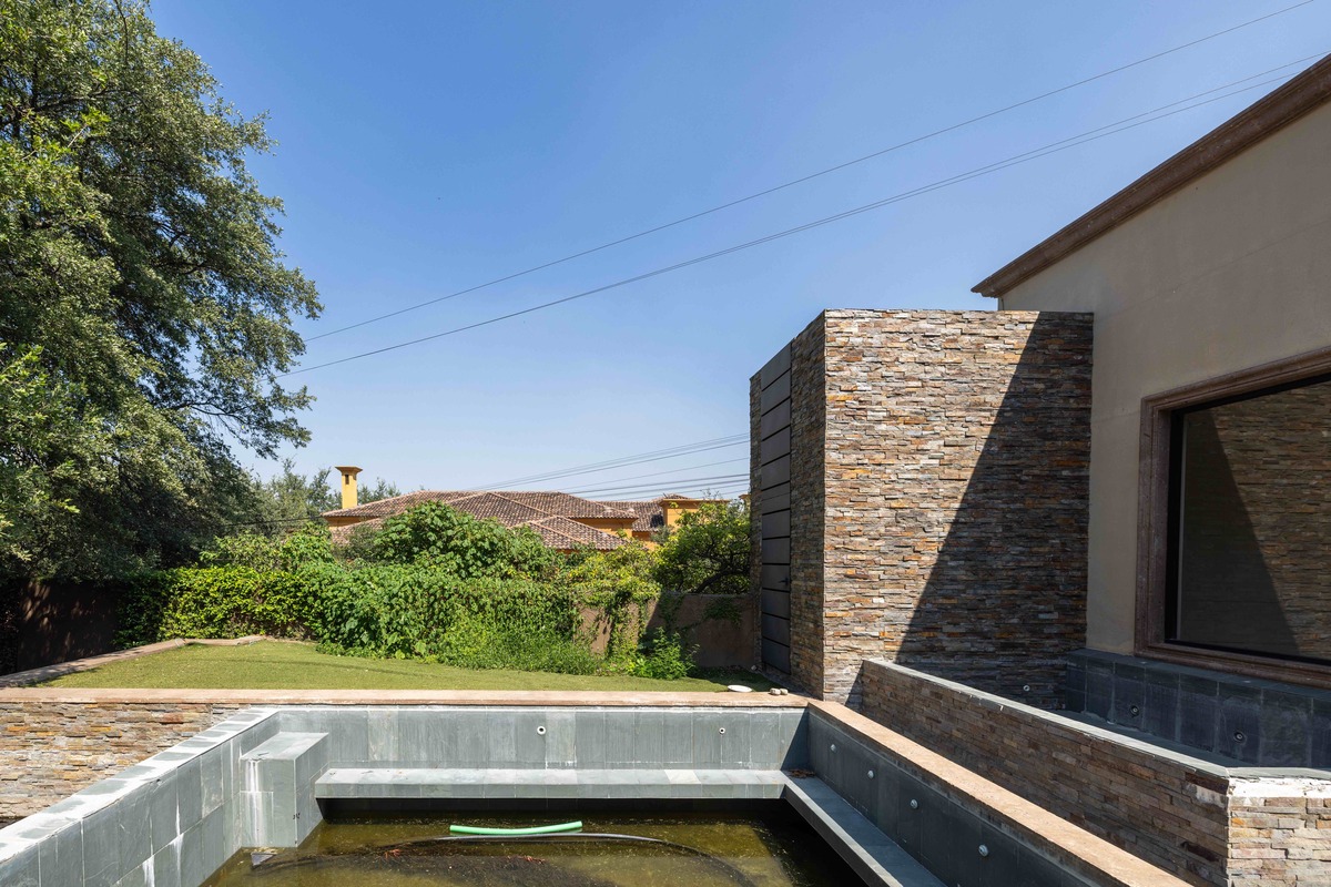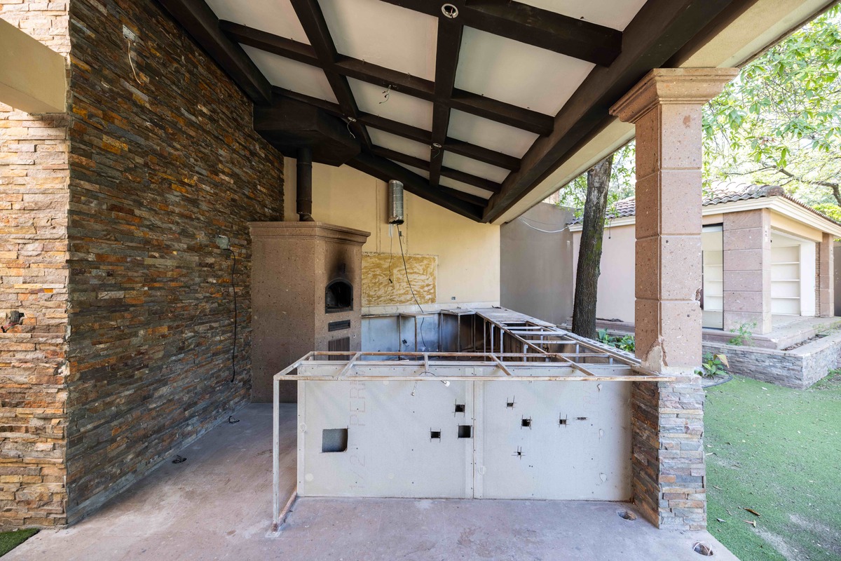 Tiene en el área exterior espacio alberca, palapa con sala de cine, terraza con asador. También tiene otro cuarto que puede ser oficina o gimnasio. Algo magnífico es que para accesar a toda esta área exterior lo puedes hacer por el frente trasero, por lo que amigos y familiares pueden llegar directamente a toda esta área social exterior sin siquiera entrar por la casa.