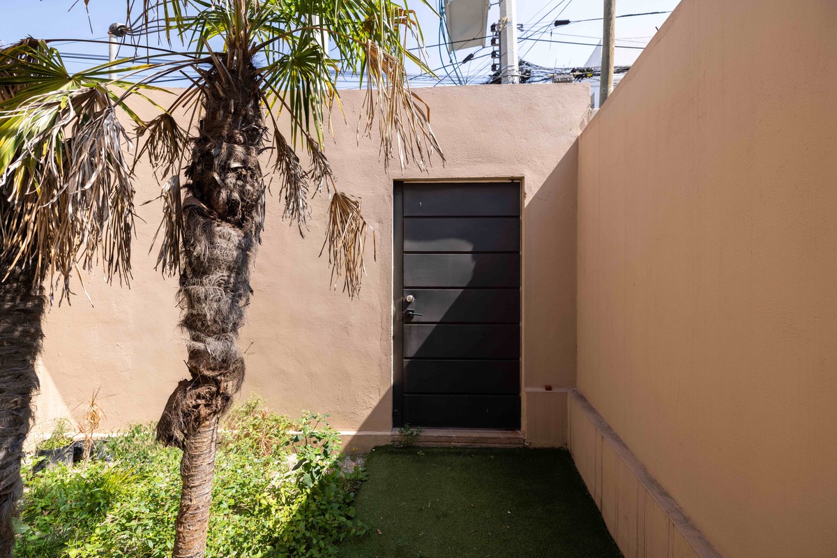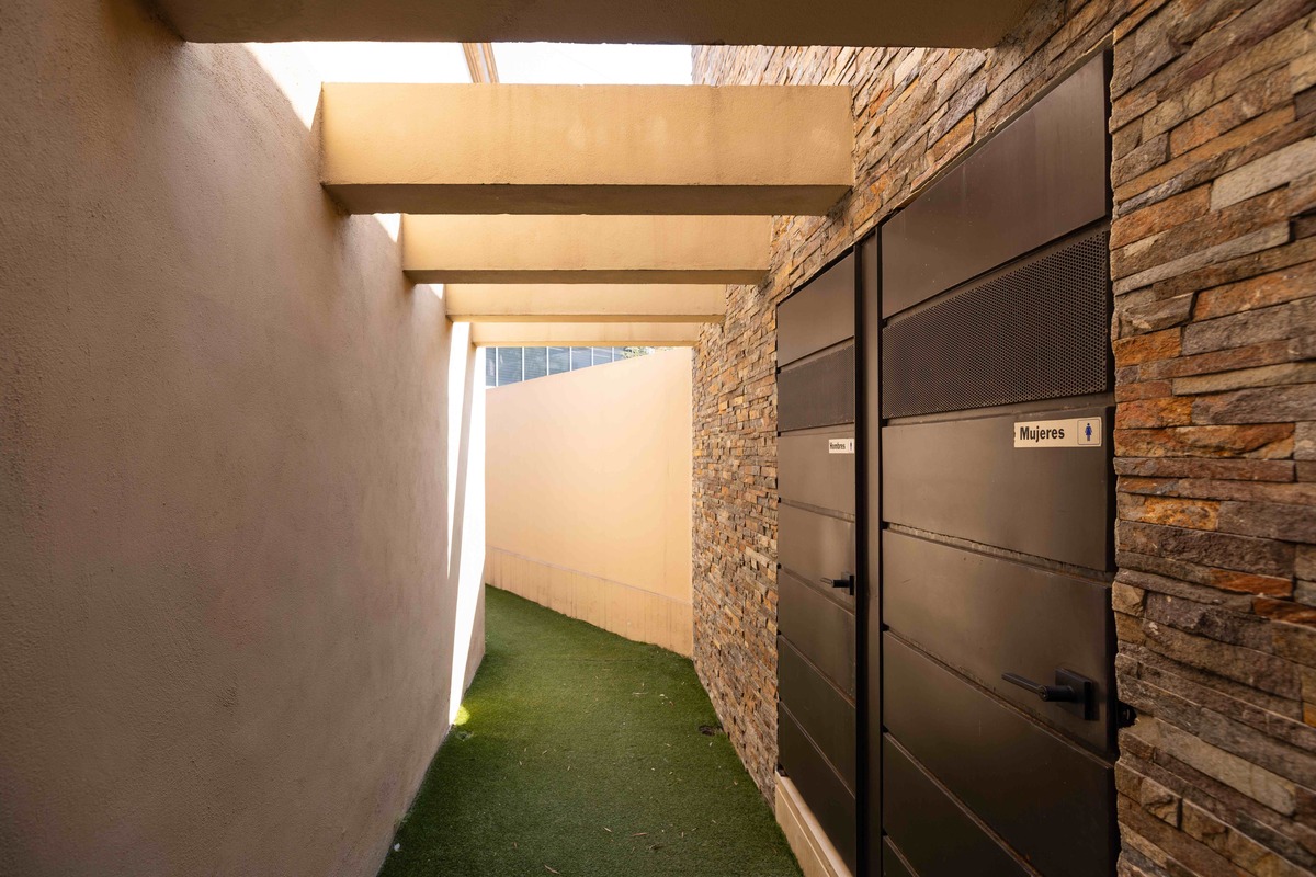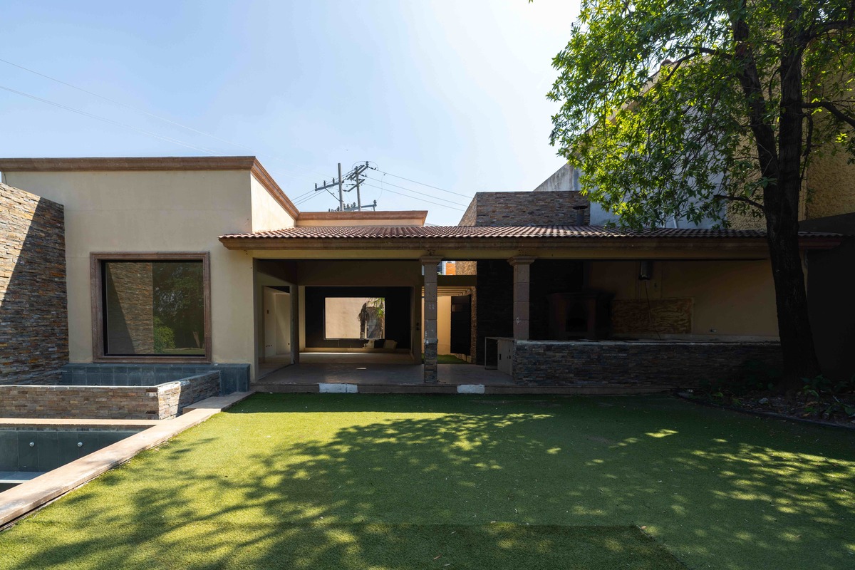 It has an outdoor area with a pool, a palapa with a cinema room, and a terrace with a grill. It also has another room that can be an office or gym. Something magnificent is that to access this entire outdoor area, you can do so from the back front, allowing friends and family to arrive directly to this entire outdoor social area without even entering the house.