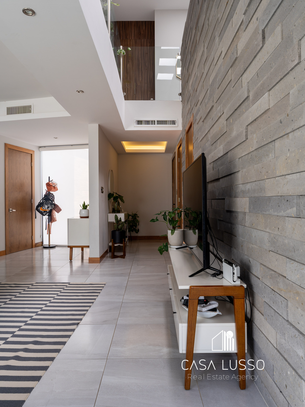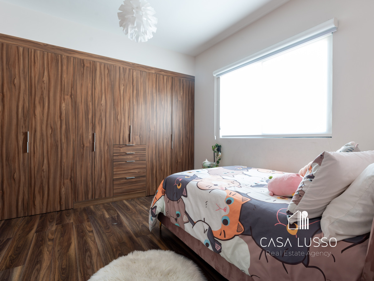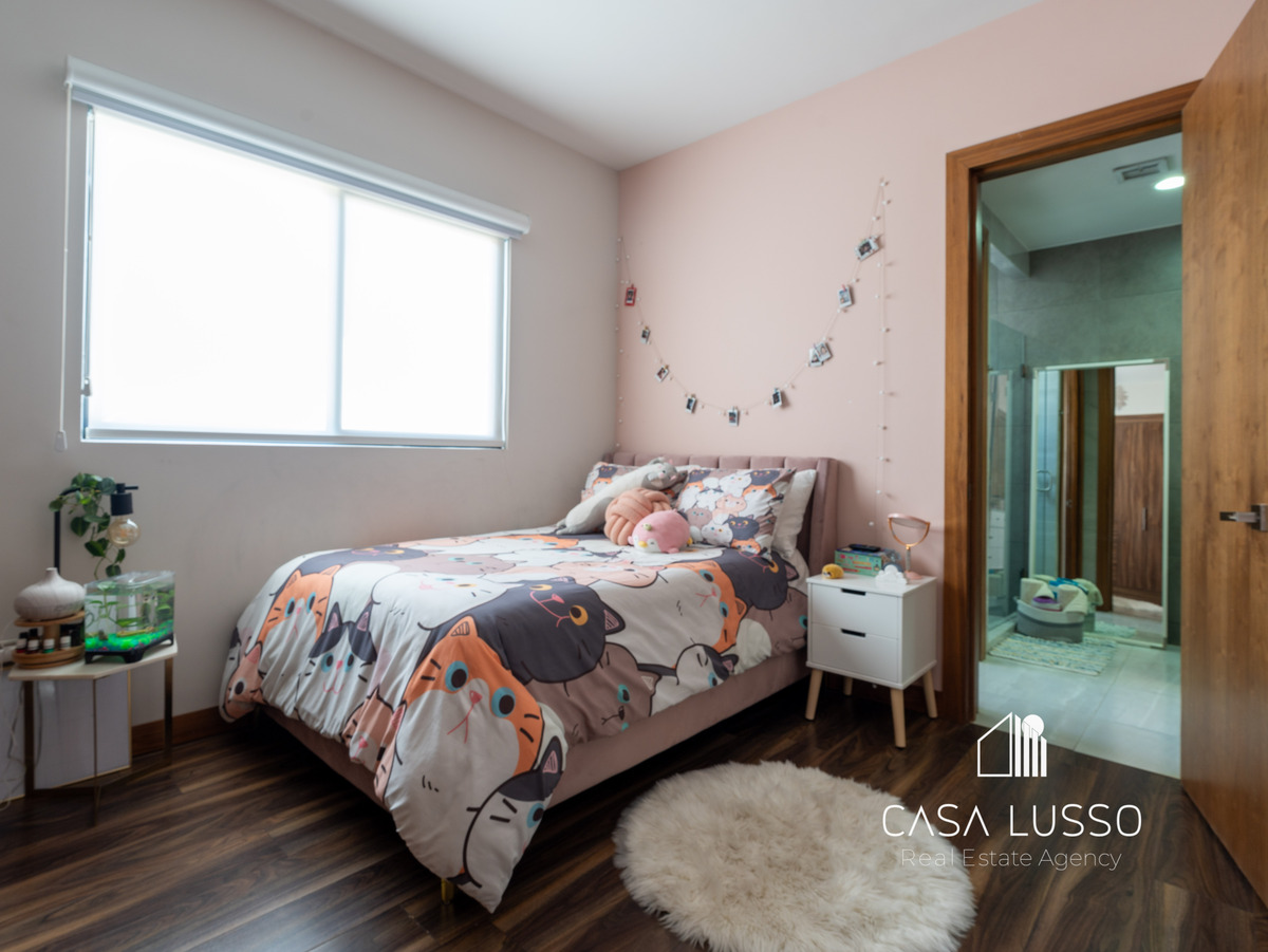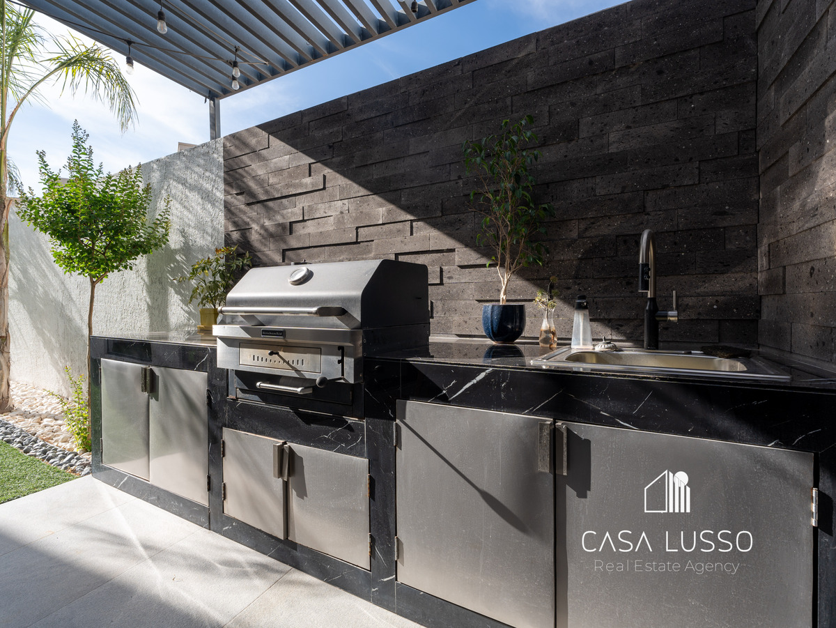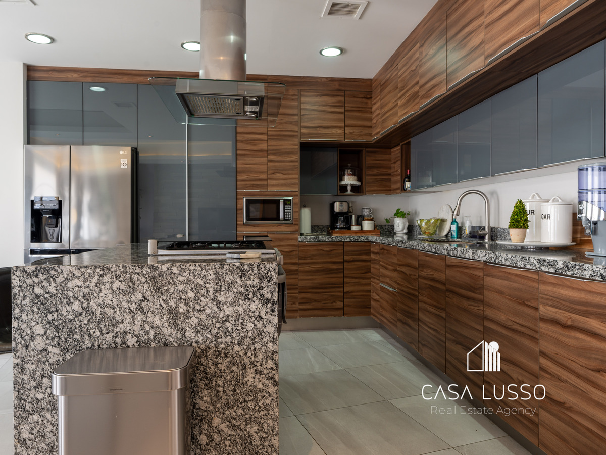 -Cocina de melamina alto brillo y granito, campana, estufa, microondas, refrigerador.