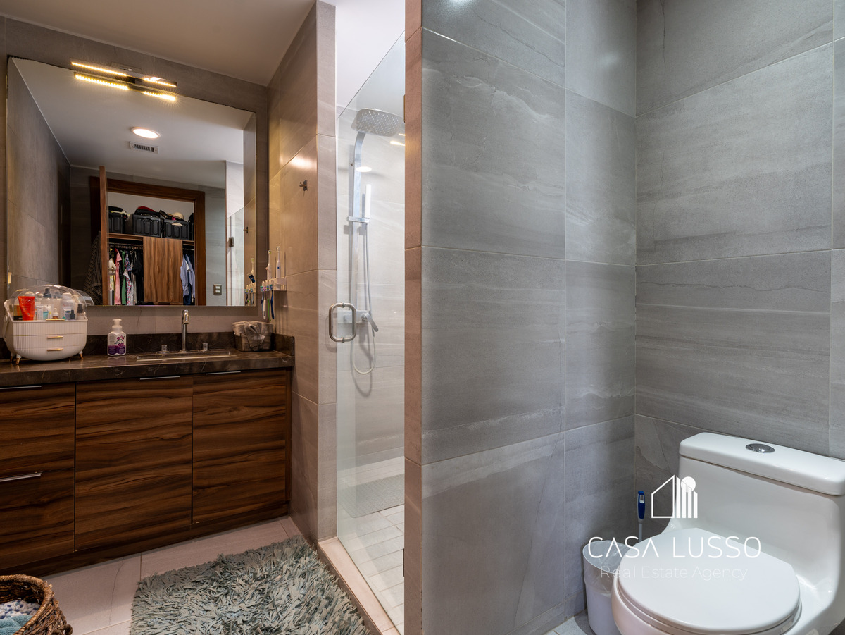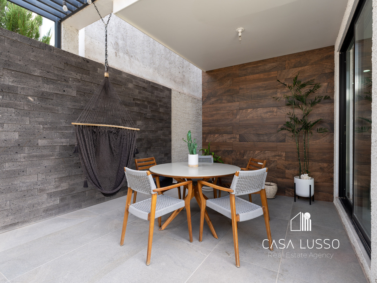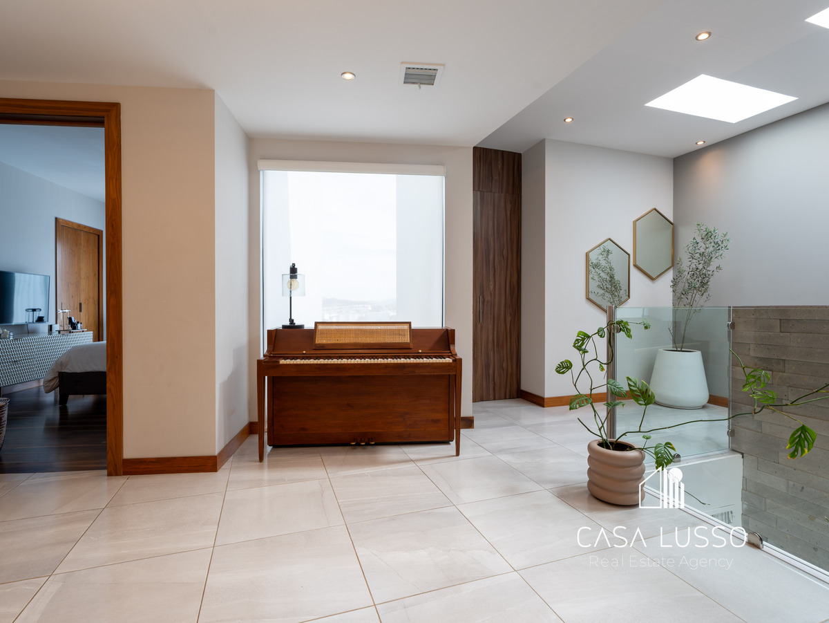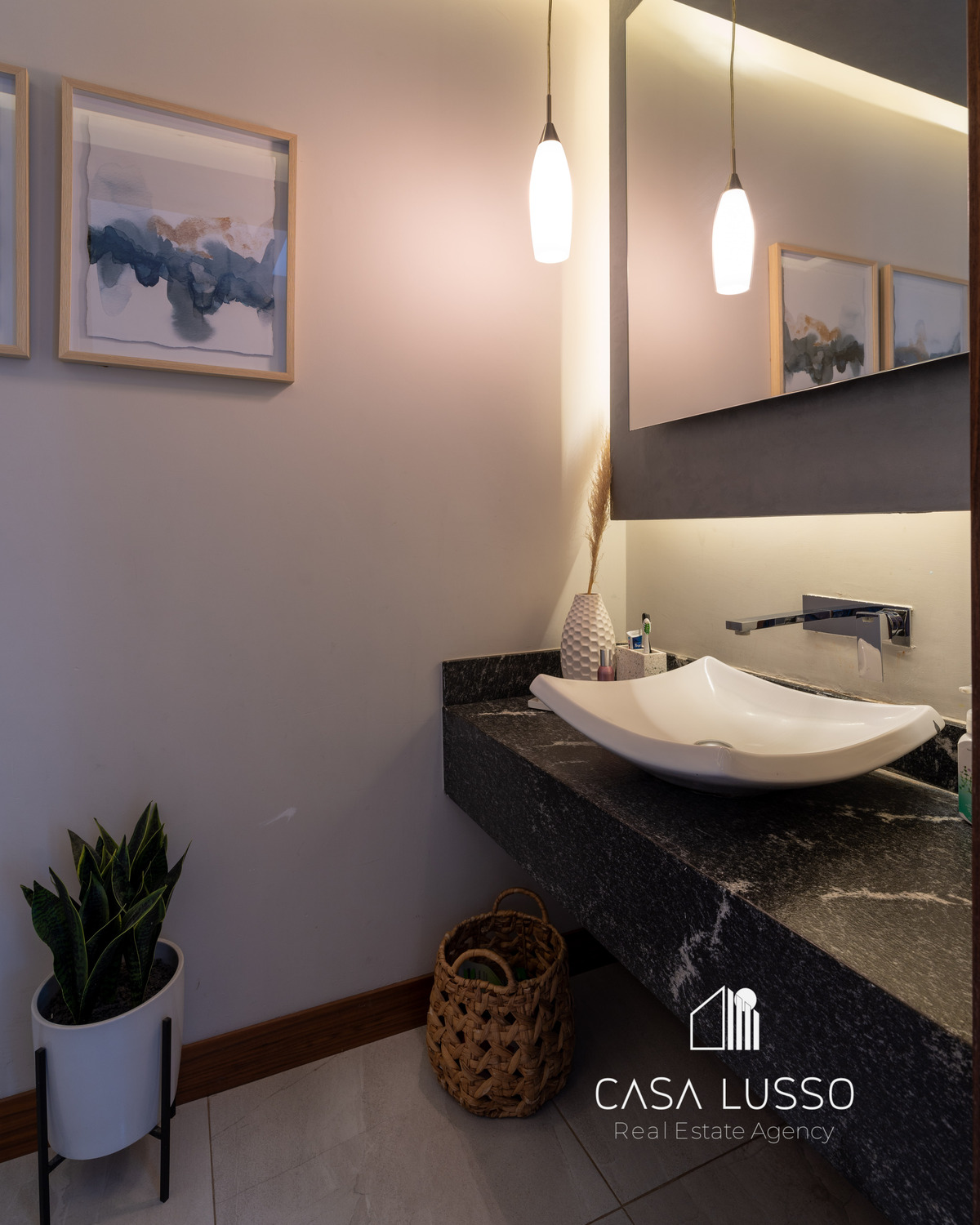 -Cocina de melamina alto brillo y granito, campana, estufa, microondas, refrigerador.
