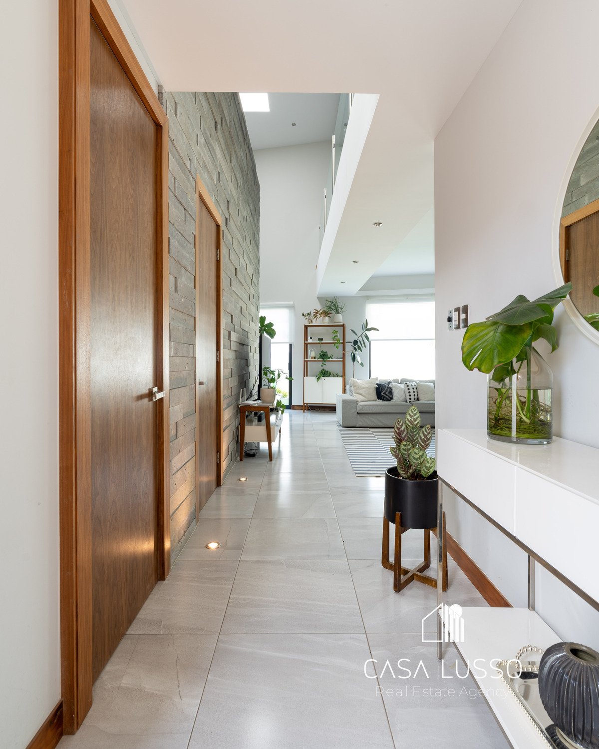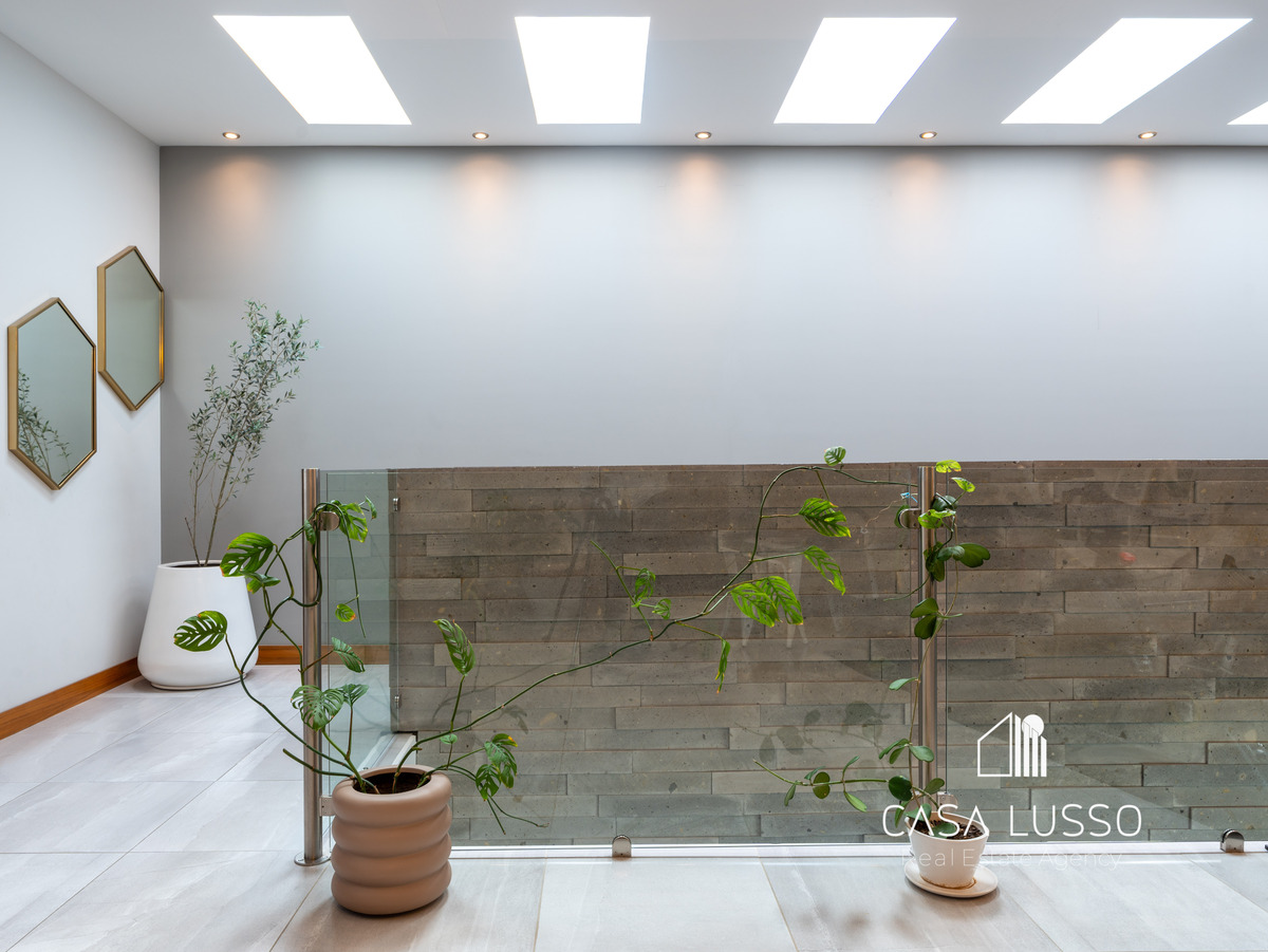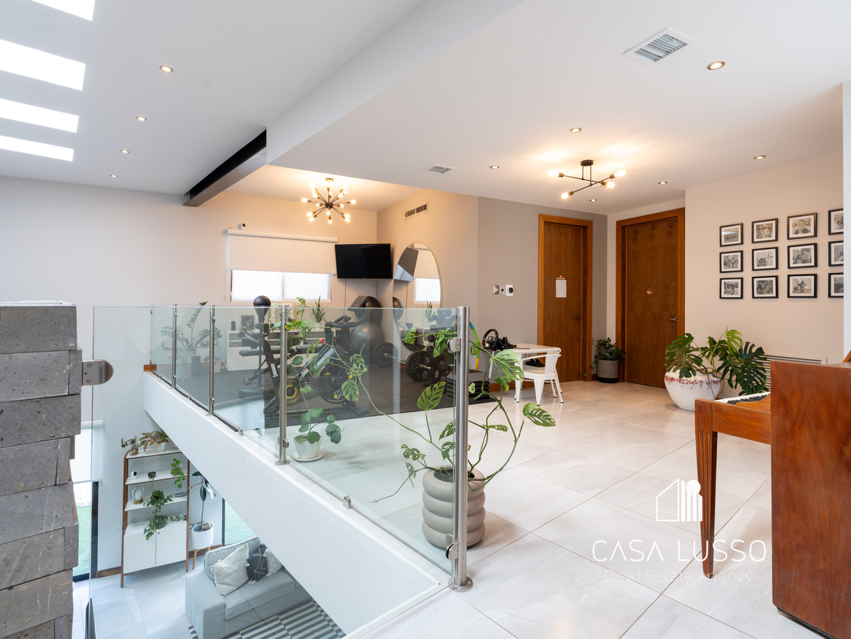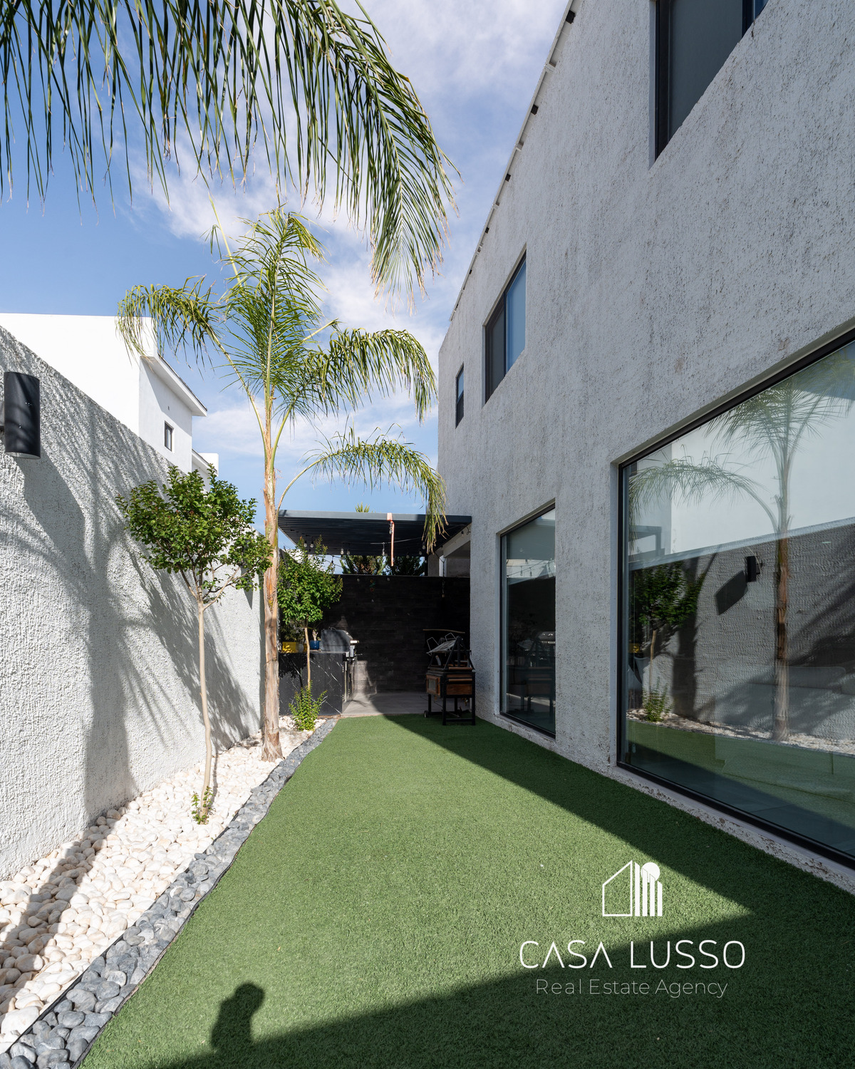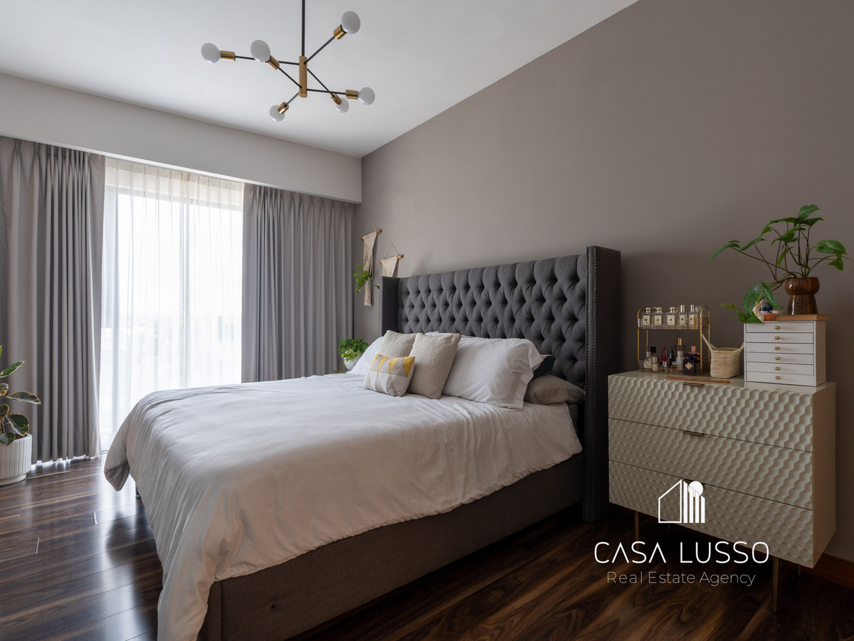 -Cocina de melamina alto brillo y granito, campana, estufa, microondas, refrigerador.