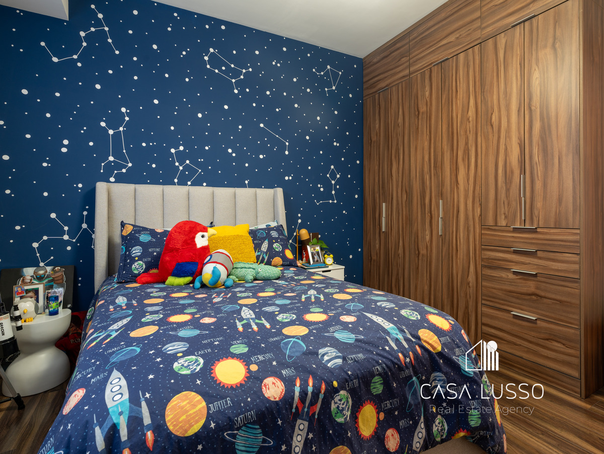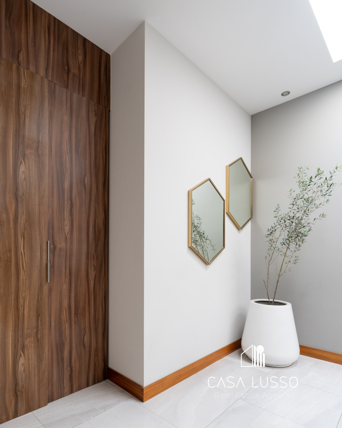 -High gloss melamine kitchen with granite, hood, stove, microwave, refrigerator.