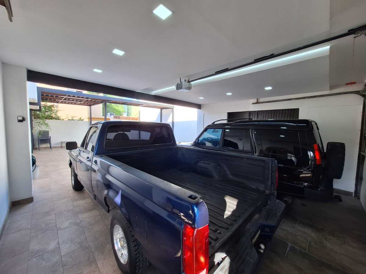 o Amplio garaje con portón color topo/café claro, ideal para resguardar varios vehículos de forma segura. El espacio interior de la cochera es espacioso, con iluminación integrada y altura suficiente para acomodar vehículos grandes (como se aprecia en la imagen con la camioneta y la pick-up).