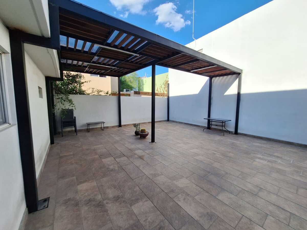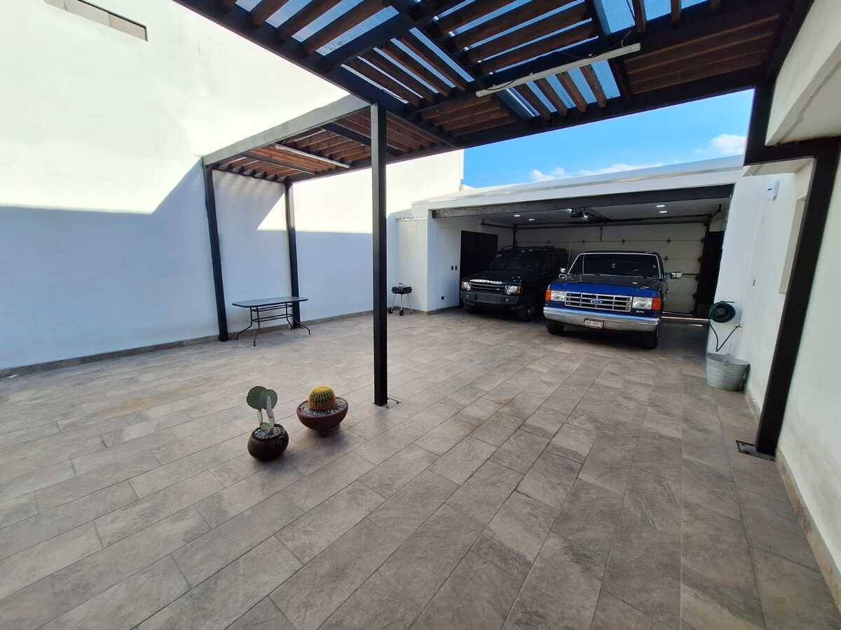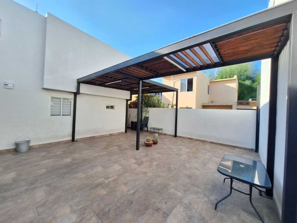 • Patio/Terraza Exterior: Disfruta de una zona de estar al aire libre resguardada por una pérgola moderna con estructura metálica y cubierta de madera con policarbonato o vidrio que permite el paso de la luz natural, creando un rincón perfecto para relajarse. El piso de esta zona es de loseta cerámica o porcelanato en tonos tierra.