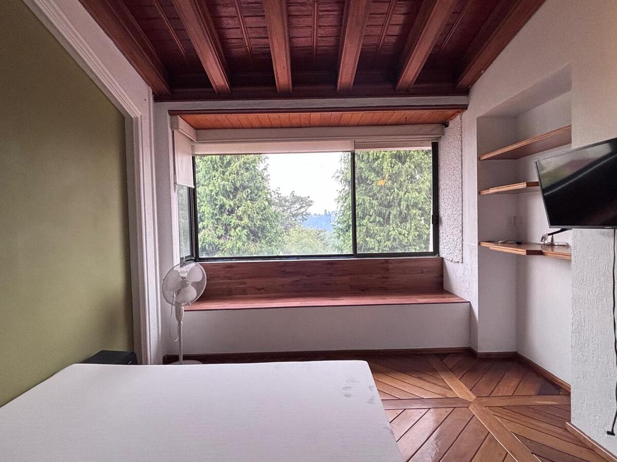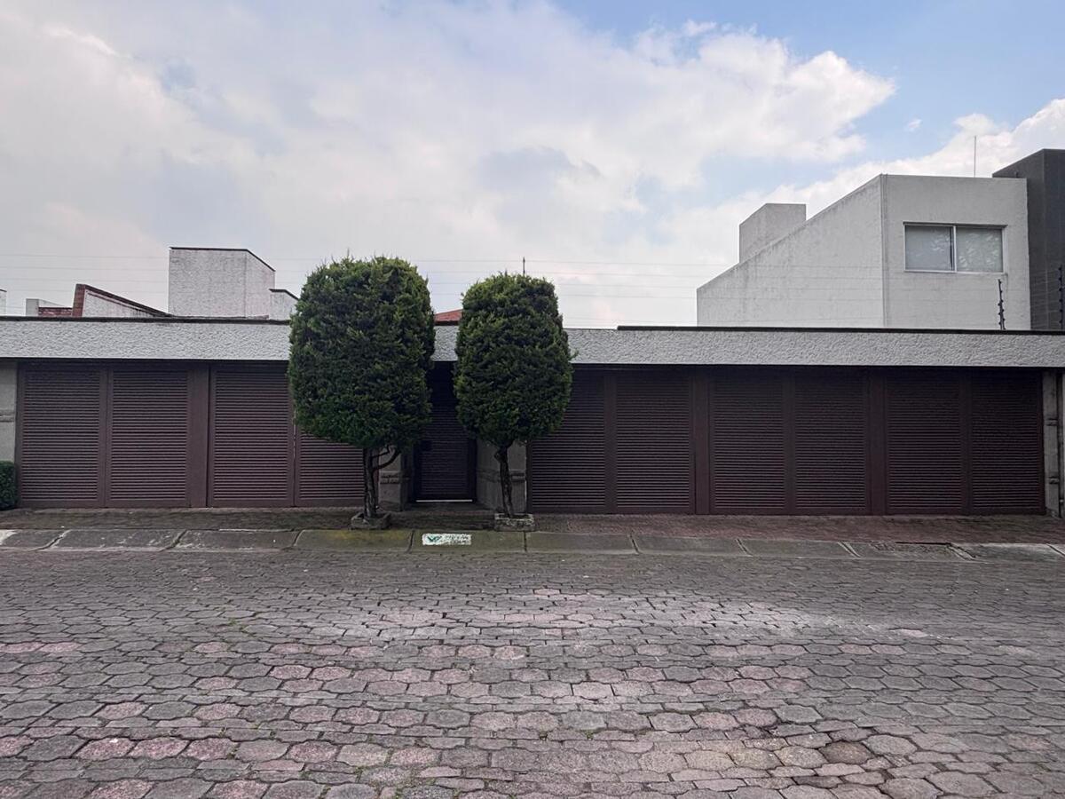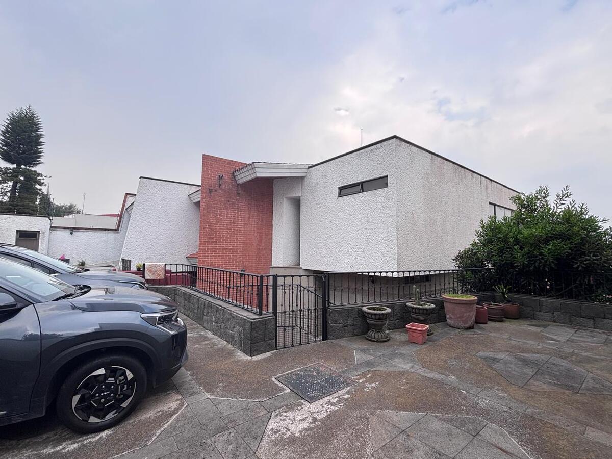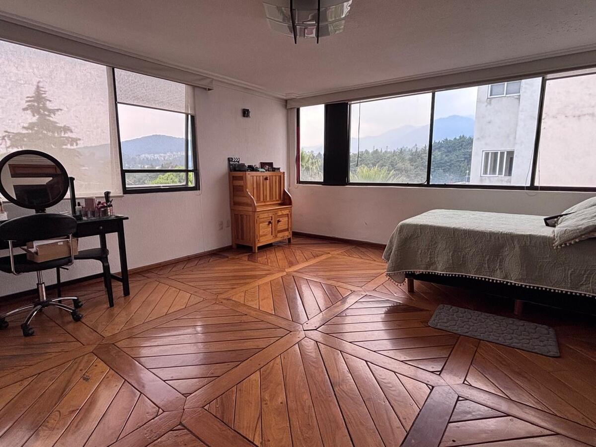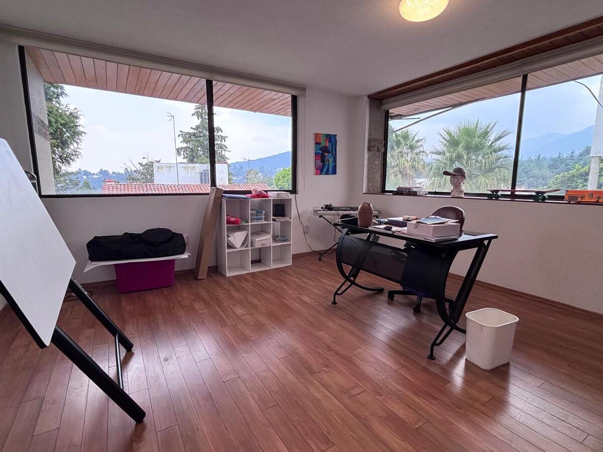 La casa está construida sobre 2 terrenos y está distribuida en medios niveles; en el piso nivel calle se encuentran sala y comedor , con fabulosas vistas verdes, con chimenea y agradable terraza; además cocina cerrada, con salida al Antecomedor, medio baño de visitas y una cuarta recámara con vestidor y baño. En el siguiente nivel sala de TV y 3 amplias recámaras, la principal con vestidor y baño con jacuzzi, una secundaria con clóset y baño y una tercera con clóset, además un estudio que podría funcionar como una quinta recámara., la casa con techos doble altura, mucha madera, y mucha luz.