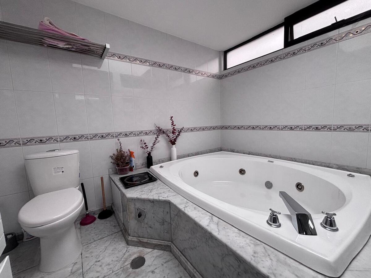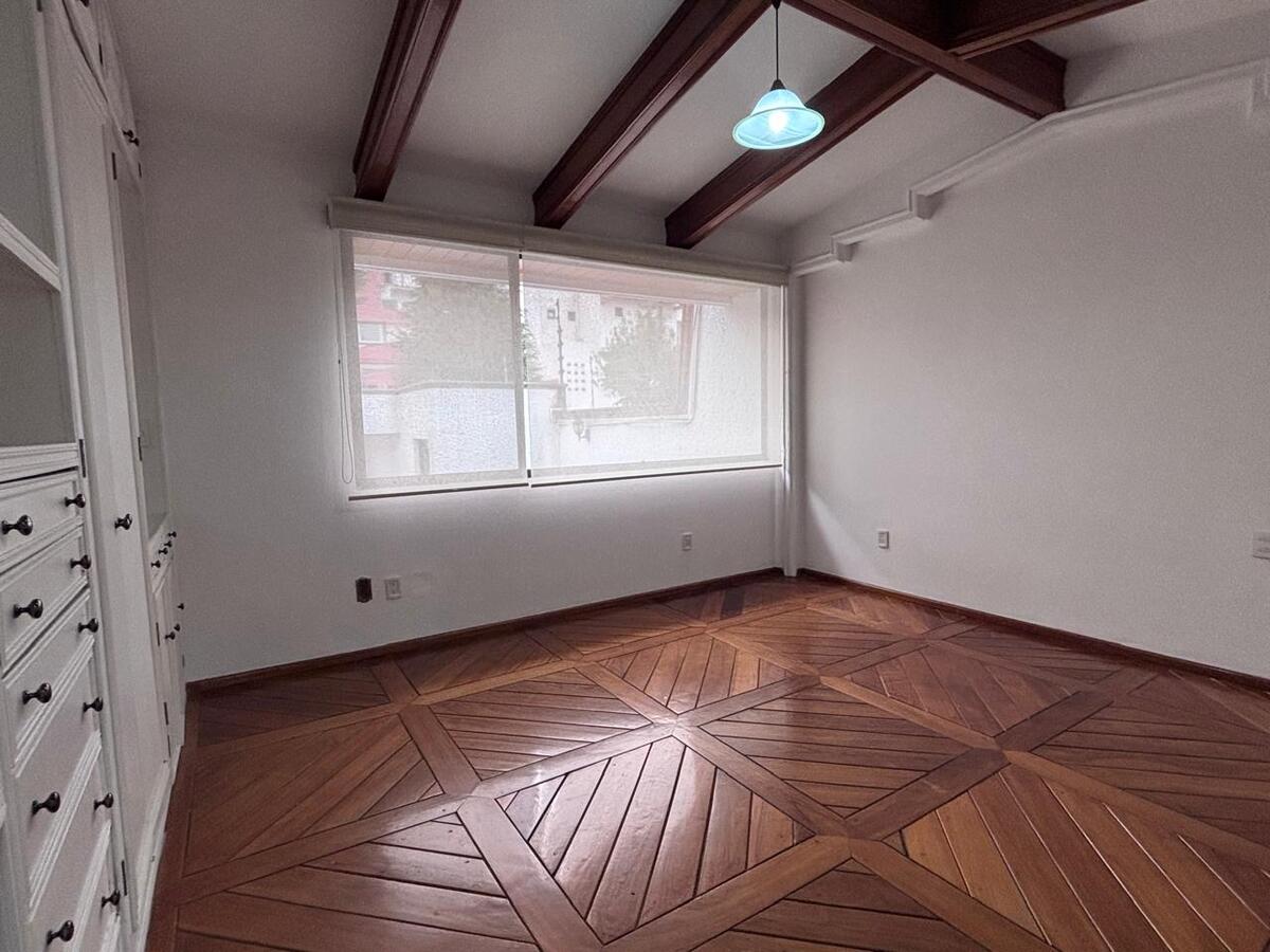 The house is built on 2 lots and is distributed over half levels; on the street level floor, there is a living room and dining room, with fabulous green views, a fireplace, and a pleasant terrace; also a closed kitchen, with access to the breakfast area, a half bathroom for guests, and a fourth bedroom with a dressing room and bathroom. On the next level, there is a TV room and 3 spacious bedrooms, the main one with a dressing room and bathroom with a jacuzzi, one secondary with a closet and bathroom, and a third with a closet, plus a study that could function as a fifth bedroom. The house has double-height ceilings, a lot of wood, and plenty of light.