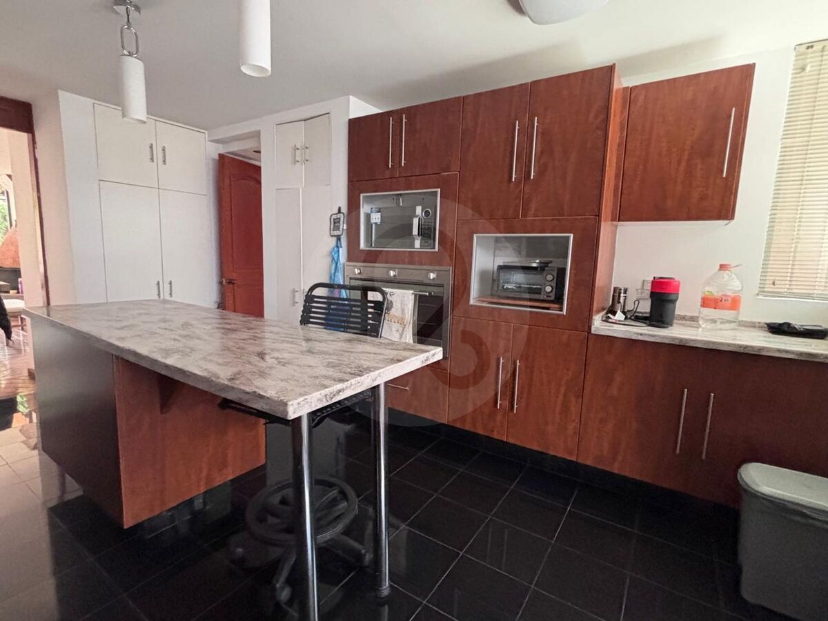 The house is built on 2 lots and is distributed over half levels; on the street level floor, there is a living room and dining room, with fabulous green views, a fireplace, and a pleasant terrace; also a closed kitchen, with access to the breakfast area, a half bathroom for guests, and a fourth bedroom with a dressing room and bathroom. On the next level, there is a TV room and 3 spacious bedrooms, the main one with a dressing room and bathroom with a jacuzzi, one secondary with a closet and bathroom, and a third with a closet, plus a study that could function as a fifth bedroom. The house has double-height ceilings, a lot of wood, and plenty of light.