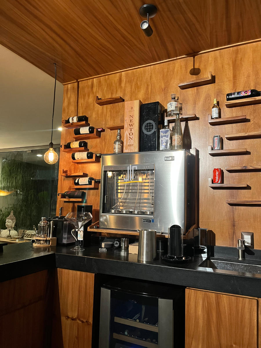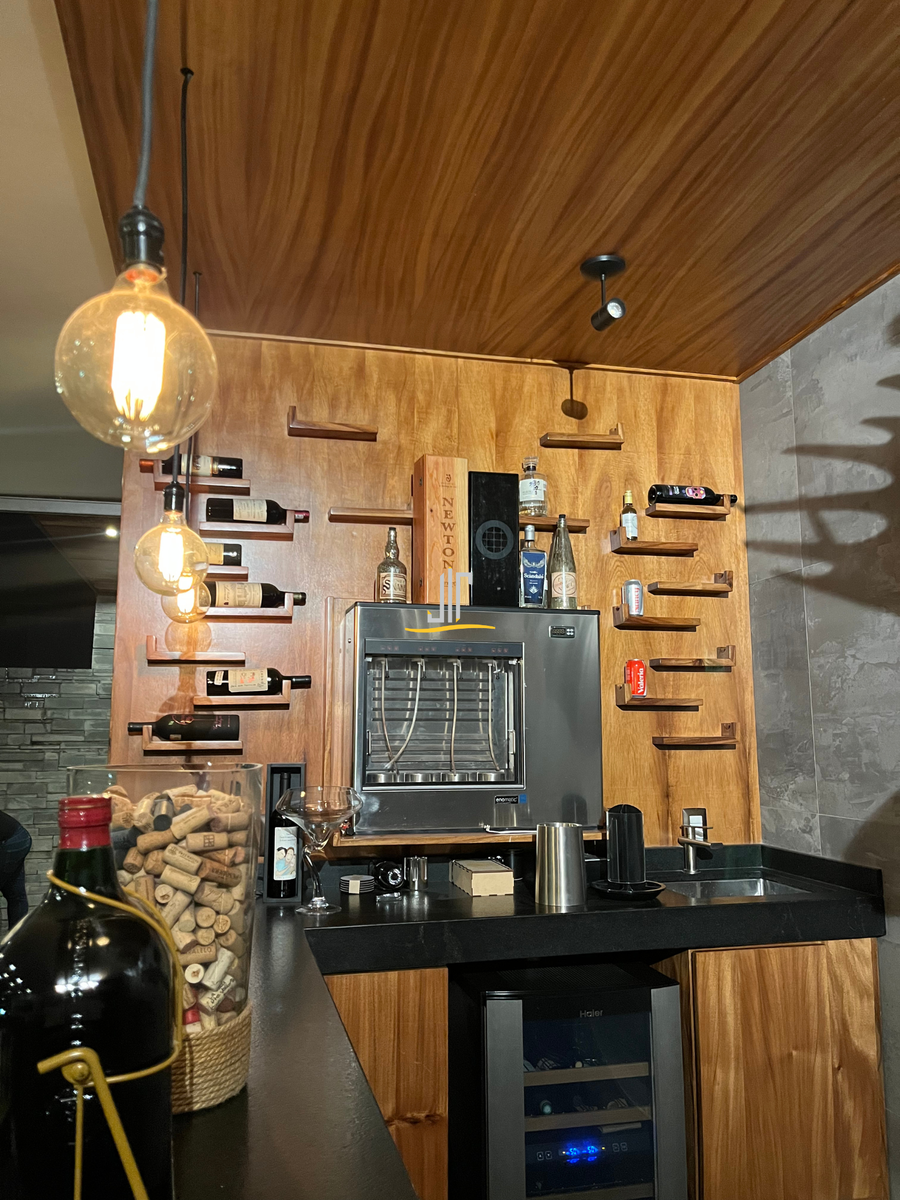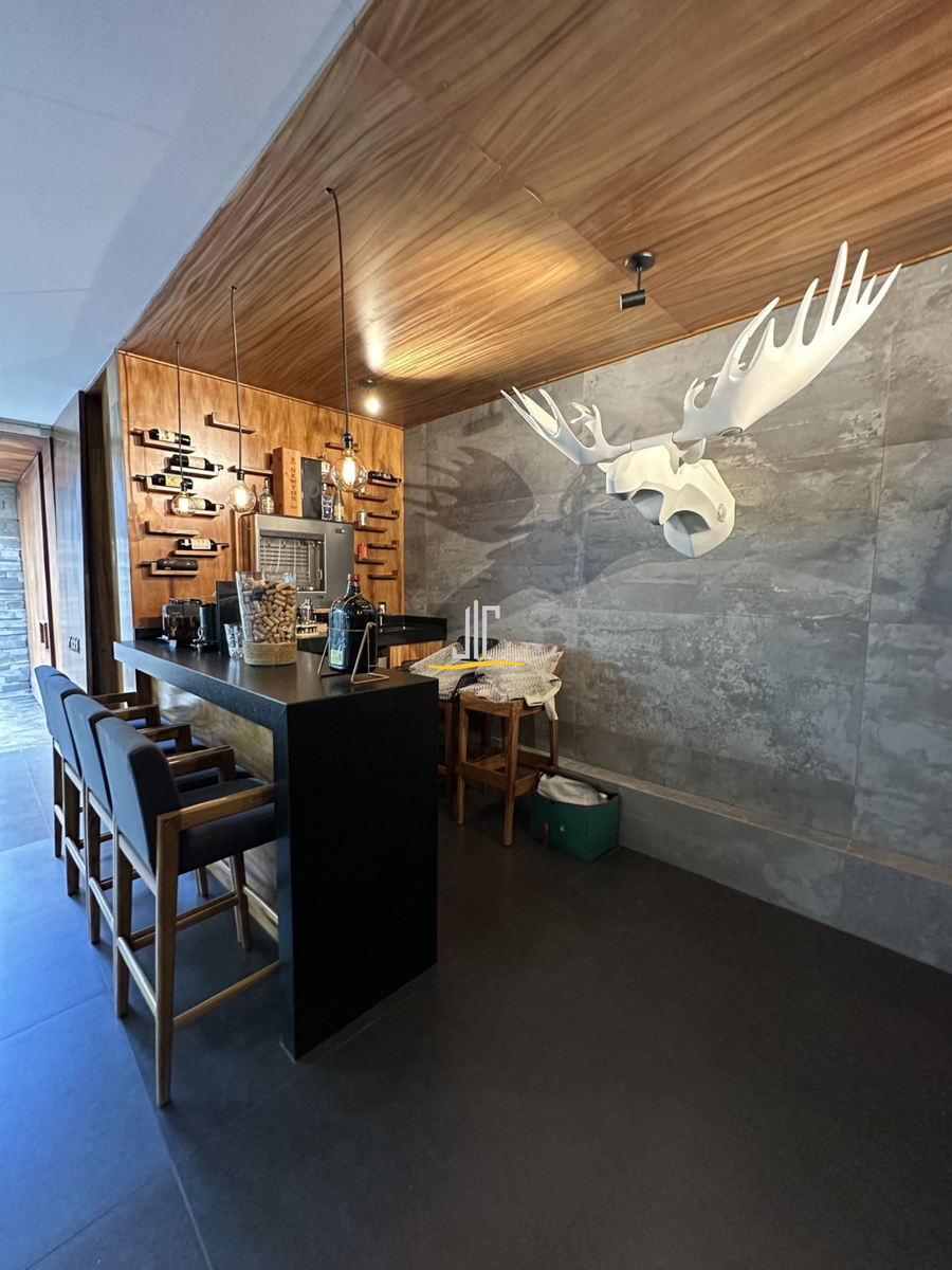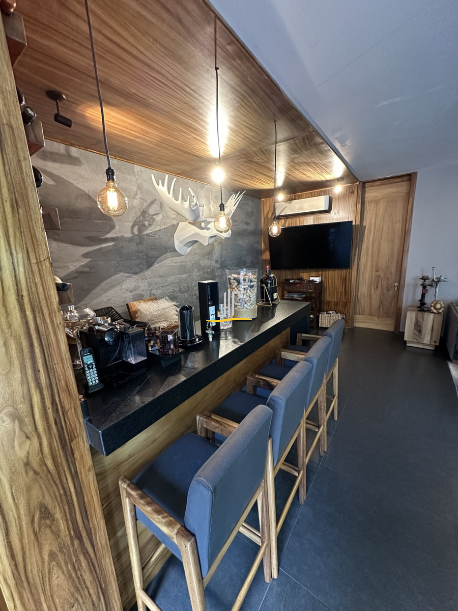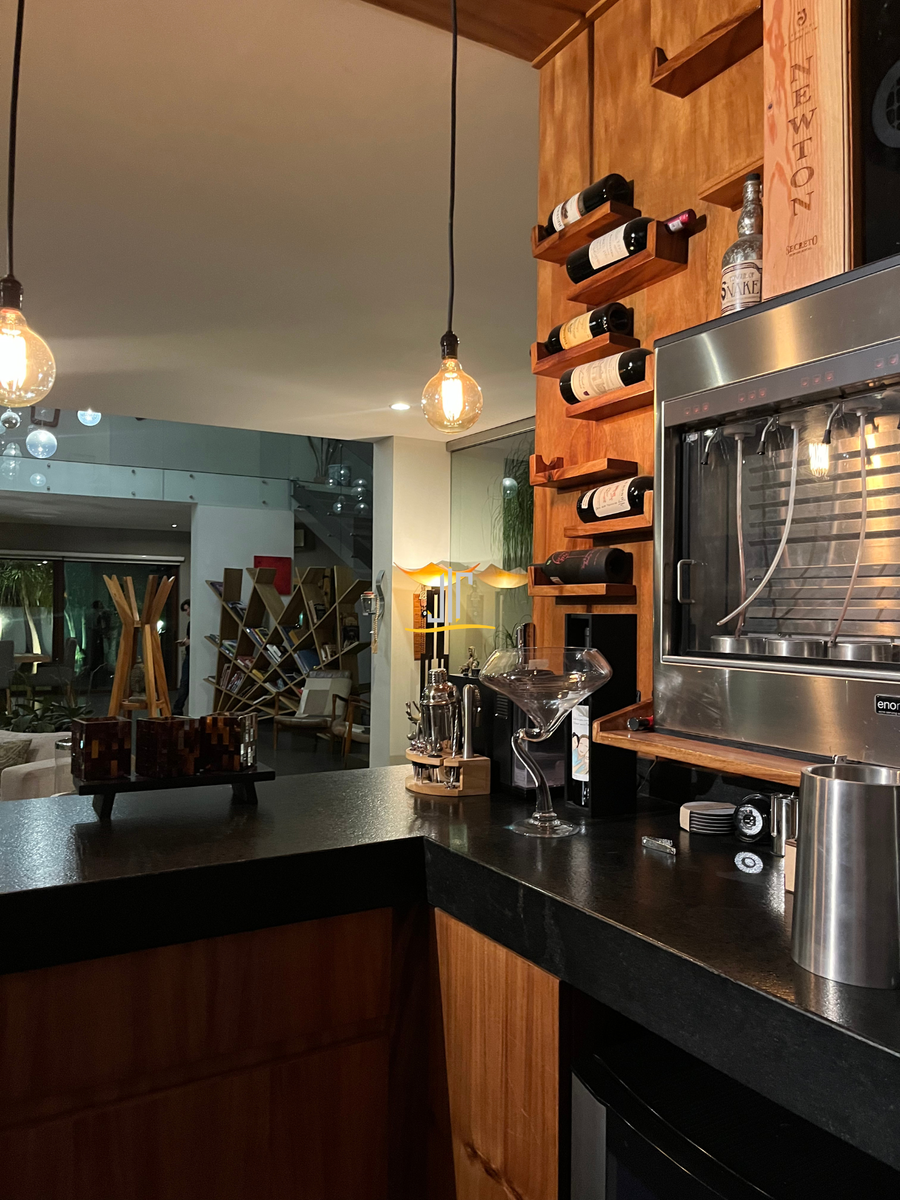 El bar integrado, fabricado en parota natural y granito negro, está pensado como un punto focal de convivencia sofisticada.