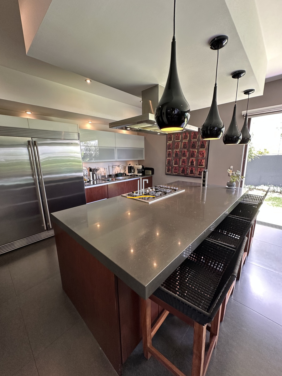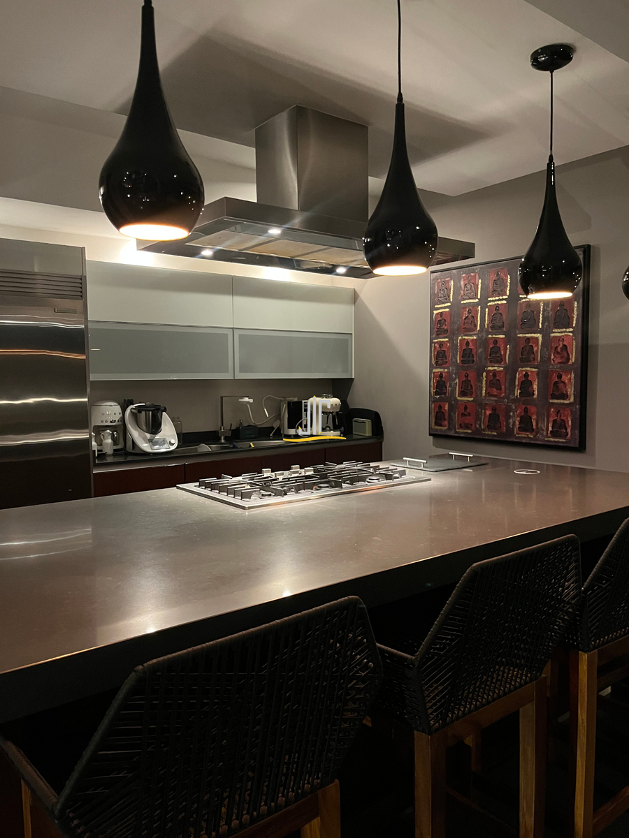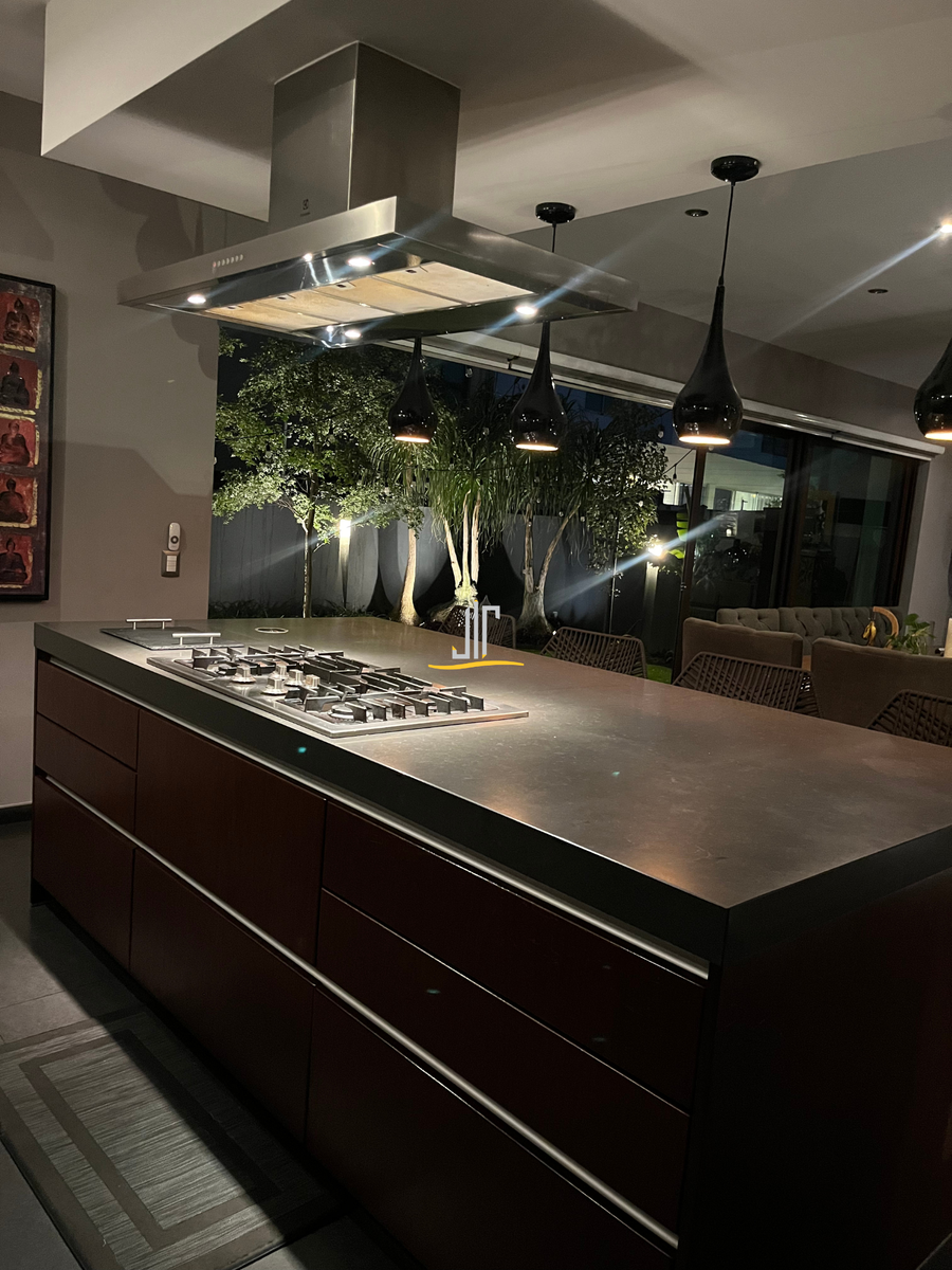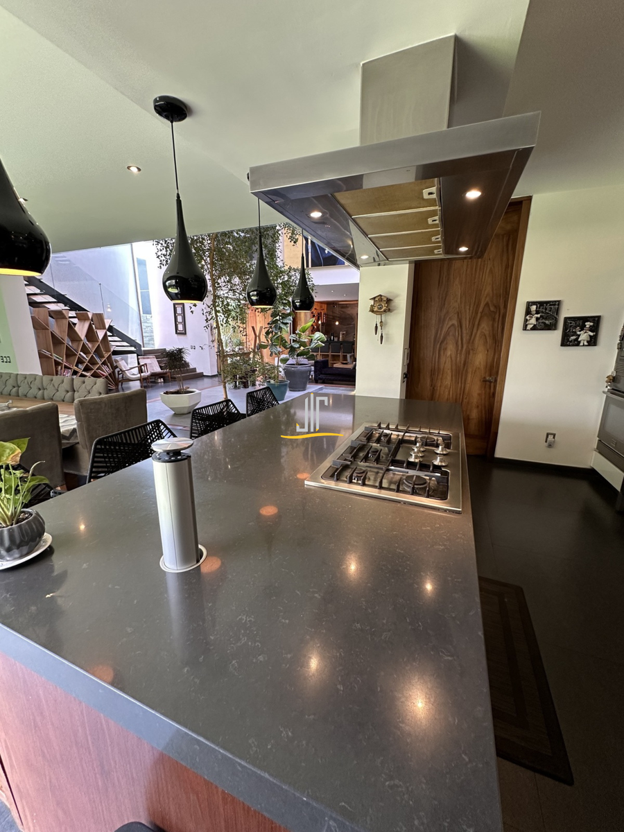 La sala-comedor a doble altura se conecta de forma fluida con un jardín zen y con una cocina de autor firmada por Quetzal®️, equipada con isla central, electrodomésticos empotrados y alacena de gran formato.
