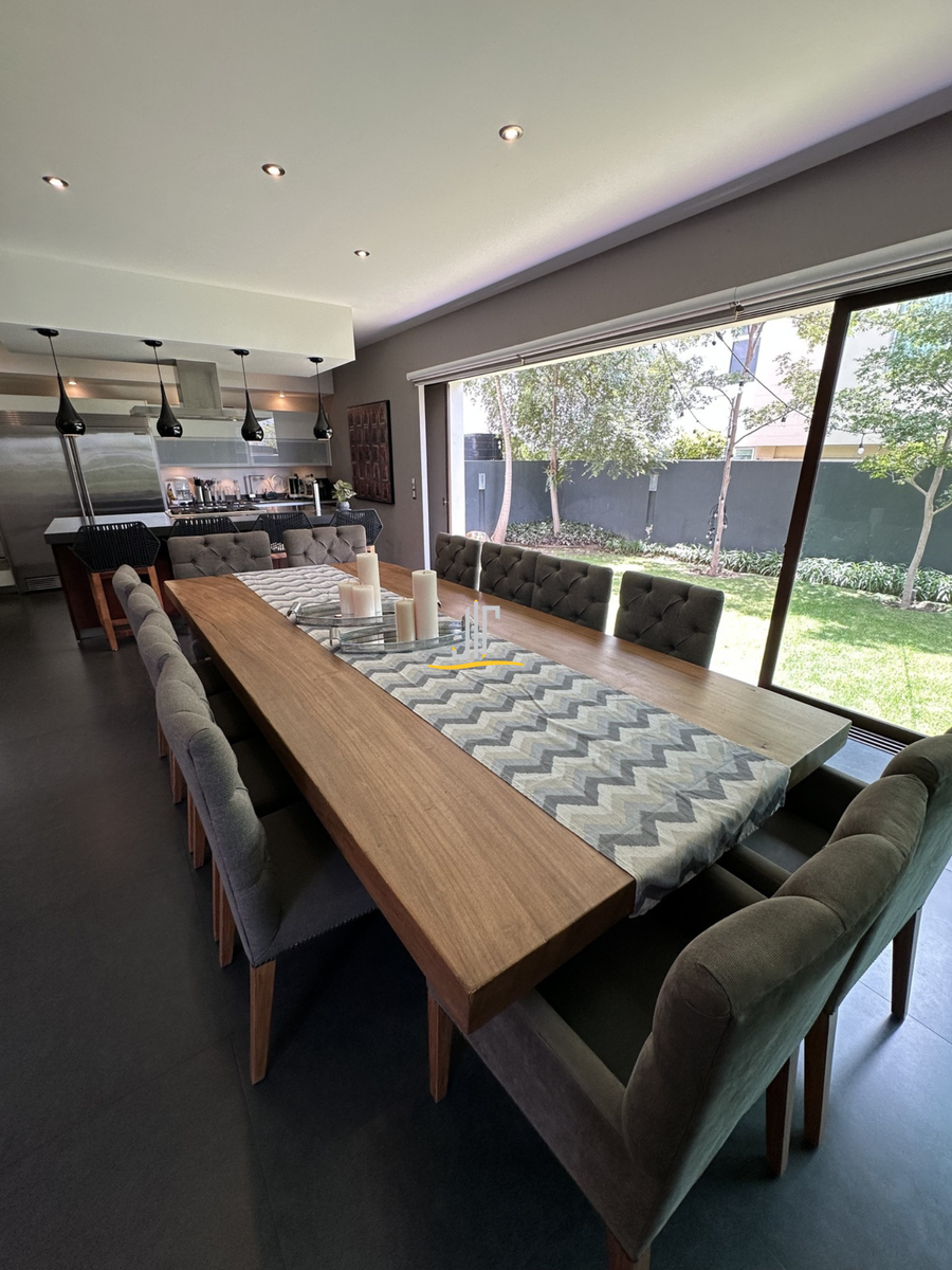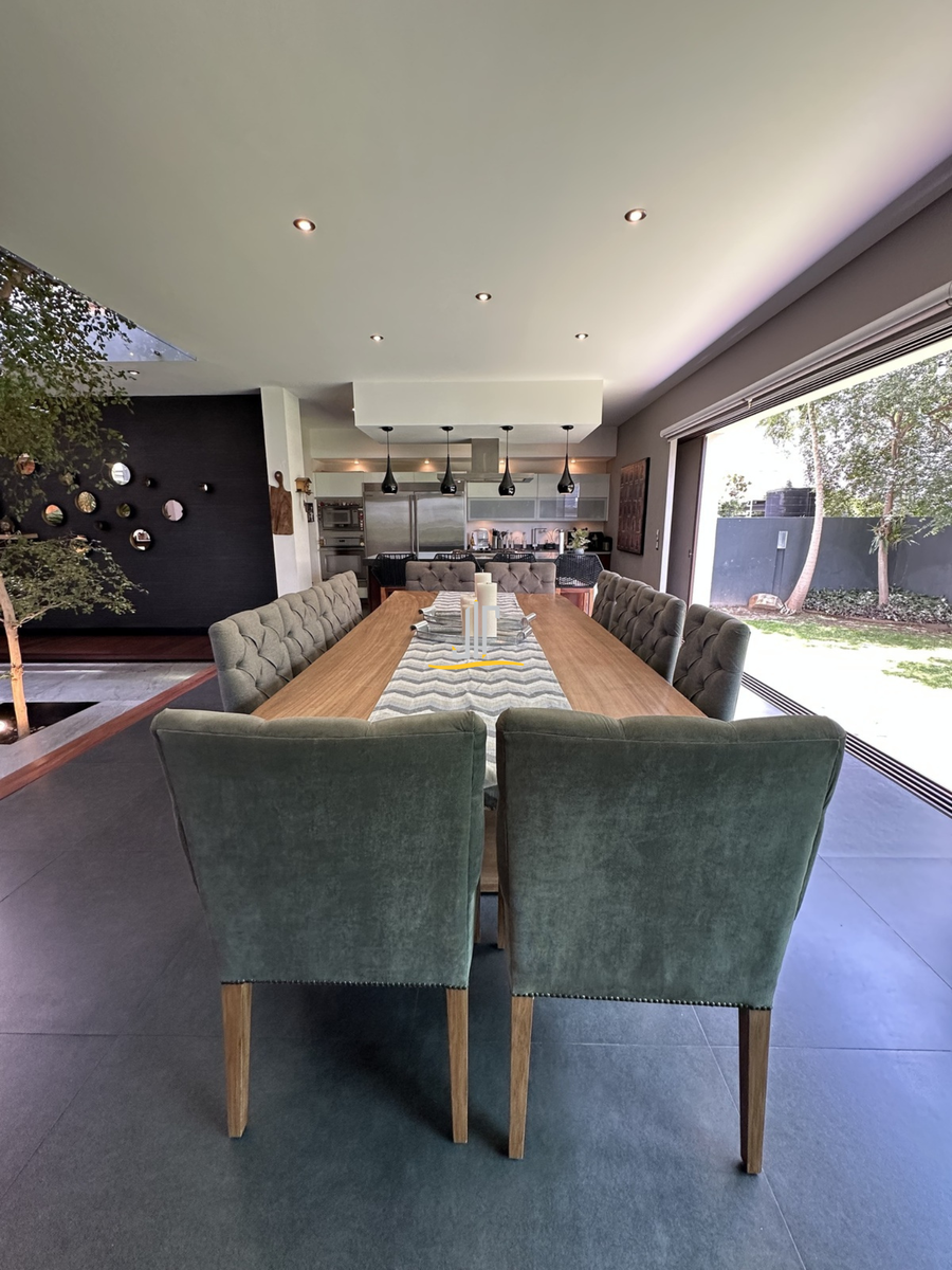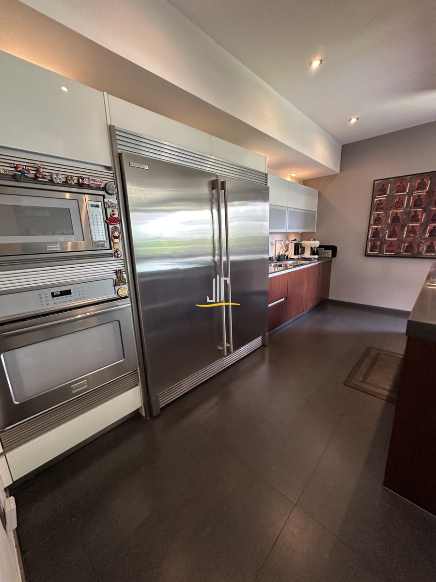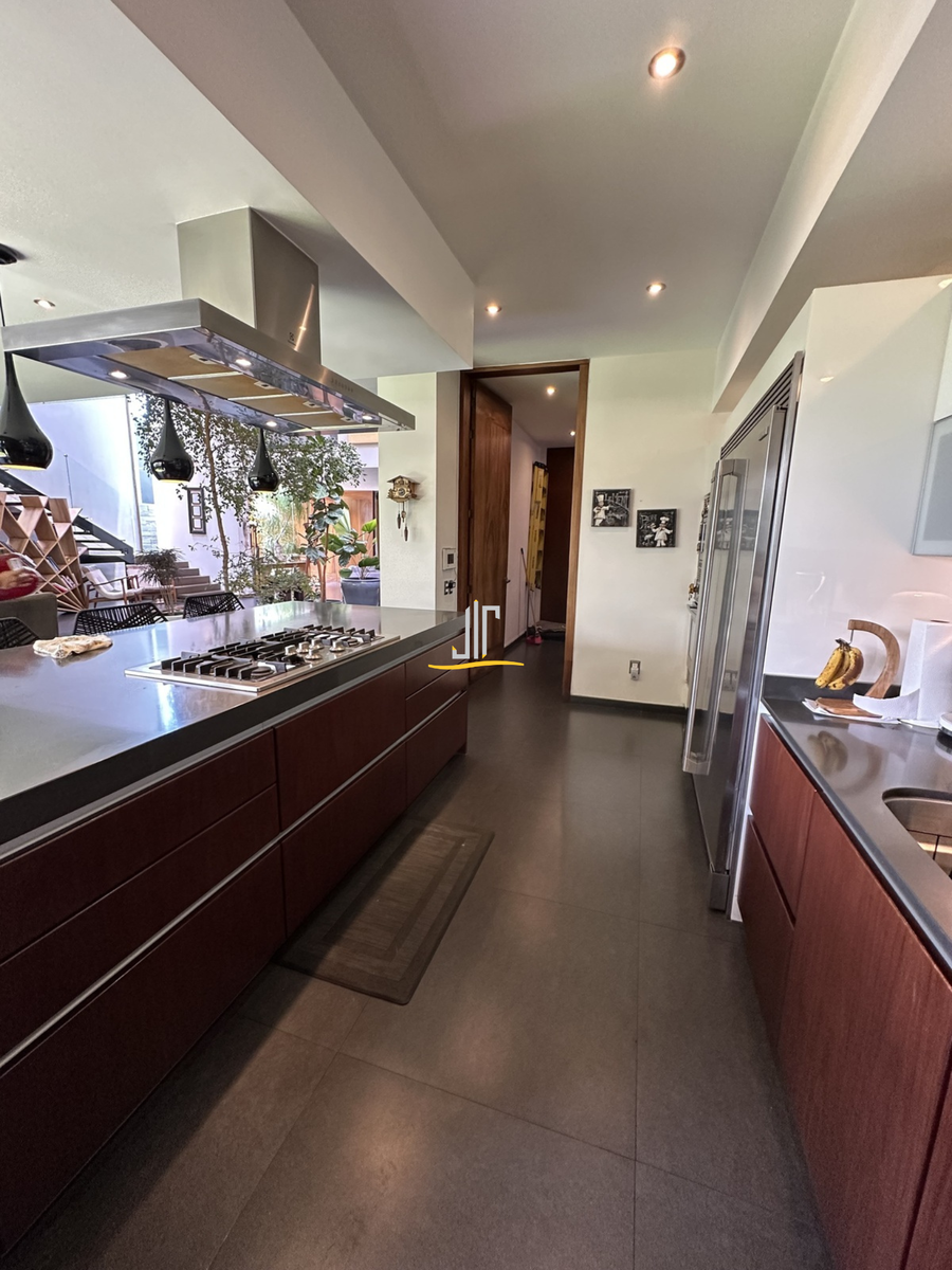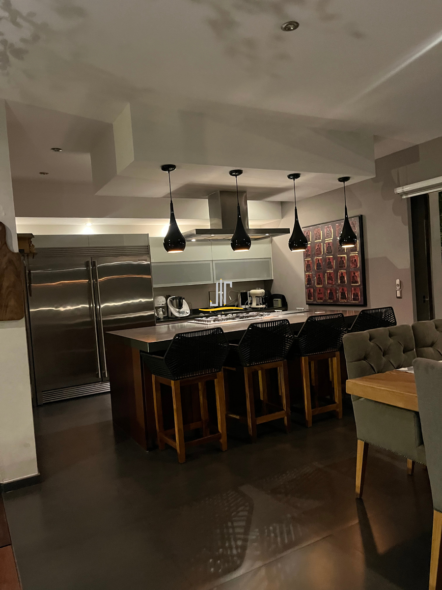 La sala-comedor a doble altura se conecta de forma fluida con un jardín zen y con una cocina de autor firmada por Quetzal®️, equipada con isla central, electrodomésticos empotrados y alacena de gran formato.